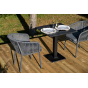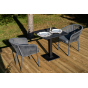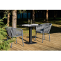 Стулья оснащены алюминиевым каркасом, которые вручную оплетены плоским роупом серого цвета.