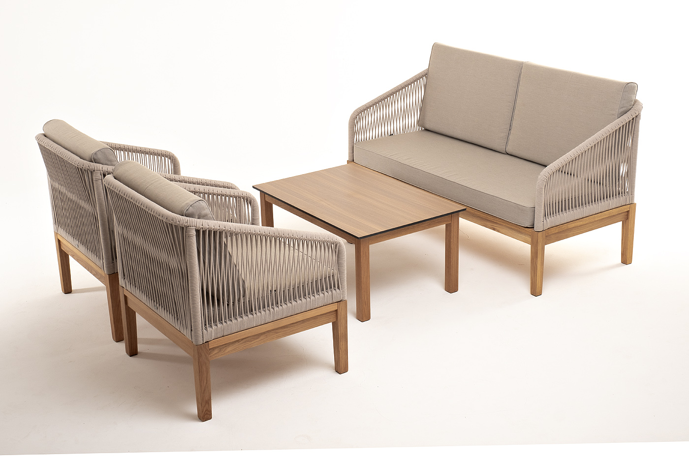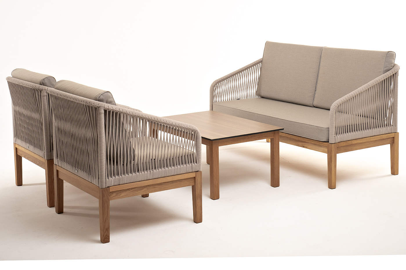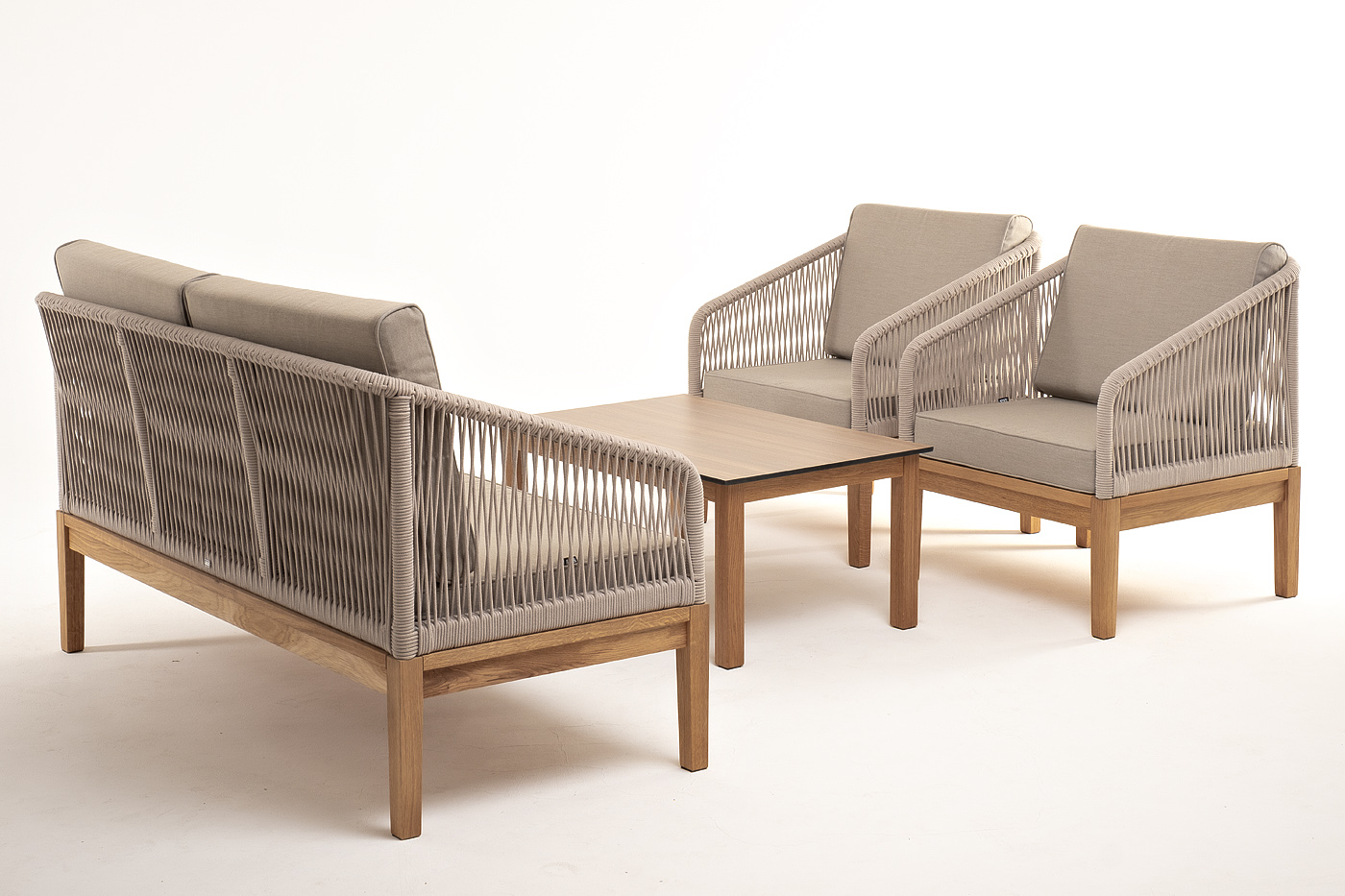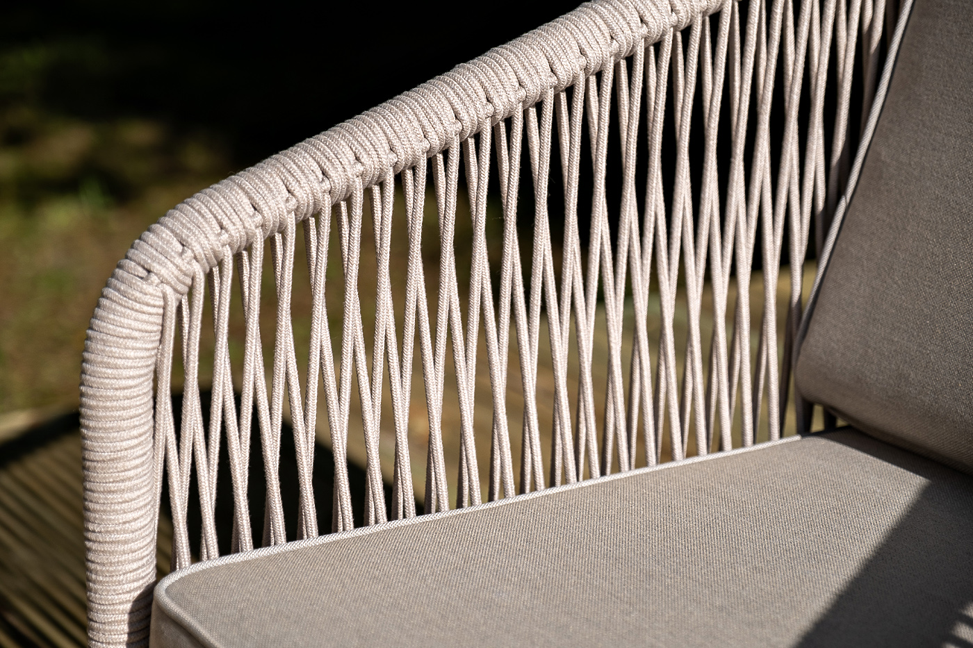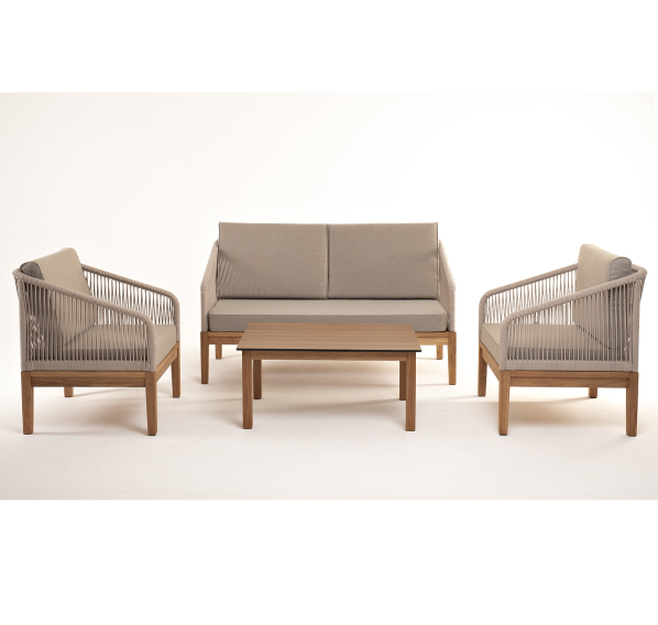 Каркас уличной мебели выполнен из дуба. Его дополняет бежевая оплетка, изготовленная на основе эластичных синтетических лент из полиэфирных волокон высокой прочности.