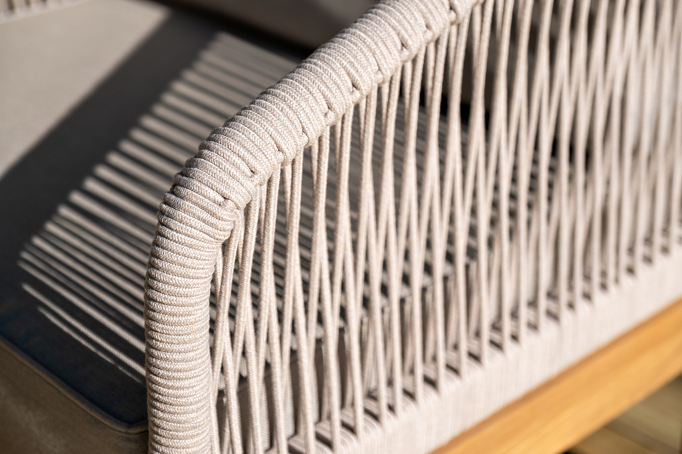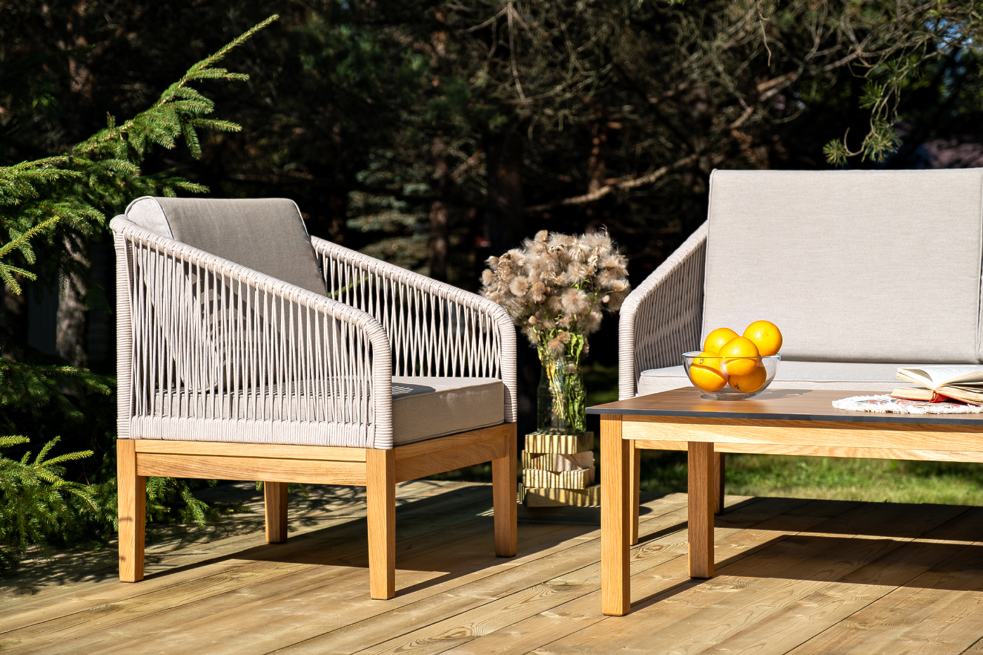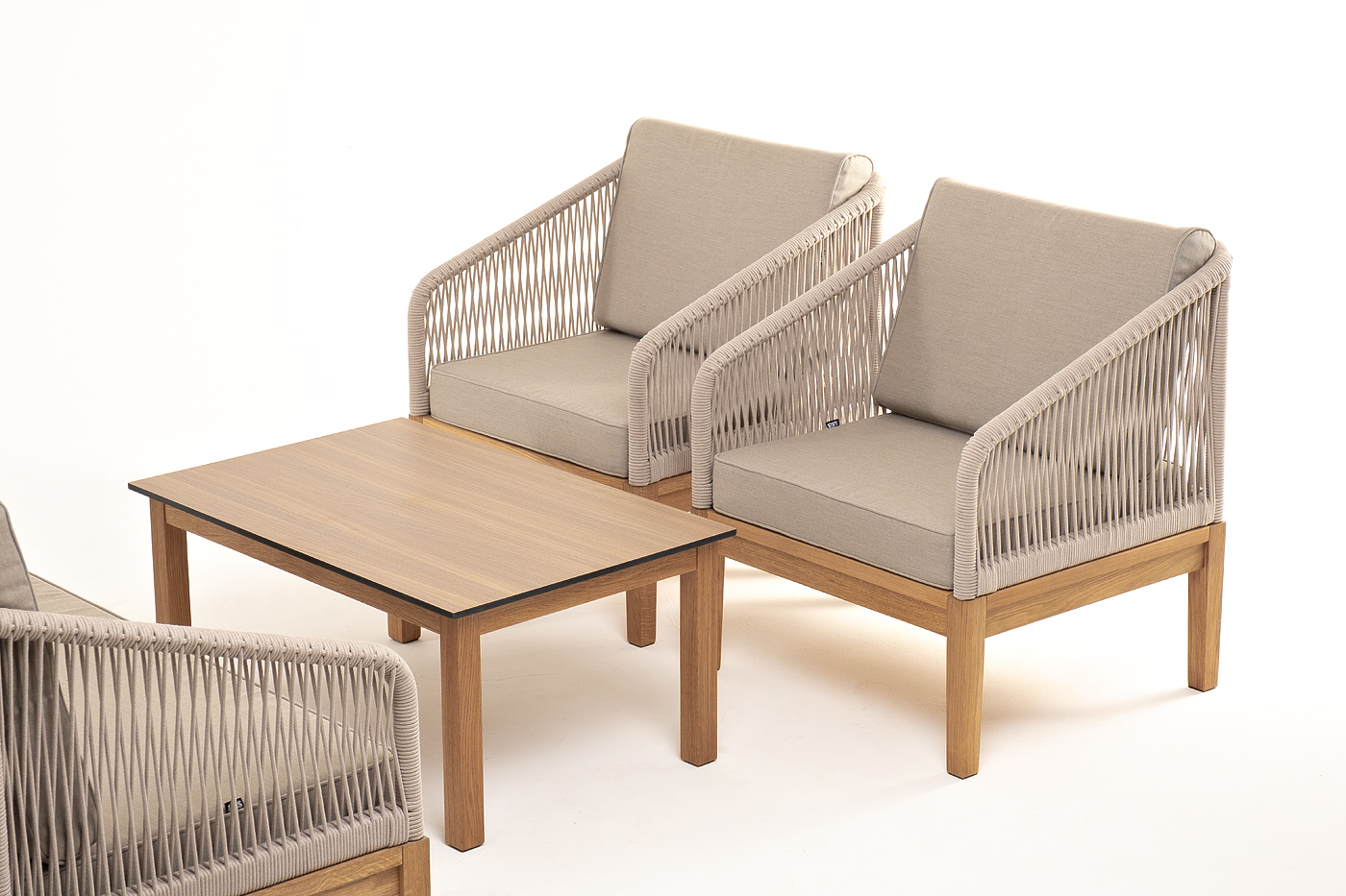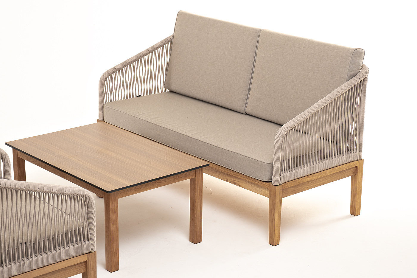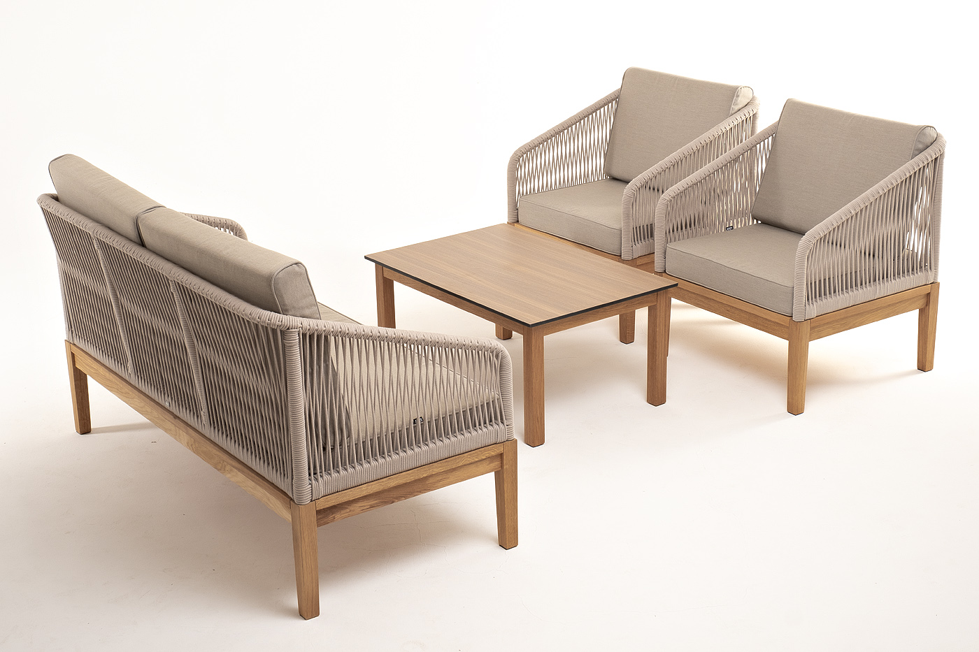 Каркас уличной мебели выполнен из дуба. Его дополняет бежевая оплетка, изготовленная на основе эластичных синтетических лент из полиэфирных волокон высокой прочности.