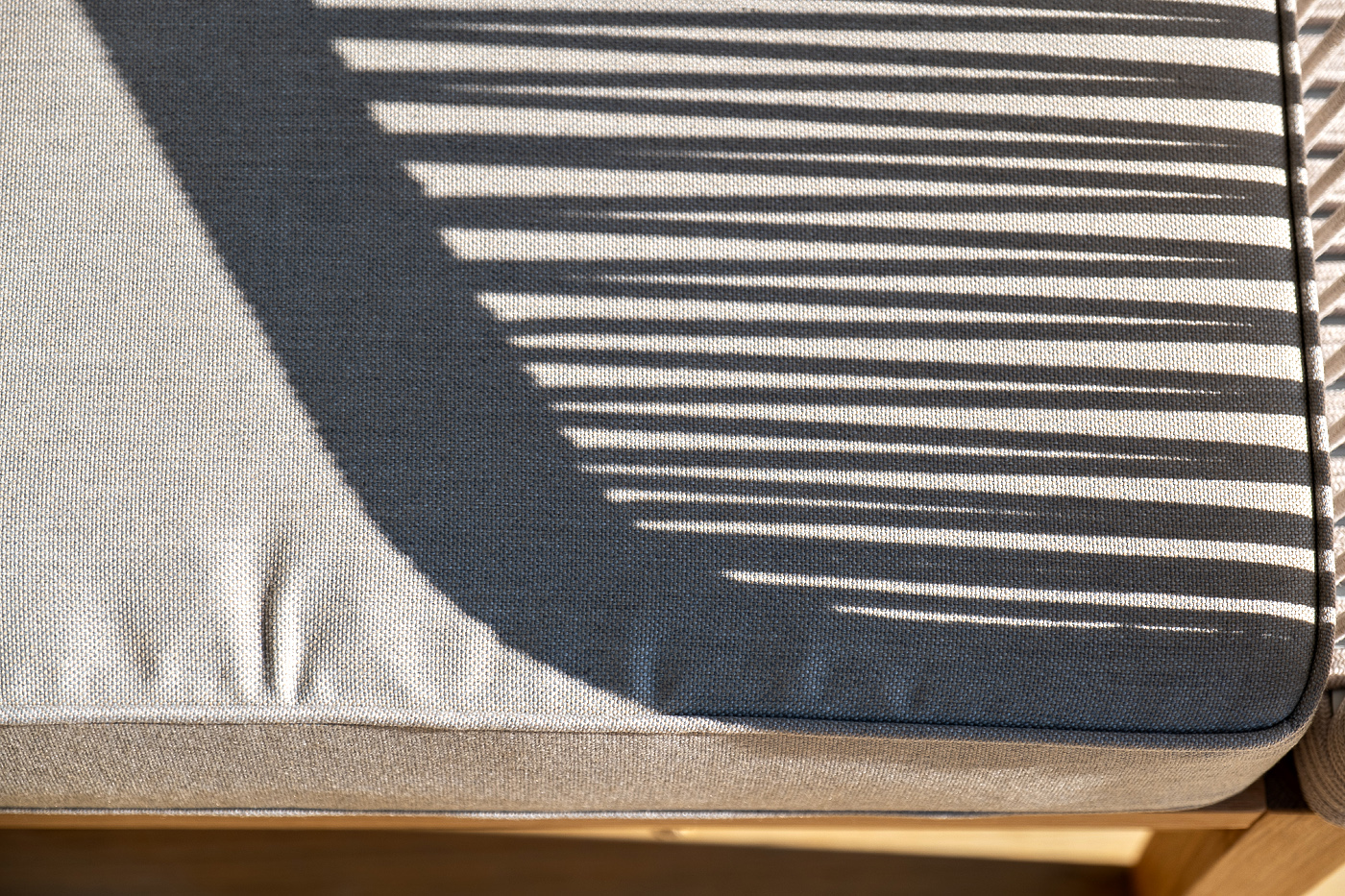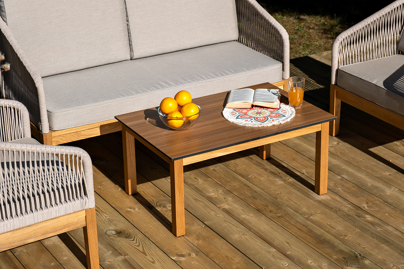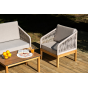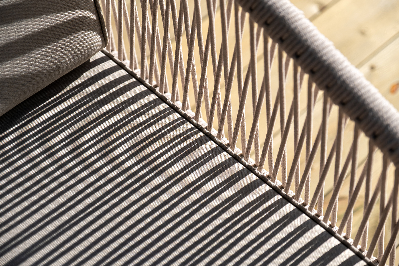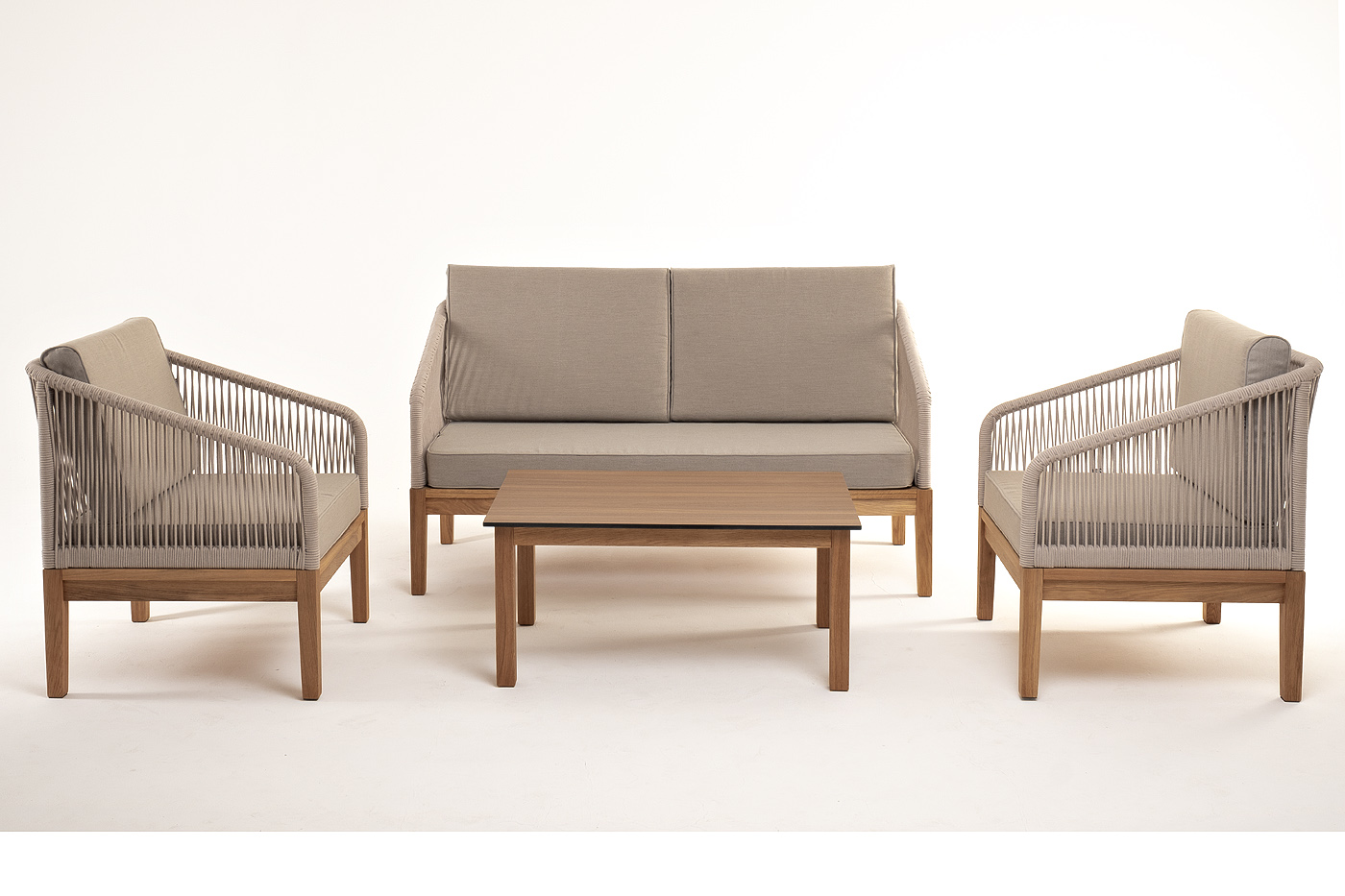 Каркас уличной мебели выполнен из дуба. Его дополняет бежевая оплетка, изготовленная на основе эластичных синтетических лент из полиэфирных волокон высокой прочности.