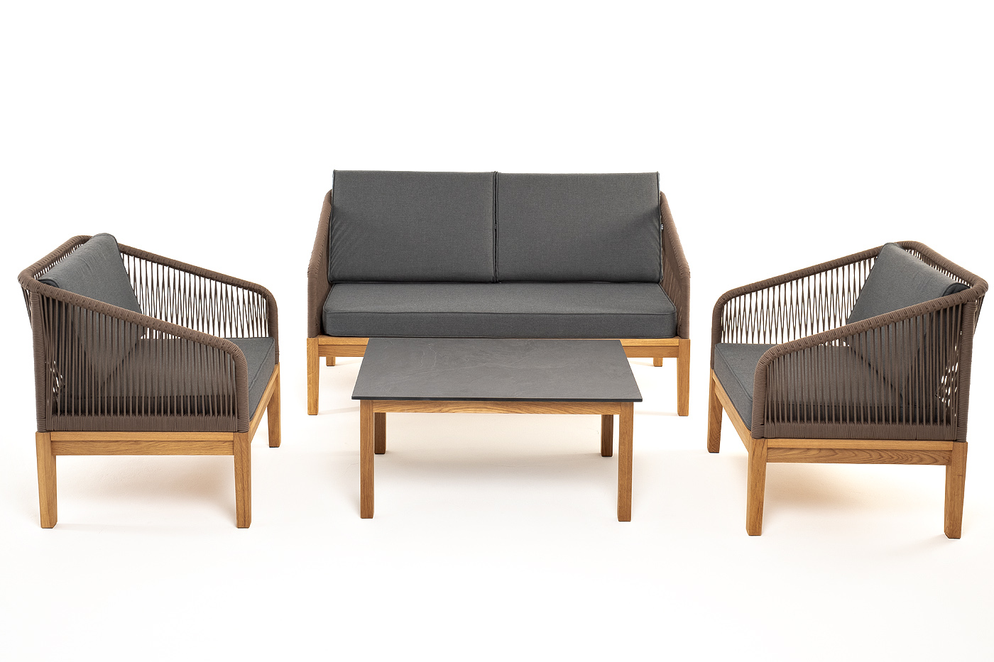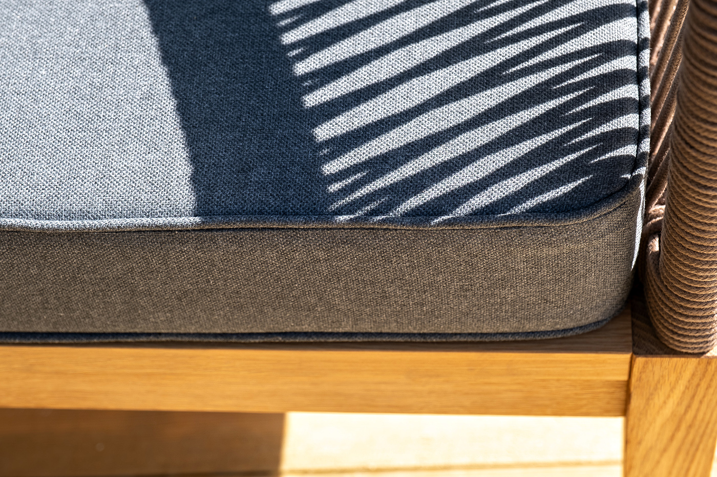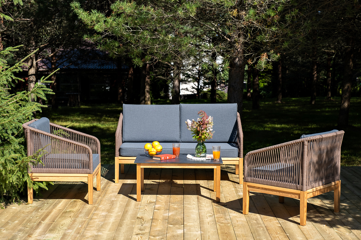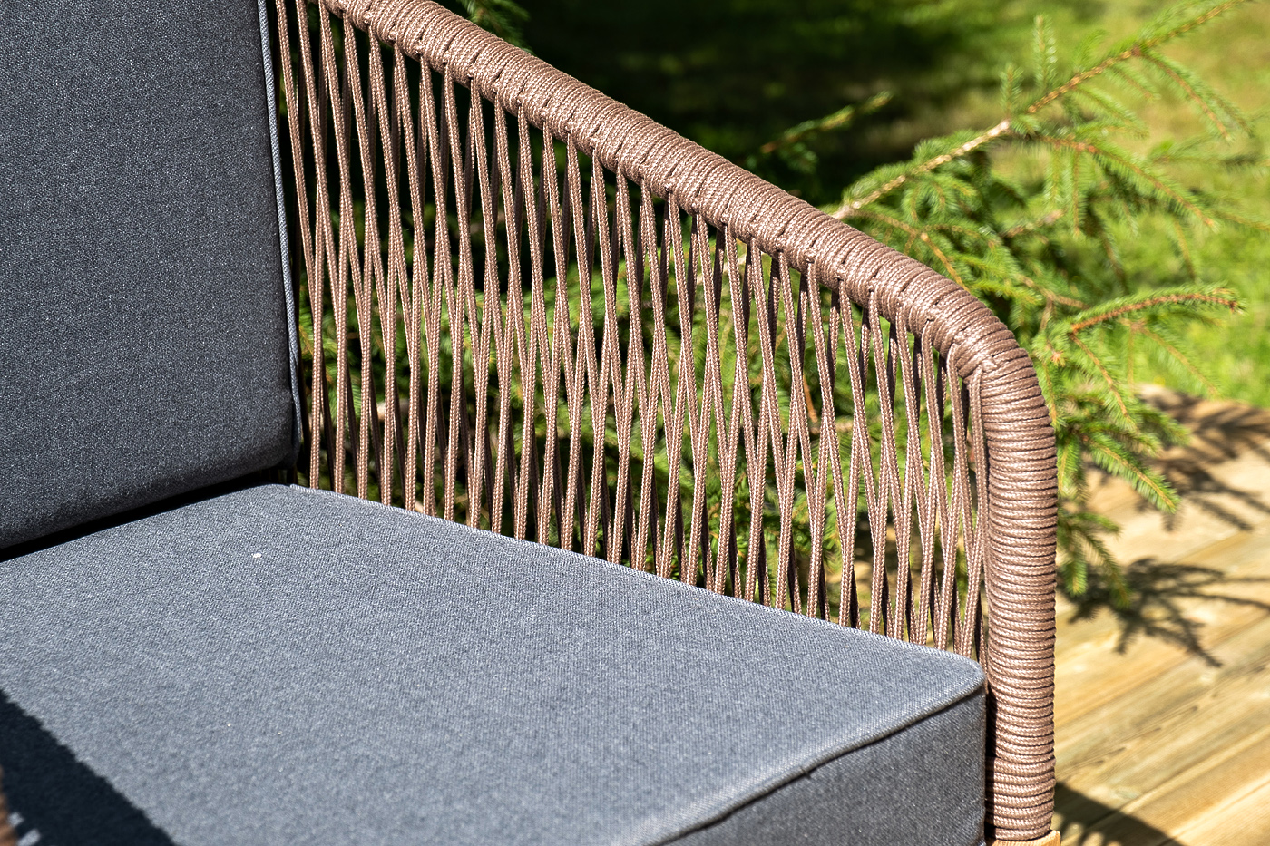 Каркас уличной мебели выполнен из дуба. Его дополняет коричневая оплетка, изготовленная на основе эластичных синтетических лент из полиэфирных волокон высокой прочности.