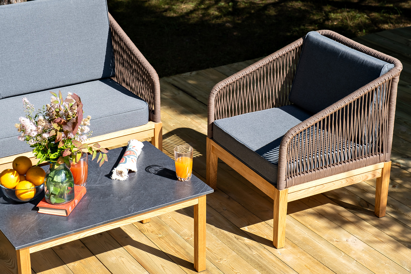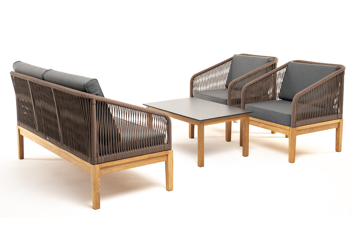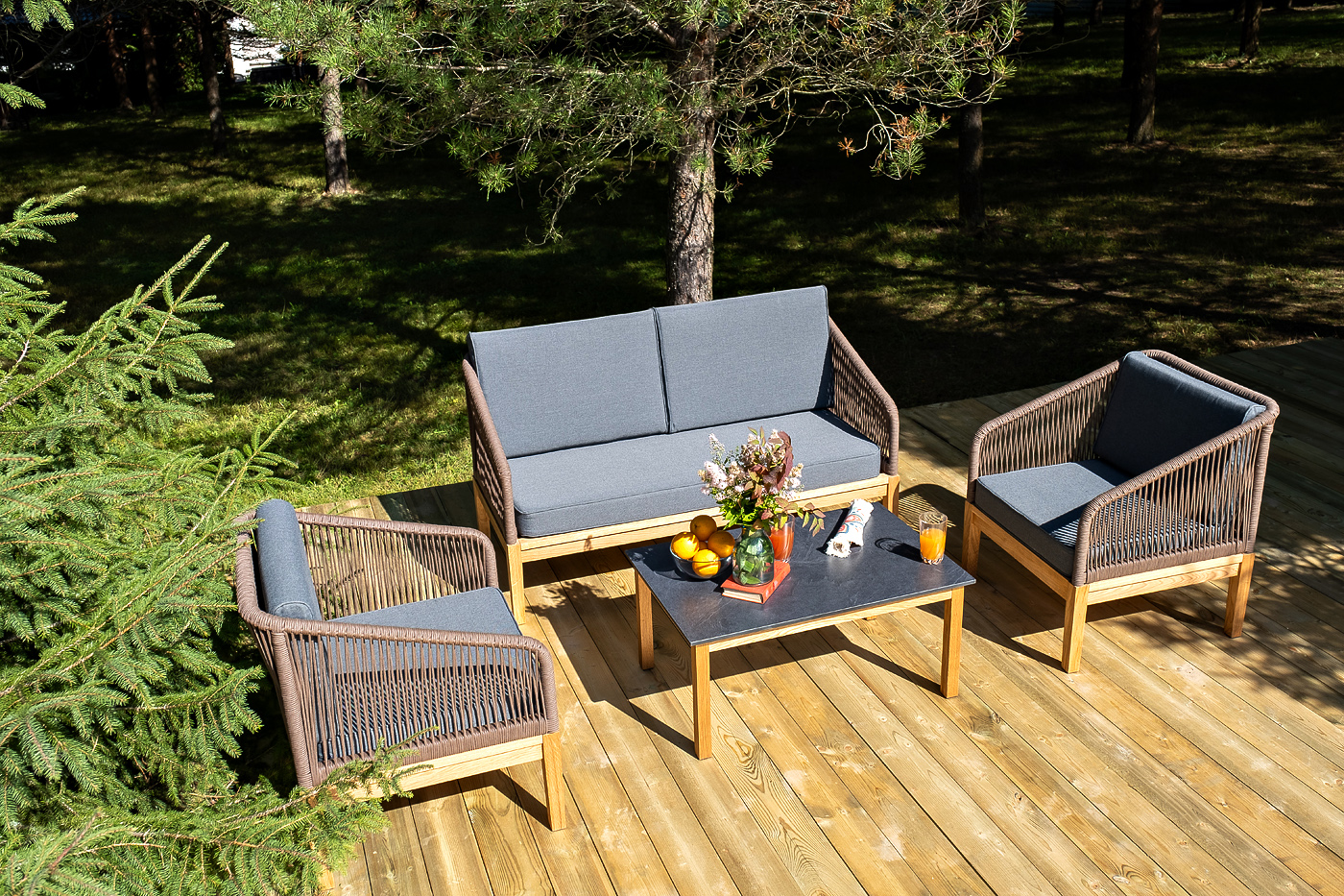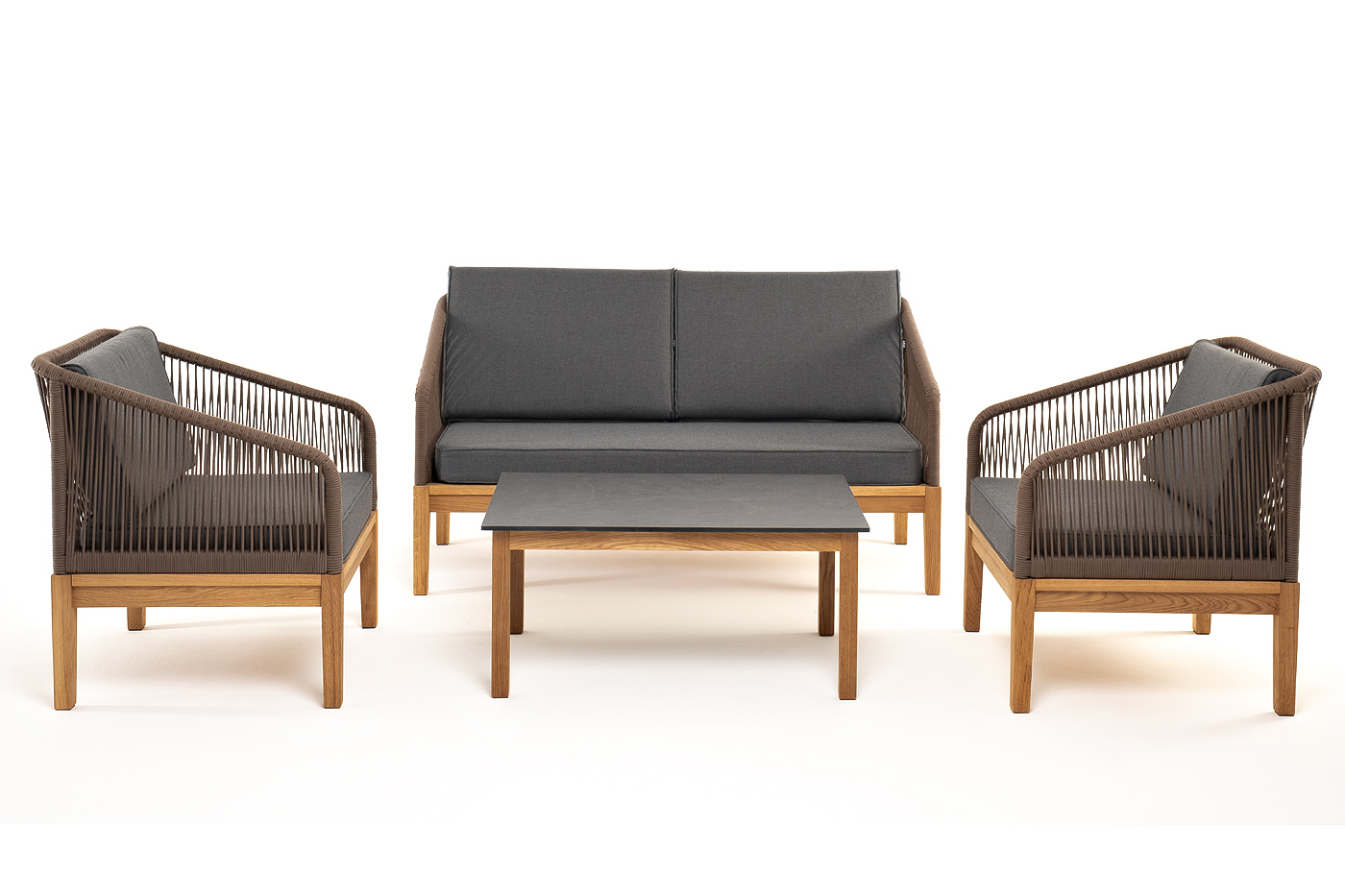 Каркас уличной мебели выполнен из дуба. Его дополняет коричневая оплетка, изготовленная на основе эластичных синтетических лент из полиэфирных волокон высокой прочности.
