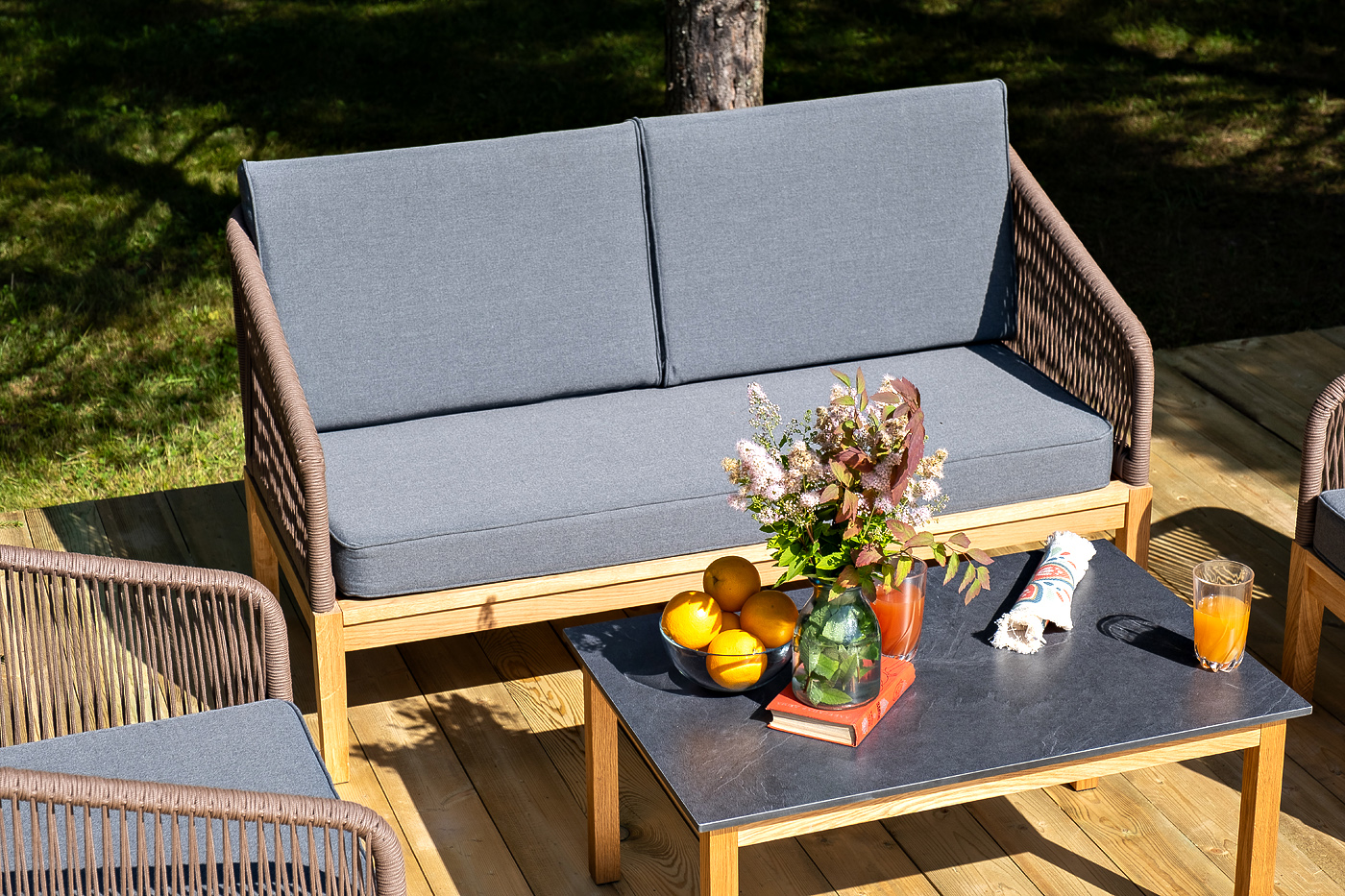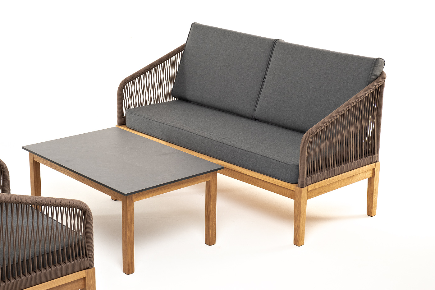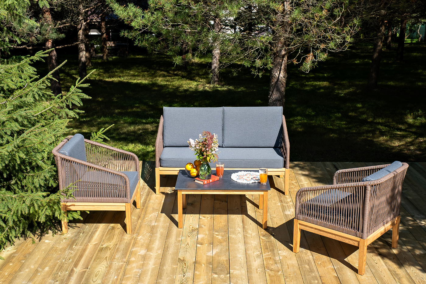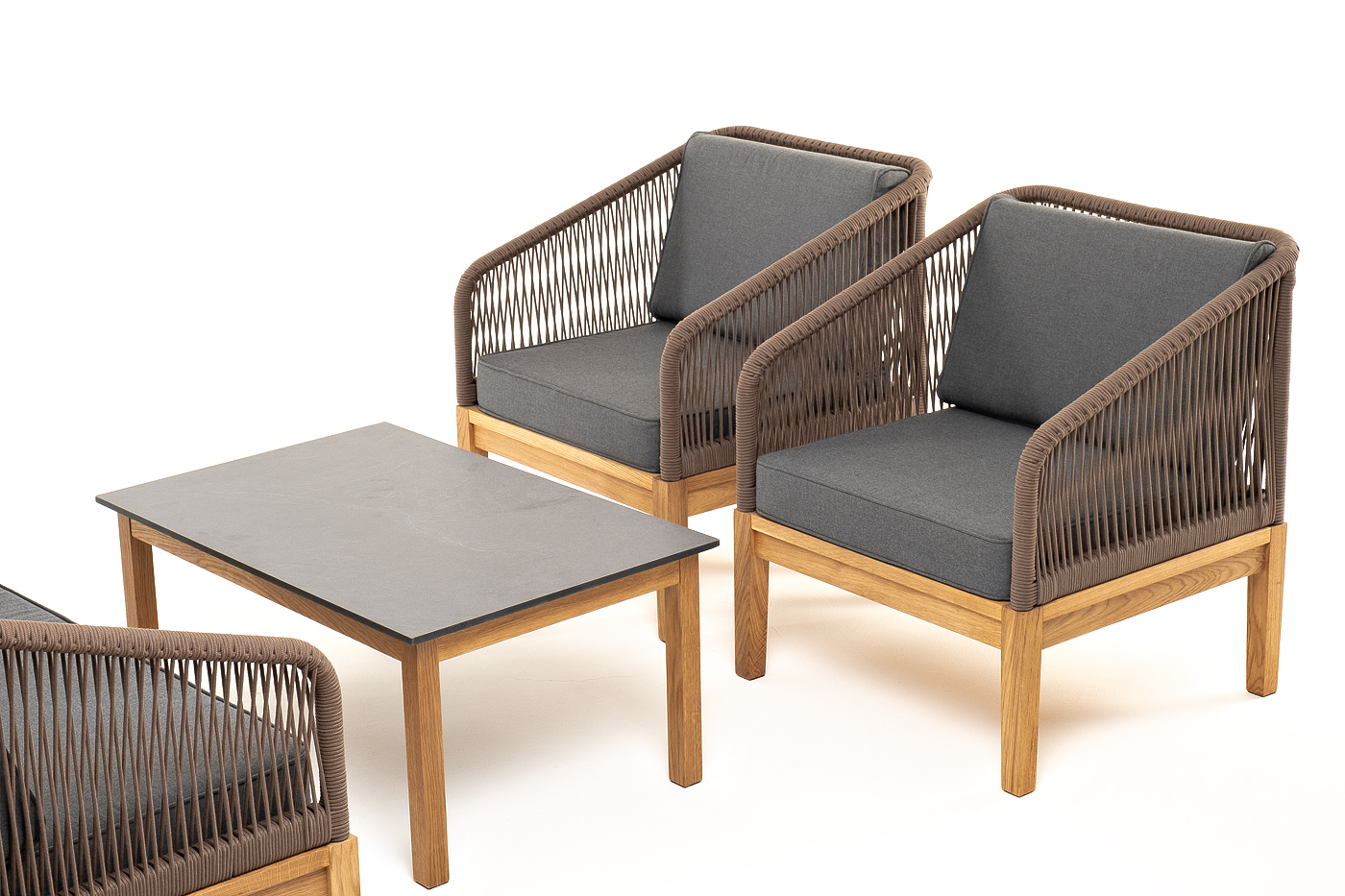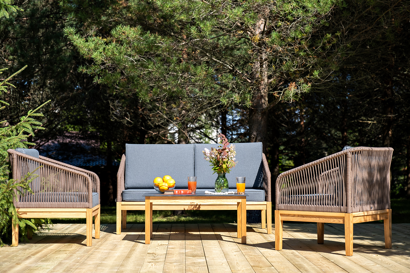 Каркас уличной мебели выполнен из дуба. Его дополняет коричневая оплетка, изготовленная на основе эластичных синтетических лент из полиэфирных волокон высокой прочности.