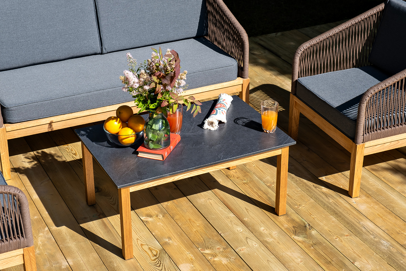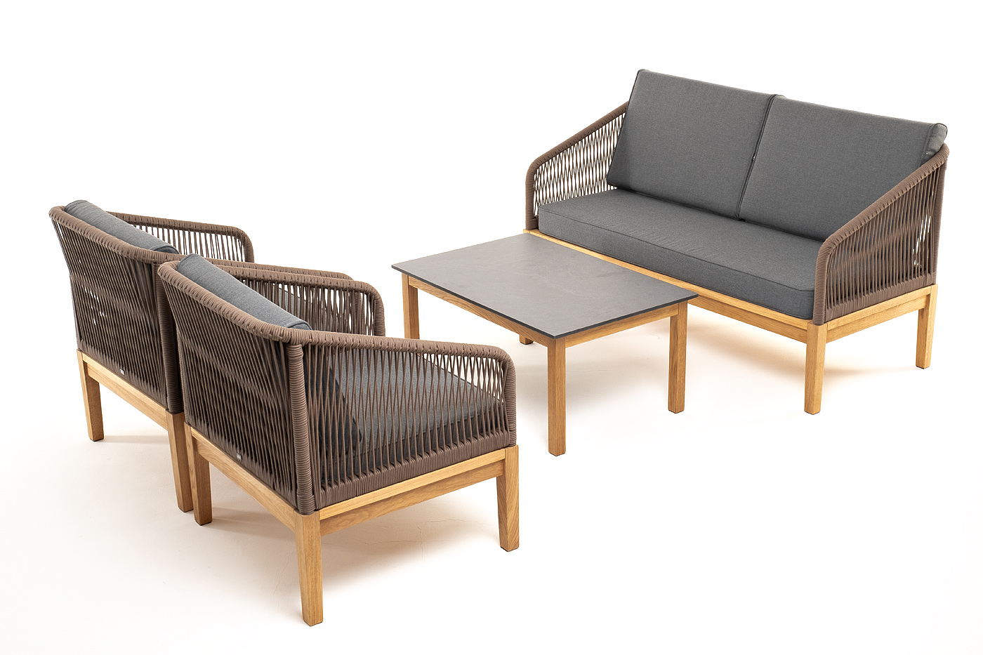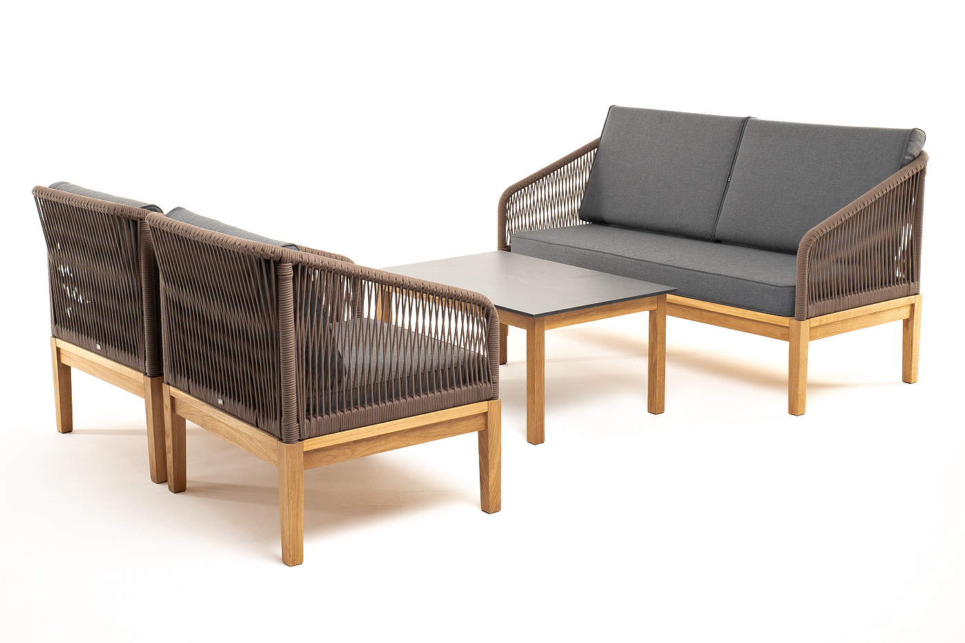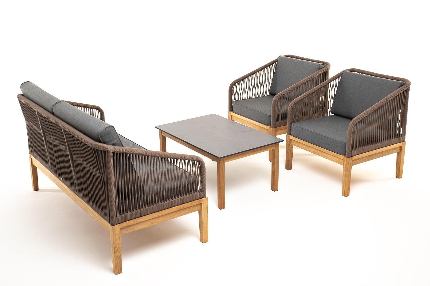 Каркас уличной мебели выполнен из дуба. Его дополняет коричневая оплетка, изготовленная на основе эластичных синтетических лент из полиэфирных волокон высокой прочности.