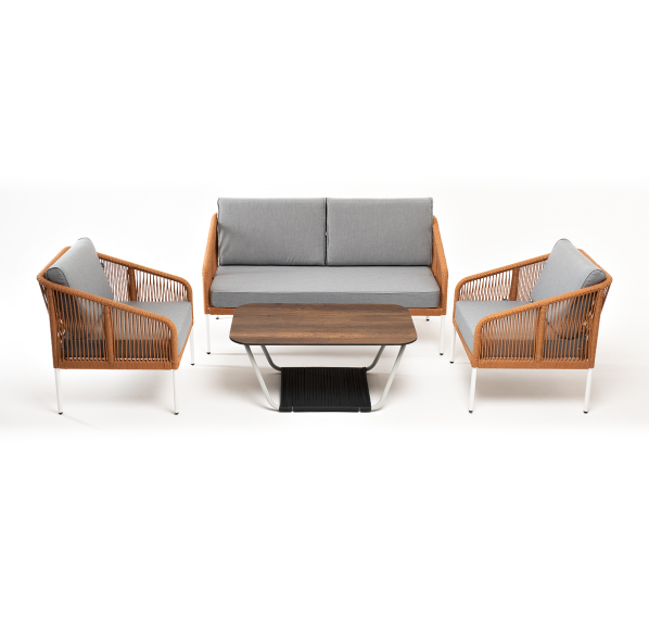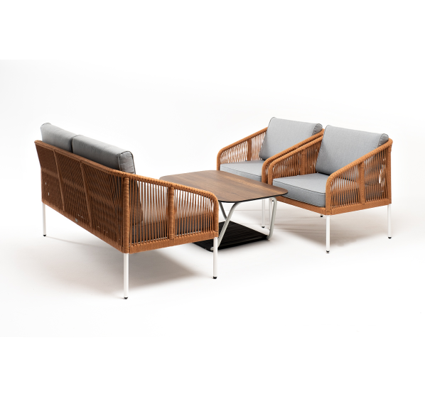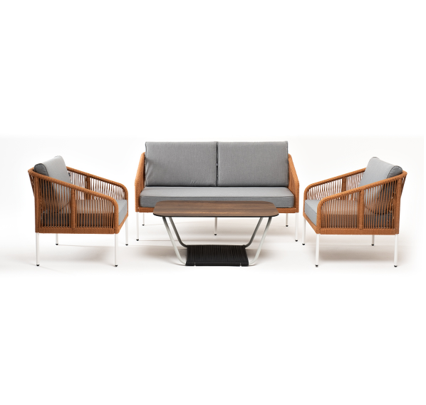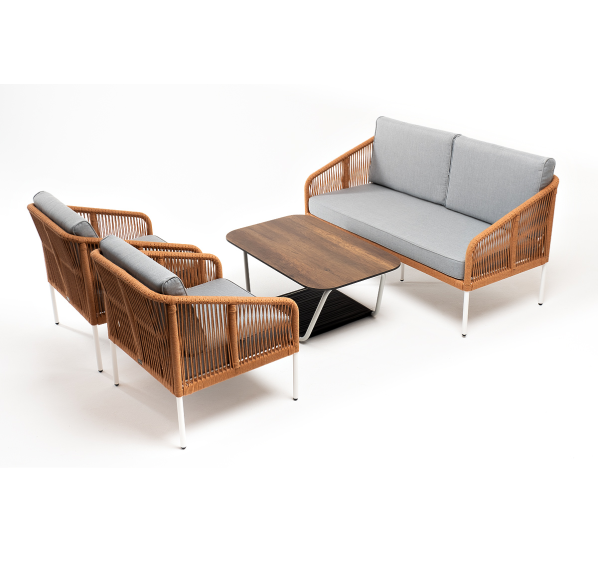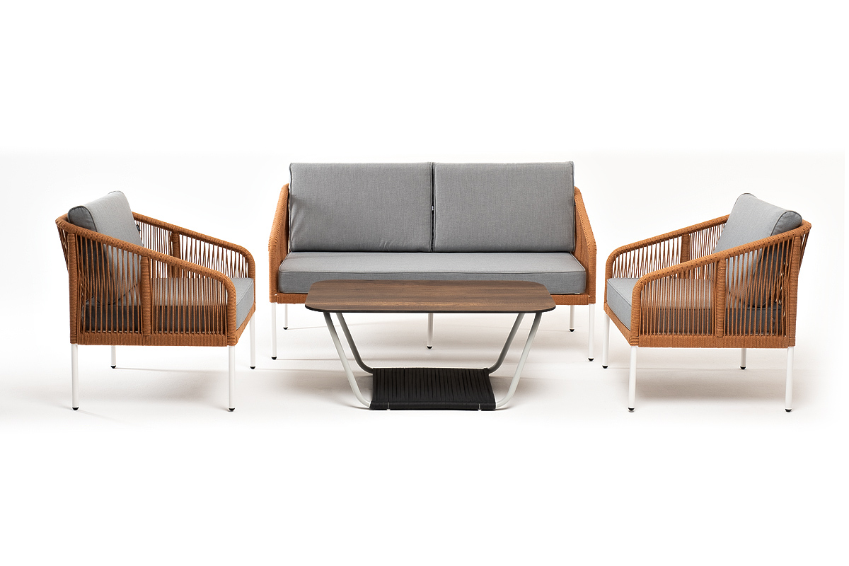Каркас уличной мебели выполнен из алюминия. Его дополняет оплетка цвета оранжевый меланж, изготовленная на основе эластичных синтетических лент из полиэфирных волокон высокой прочности.