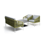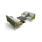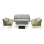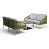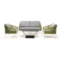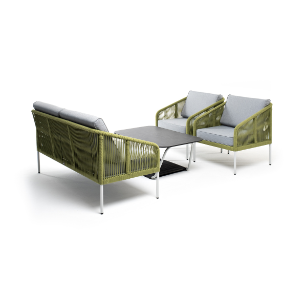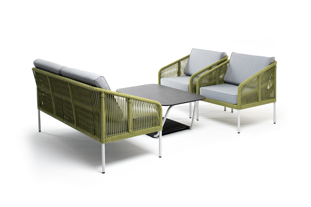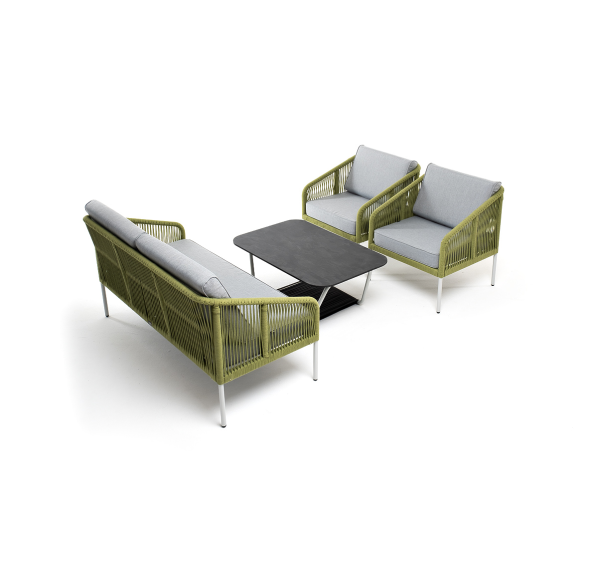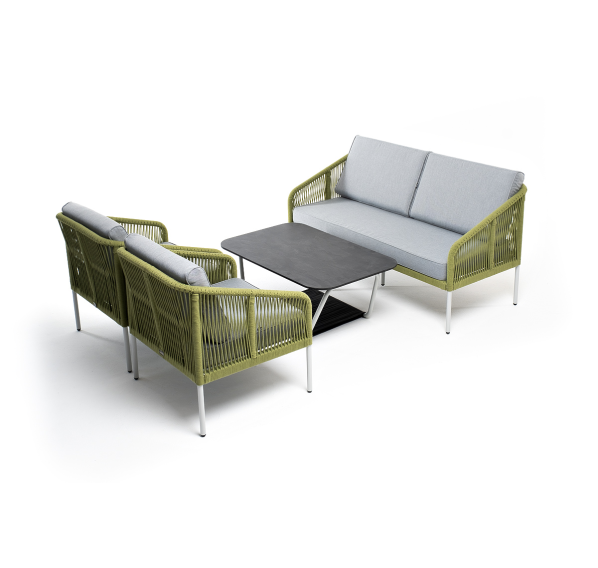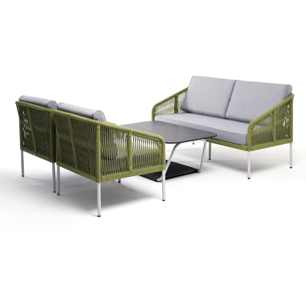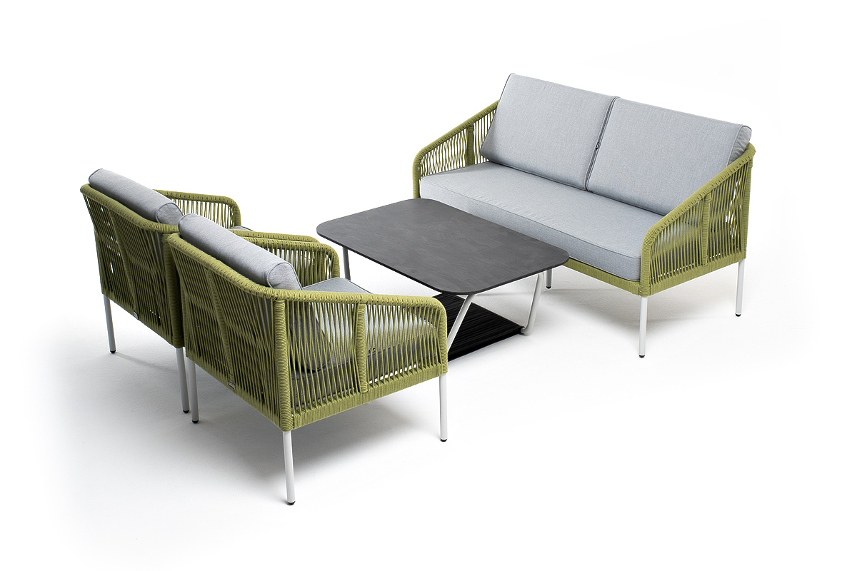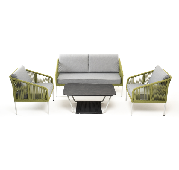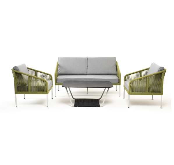 Каркас уличной мебели выполнен из алюминия. Его дополняет оплетка - салатовый меланж, изготовленная на основе эластичных синтетических лент из полиэфирных волокон высокой прочности.