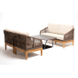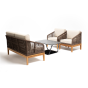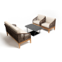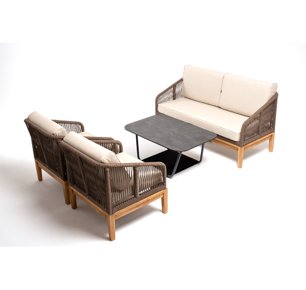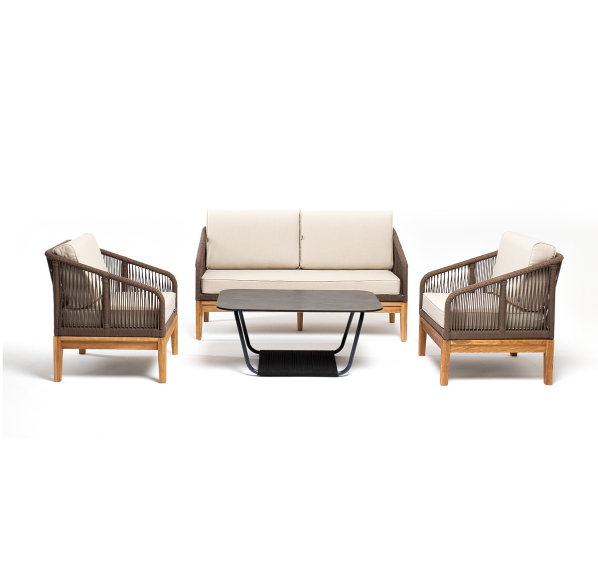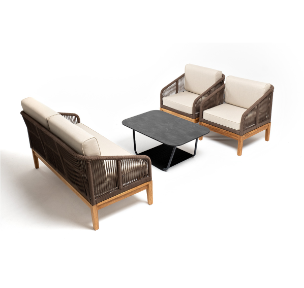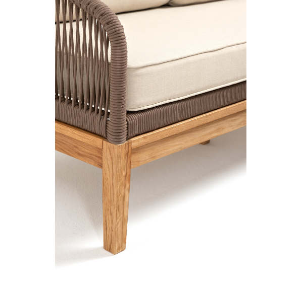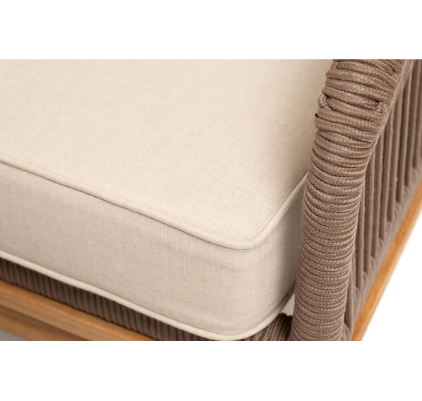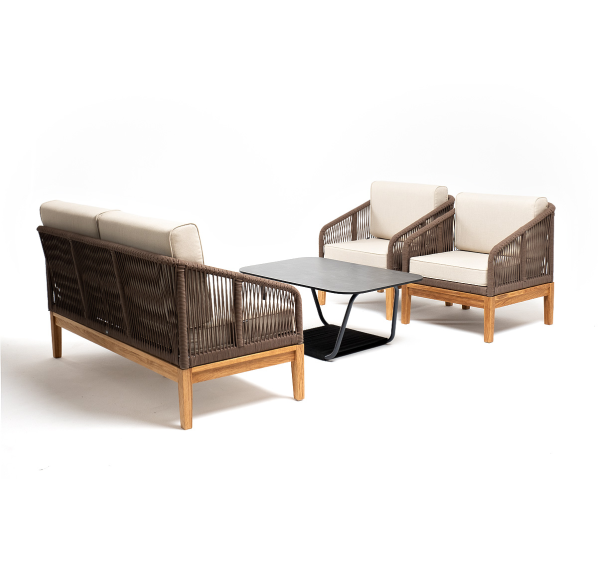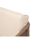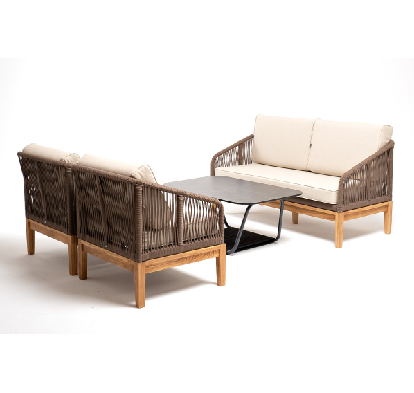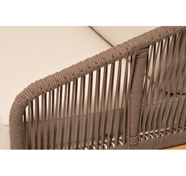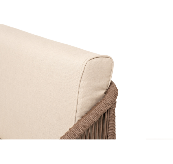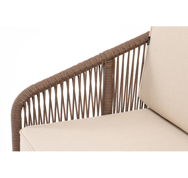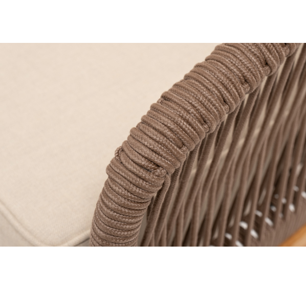 Каркас уличной мебели выполнен из дуба. Его дополняет коричневая оплетка, изготовленная на основе эластичных синтетических лент из полиэфирных волокон высокой прочности.