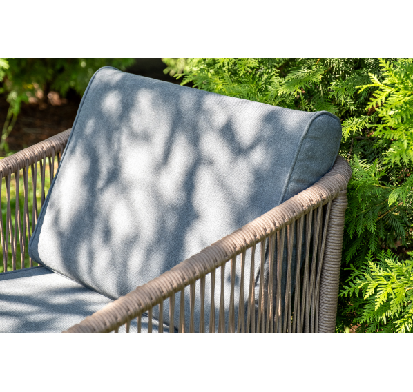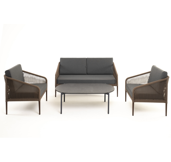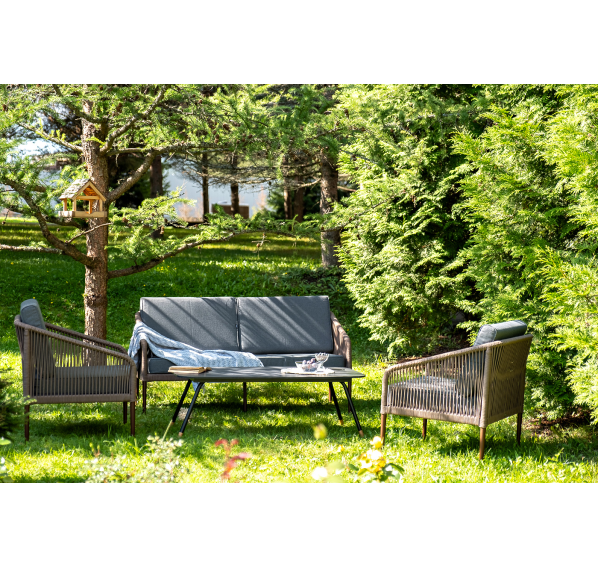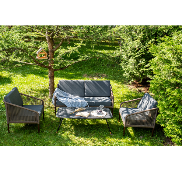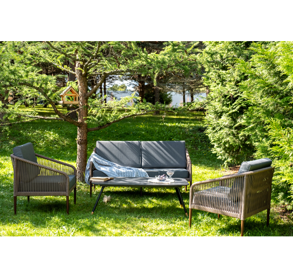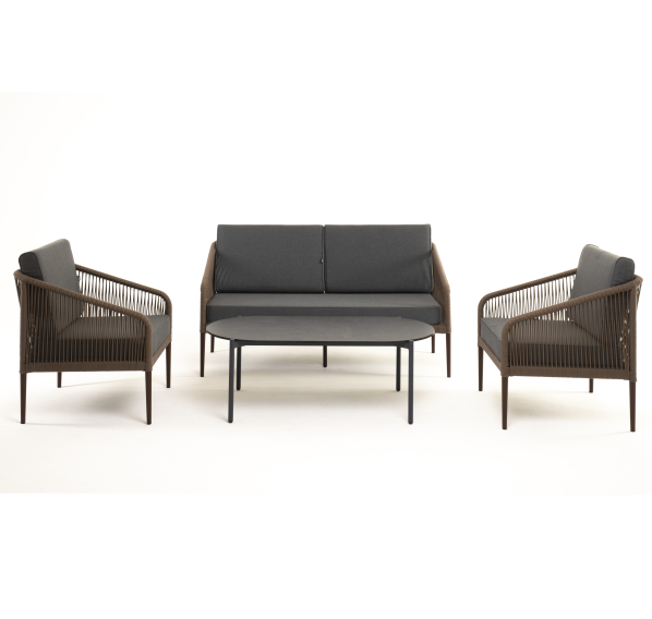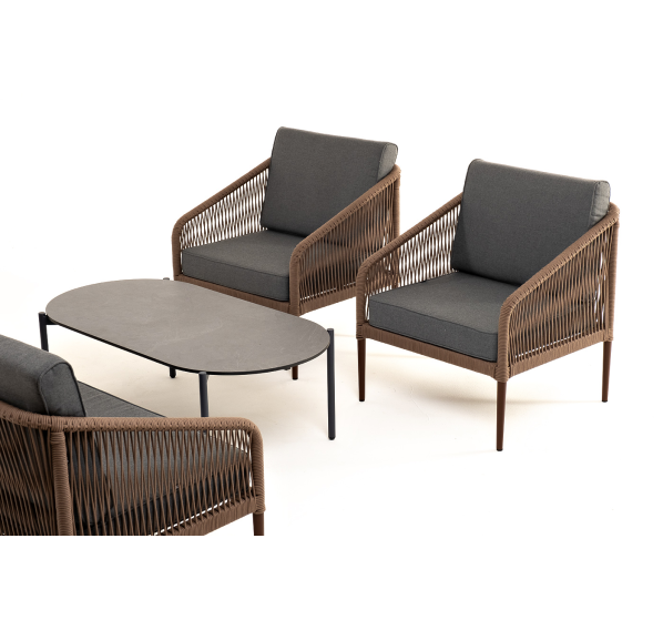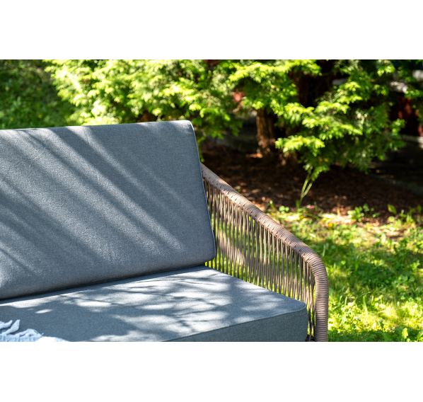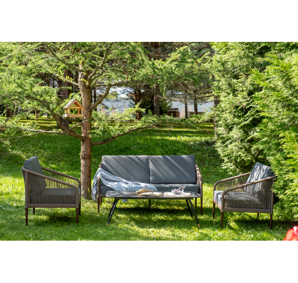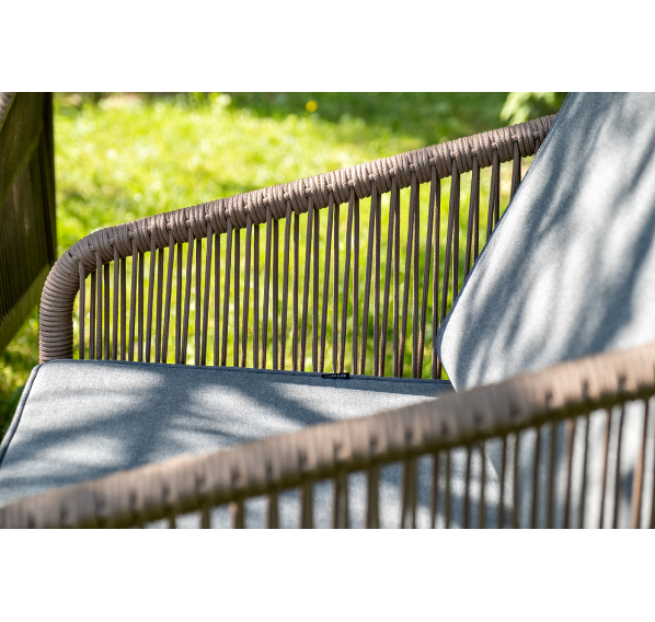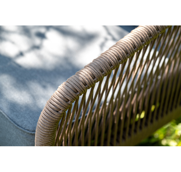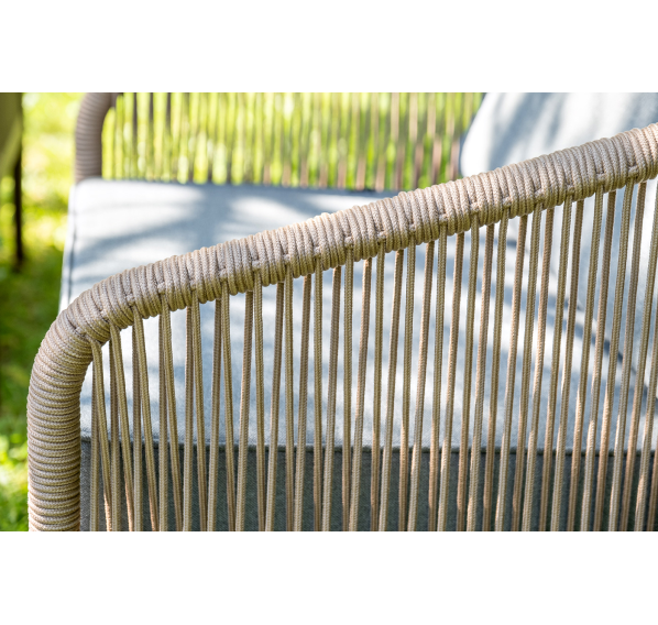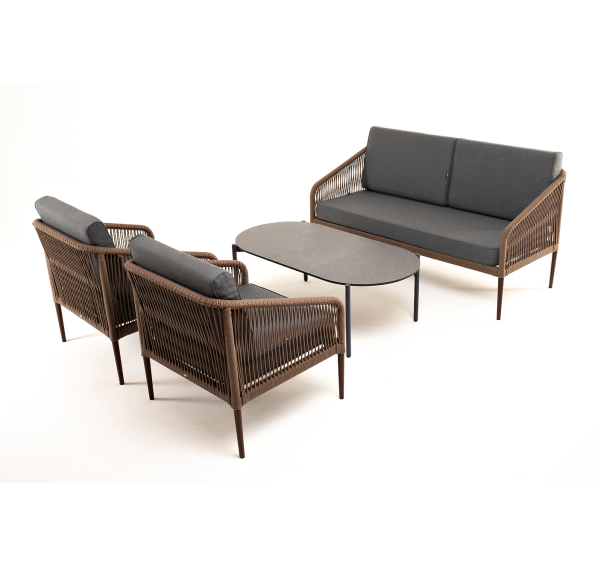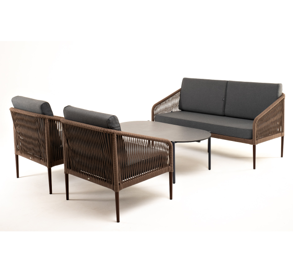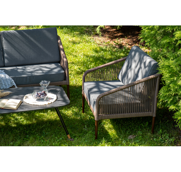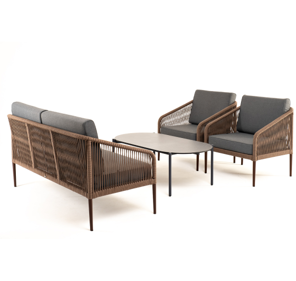 Каркас уличной мебели выполнен из прочного алюминия. Его дополняет коричневая оплетка, изготовленная на основе эластичных синтетических лент из полиэфирных волокон высокой прочности.