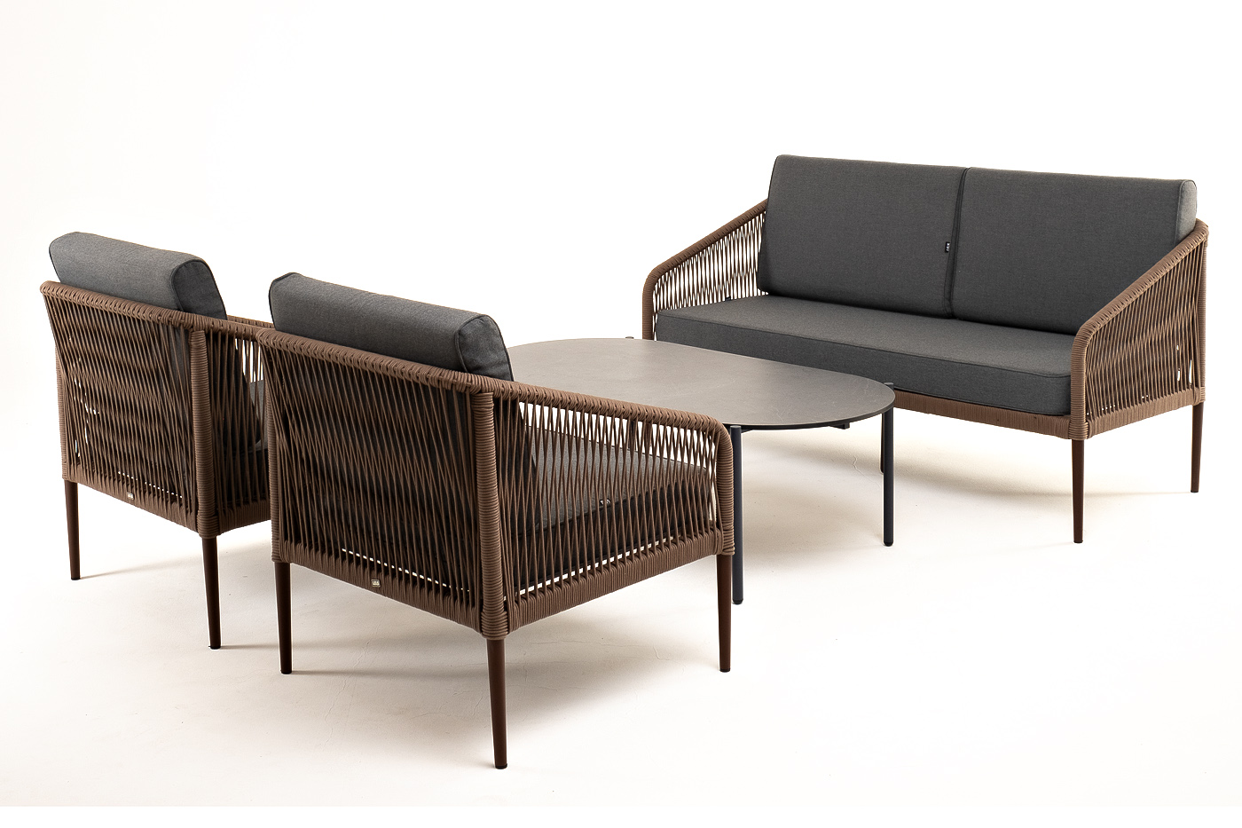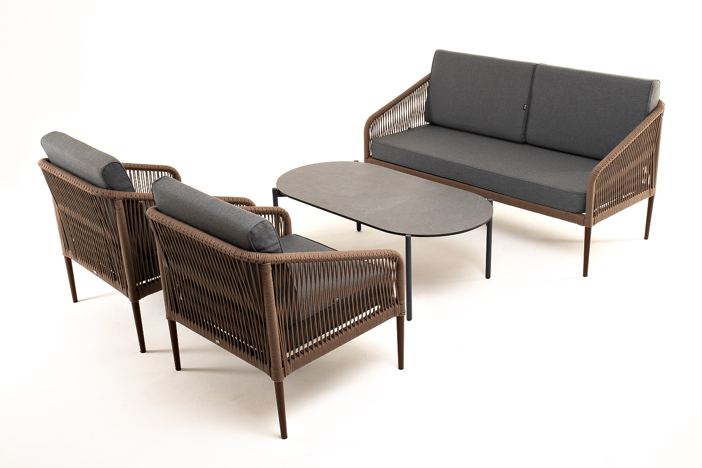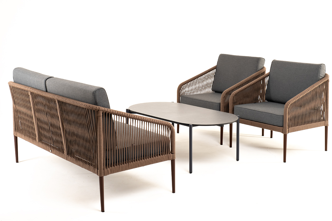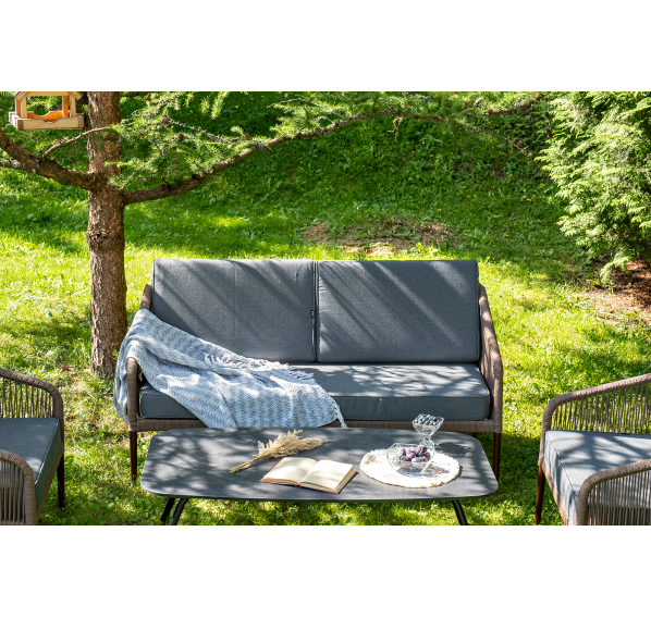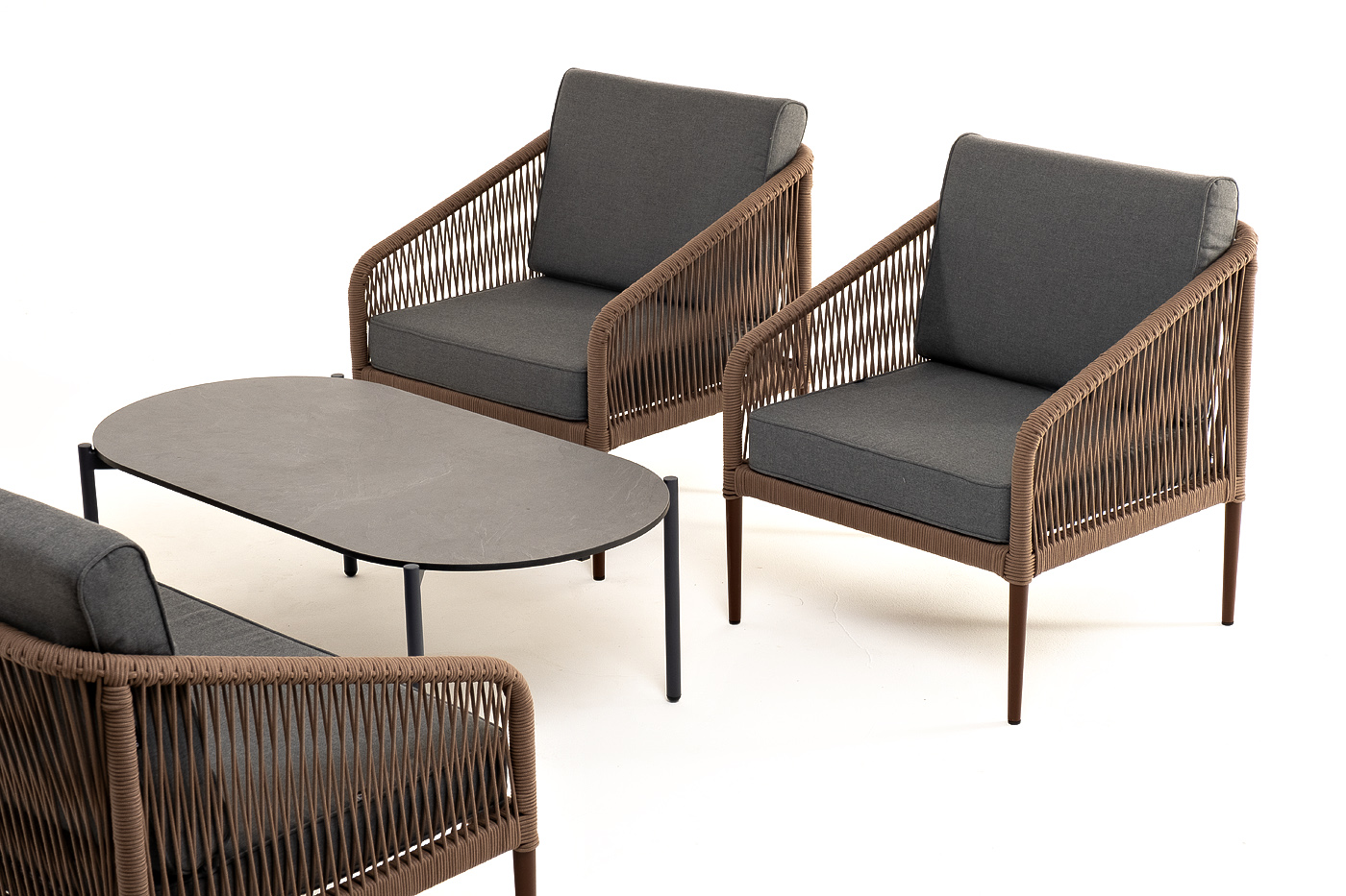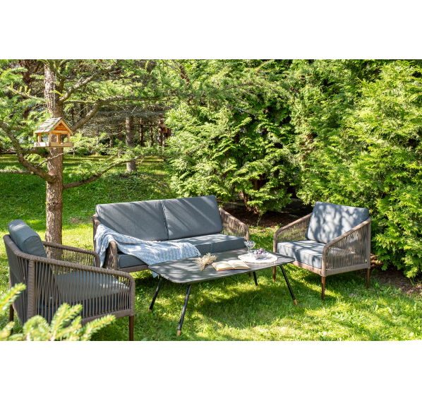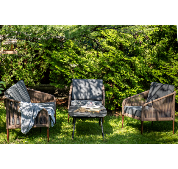 Каркас уличной мебели выполнен из прочного алюминия. Его дополняет коричневая оплетка, изготовленная на основе эластичных синтетических лент из полиэфирных волокон высокой прочности.