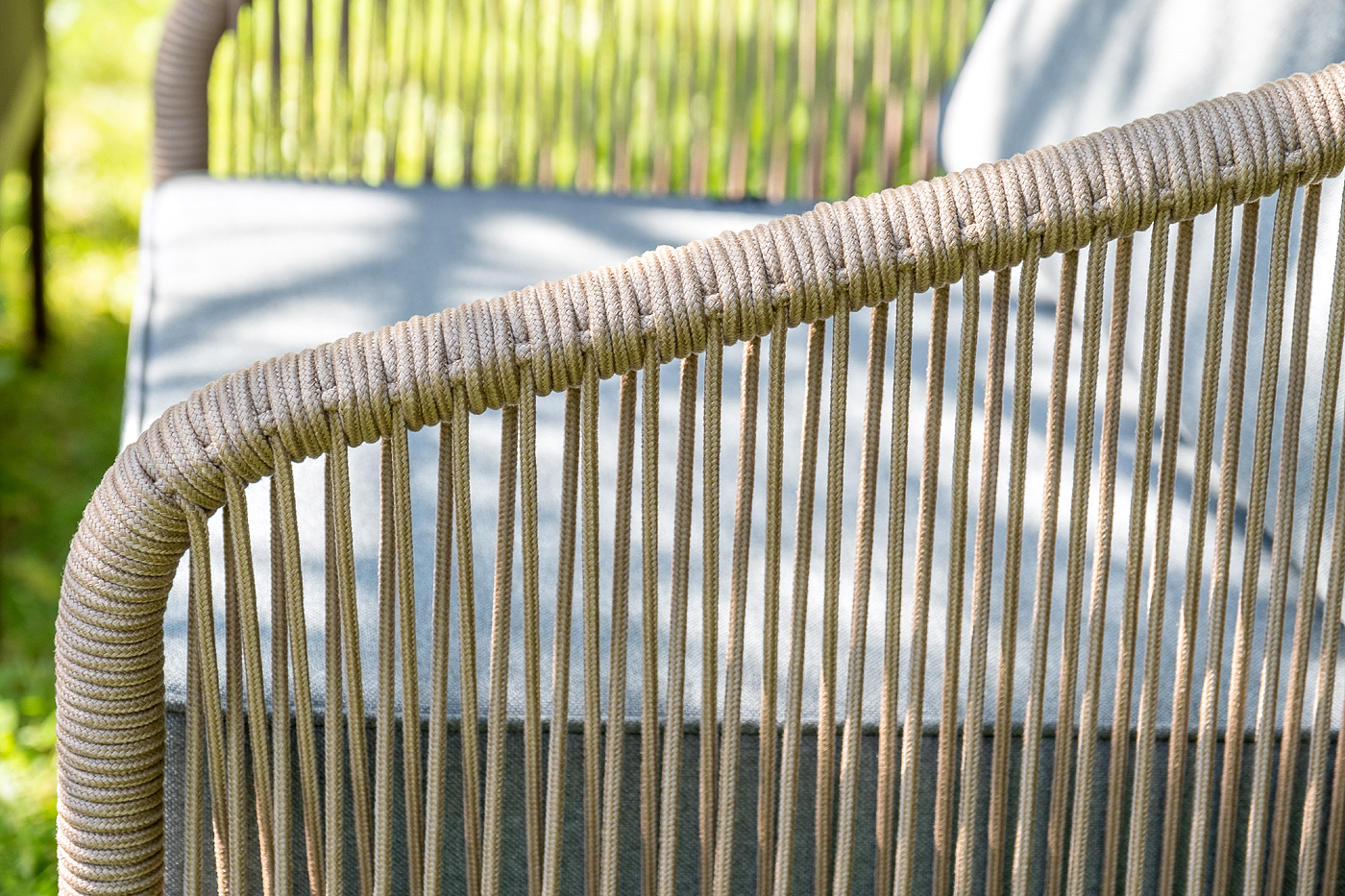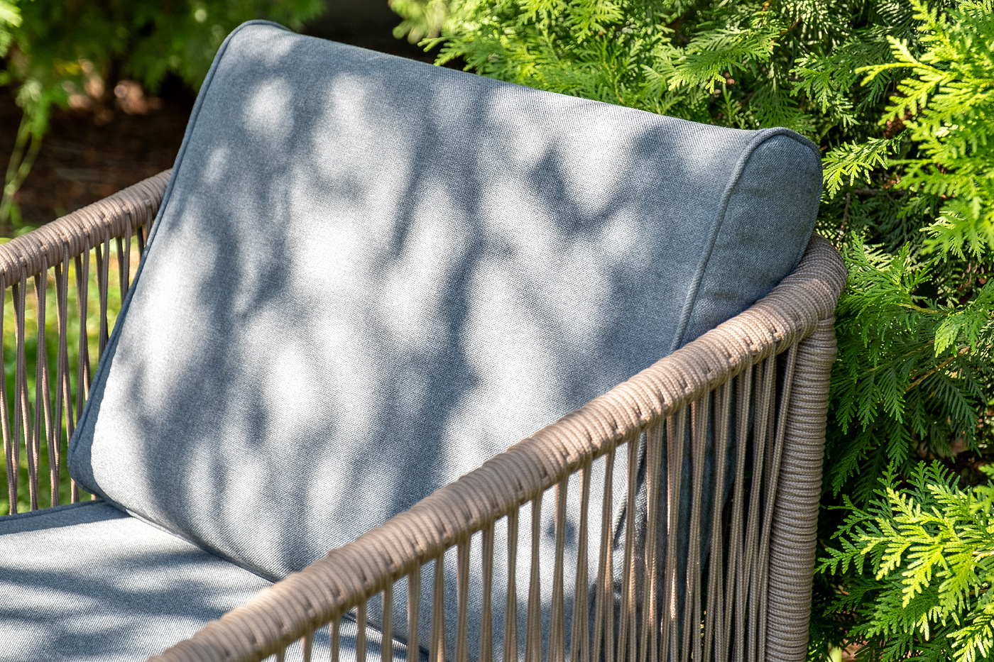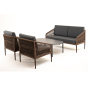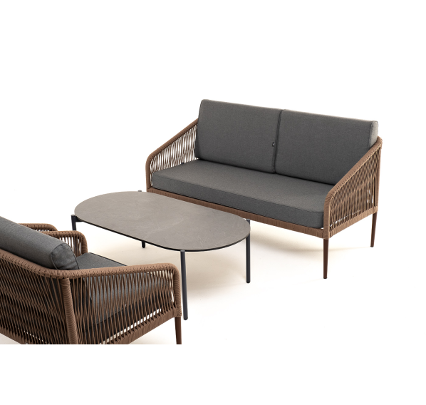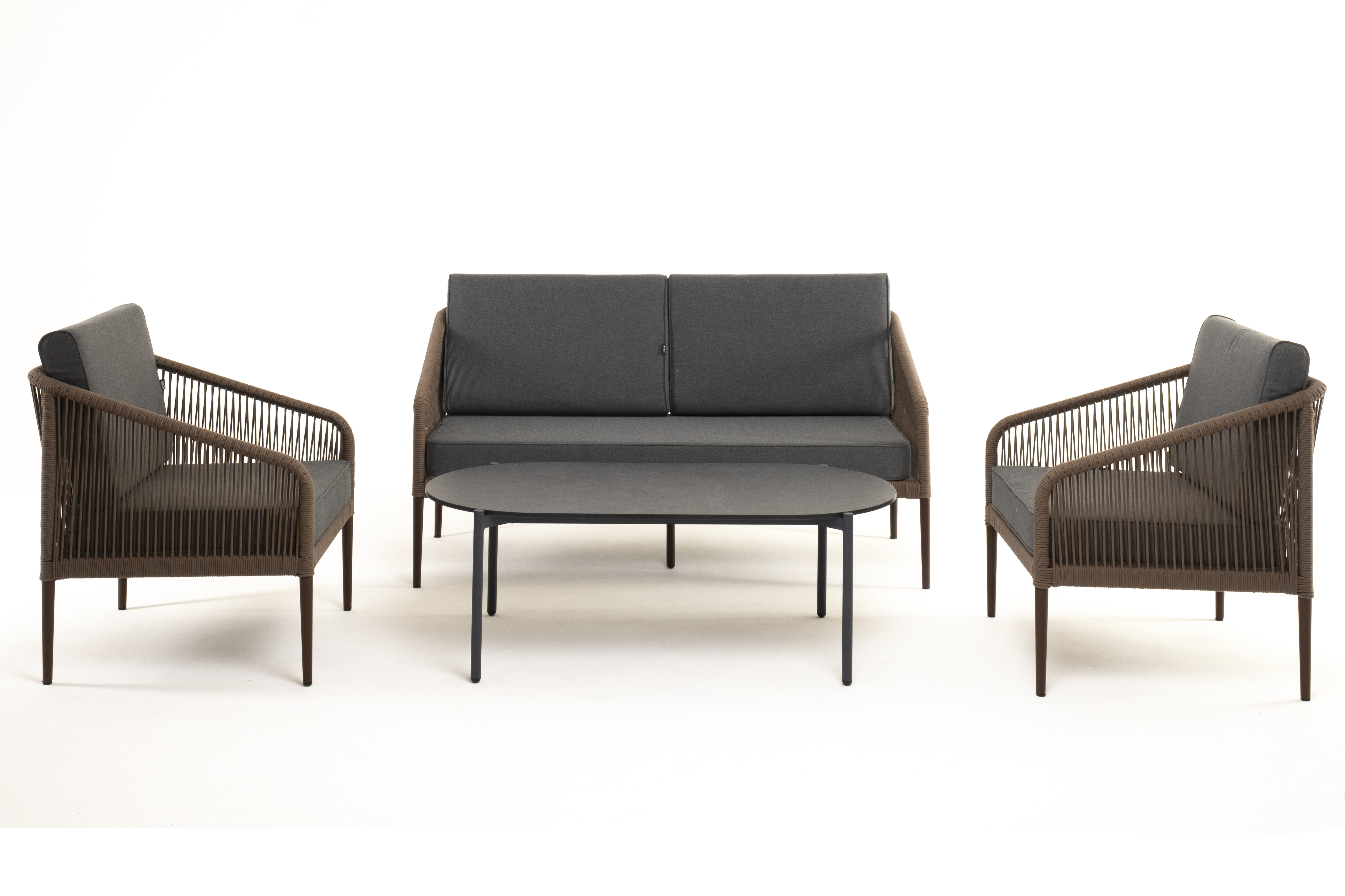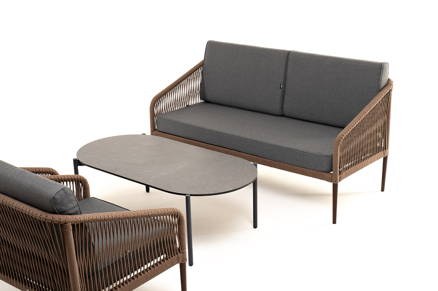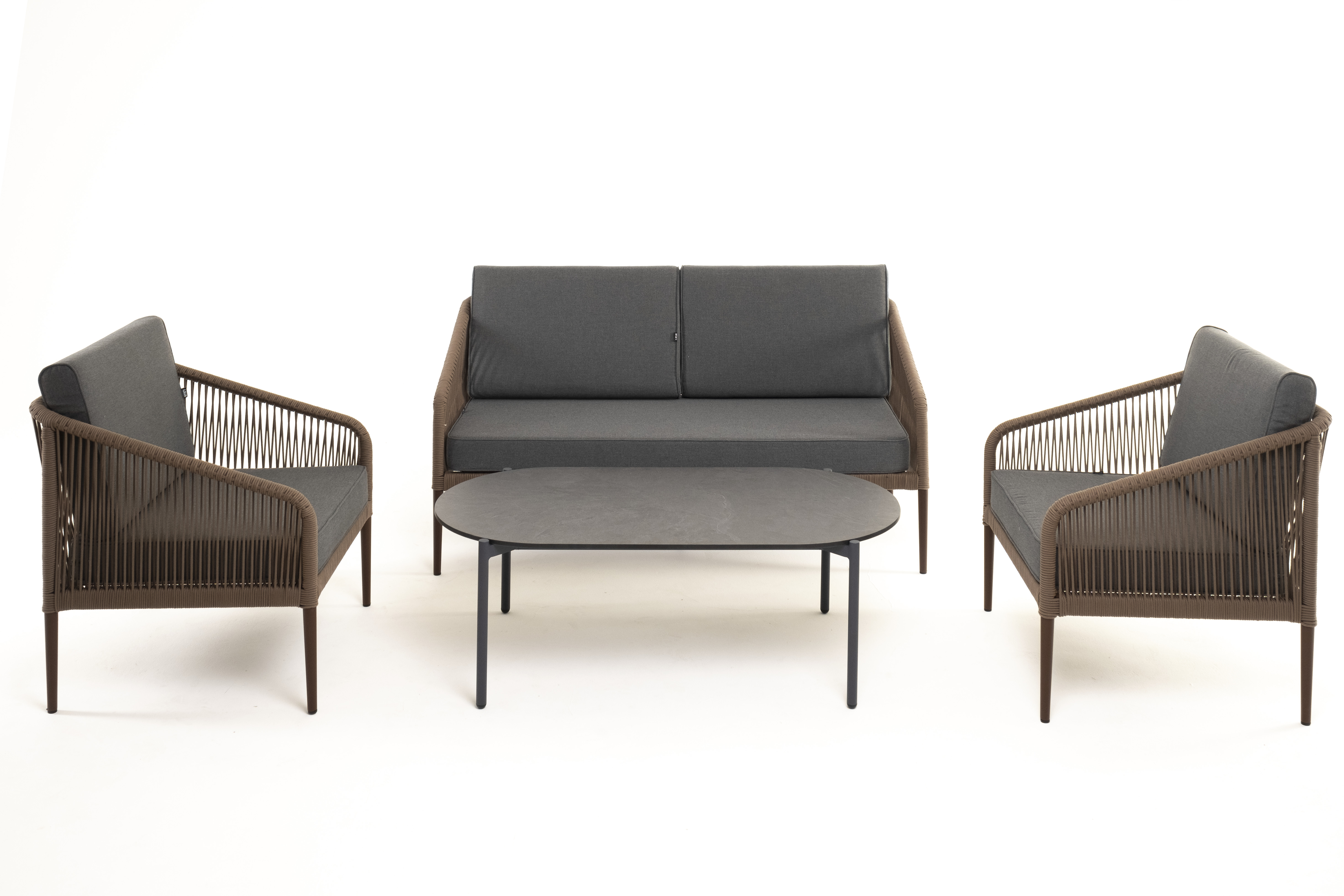 Каркас уличной мебели выполнен из прочного алюминия. Его дополняет коричневая оплетка, изготовленная на основе эластичных синтетических лент из полиэфирных волокон высокой прочности.