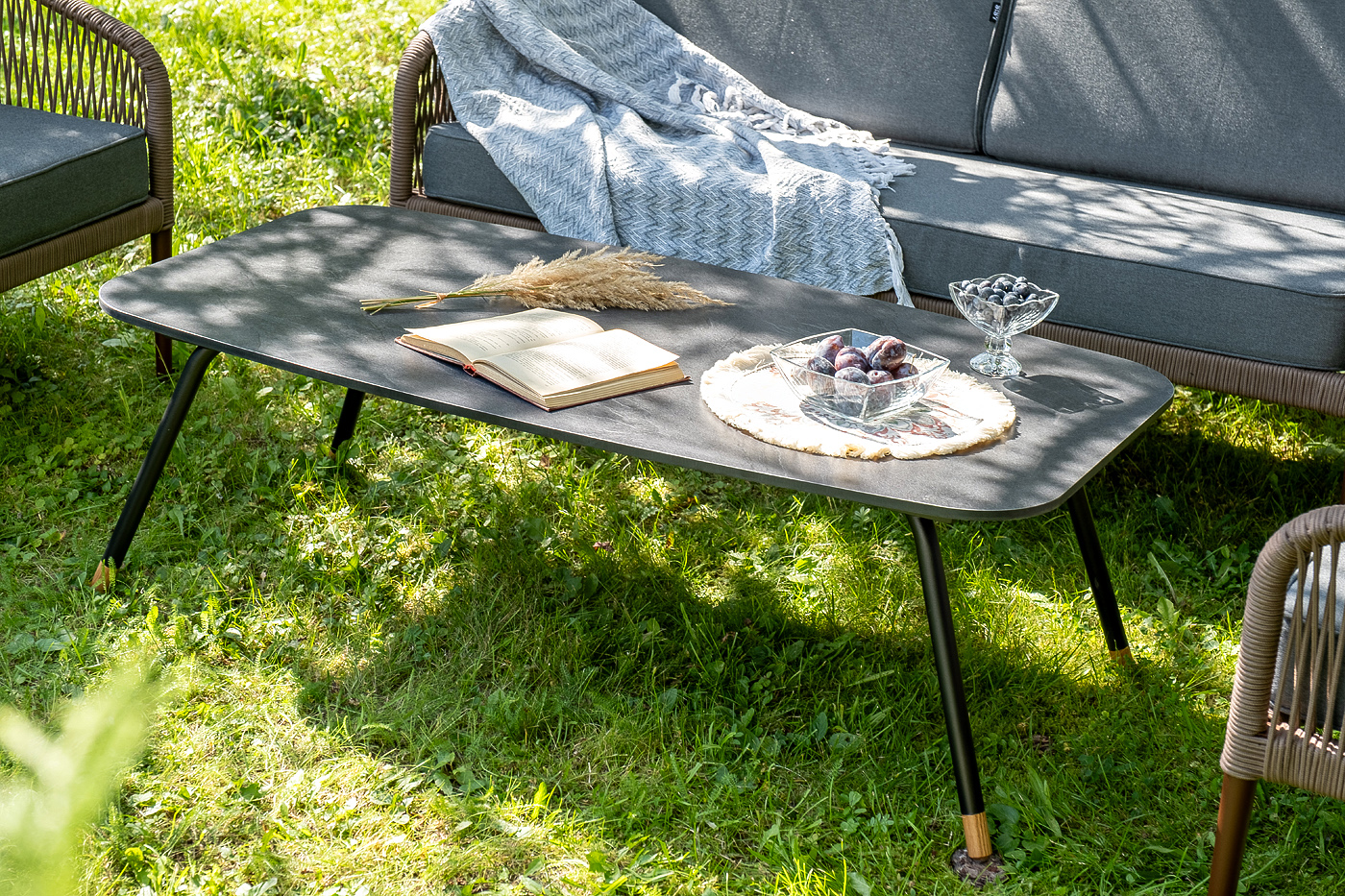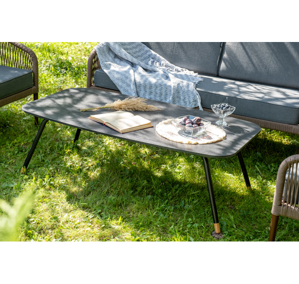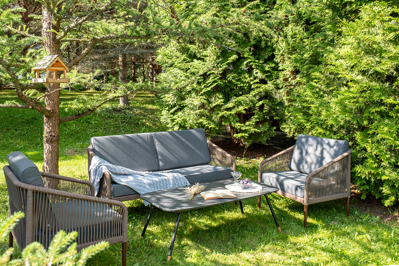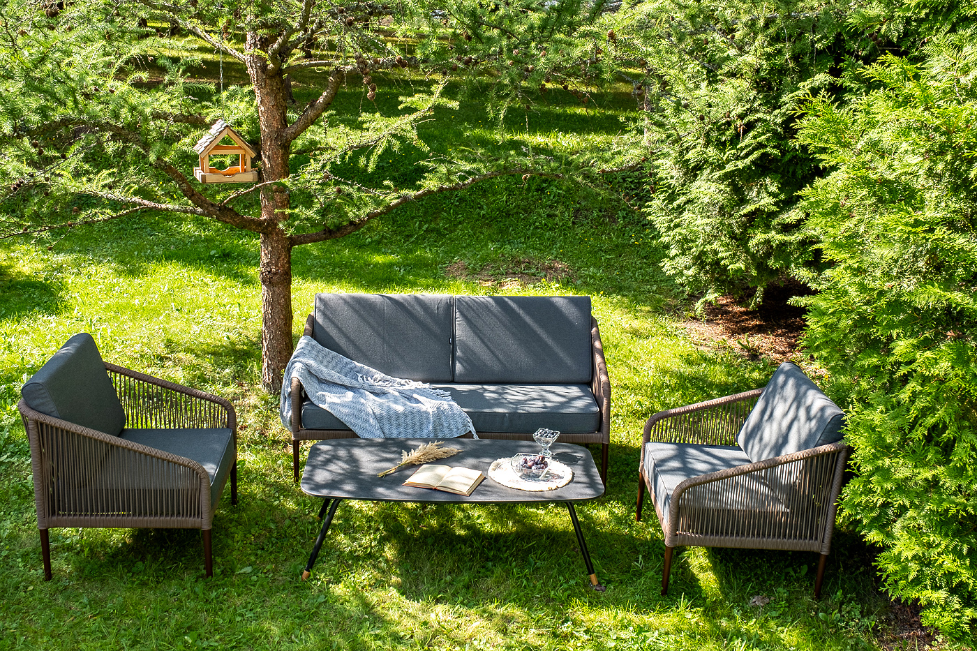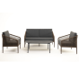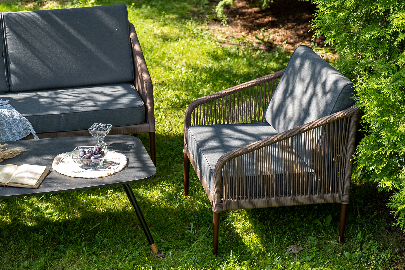 Каркас уличной мебели выполнен из прочного алюминия. Его дополняет коричневая оплетка, изготовленная на основе эластичных синтетических лент из полиэфирных волокон высокой прочности.