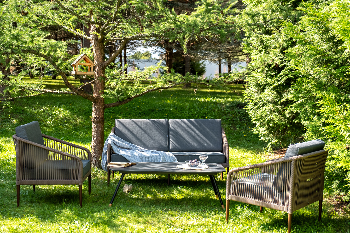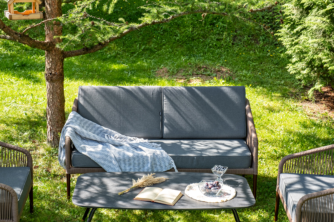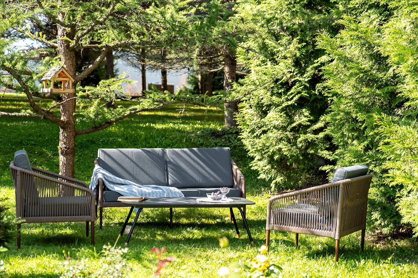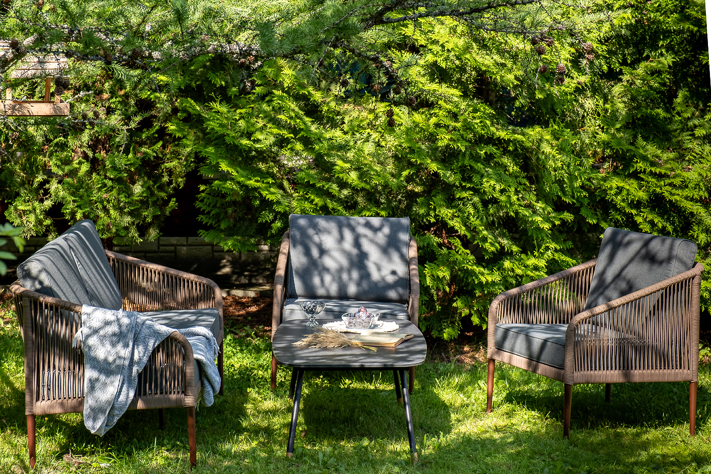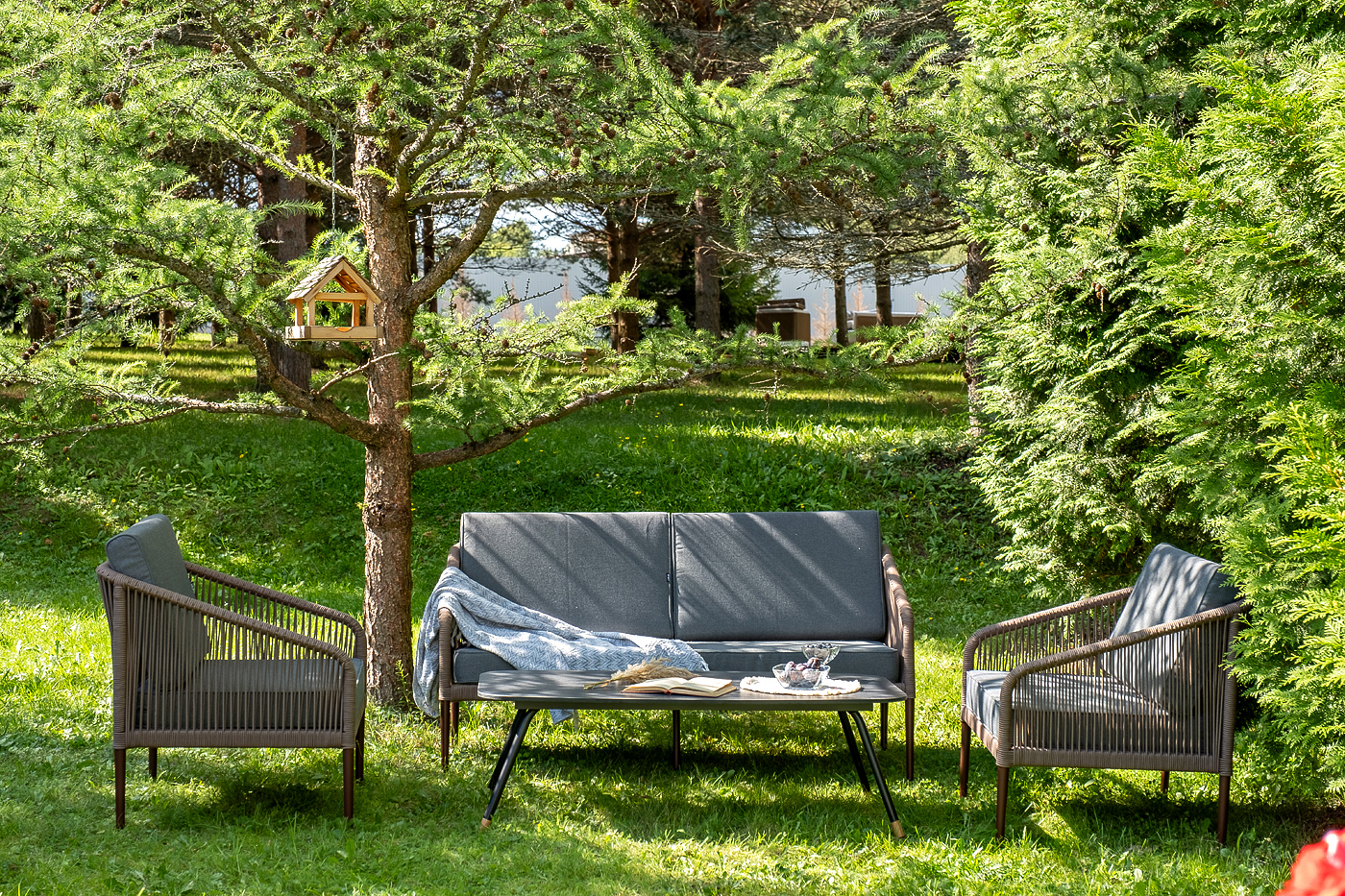 Каркас уличной мебели выполнен из прочного алюминия. Его дополняет коричневая оплетка, изготовленная на основе эластичных синтетических лент из полиэфирных волокон высокой прочности.
