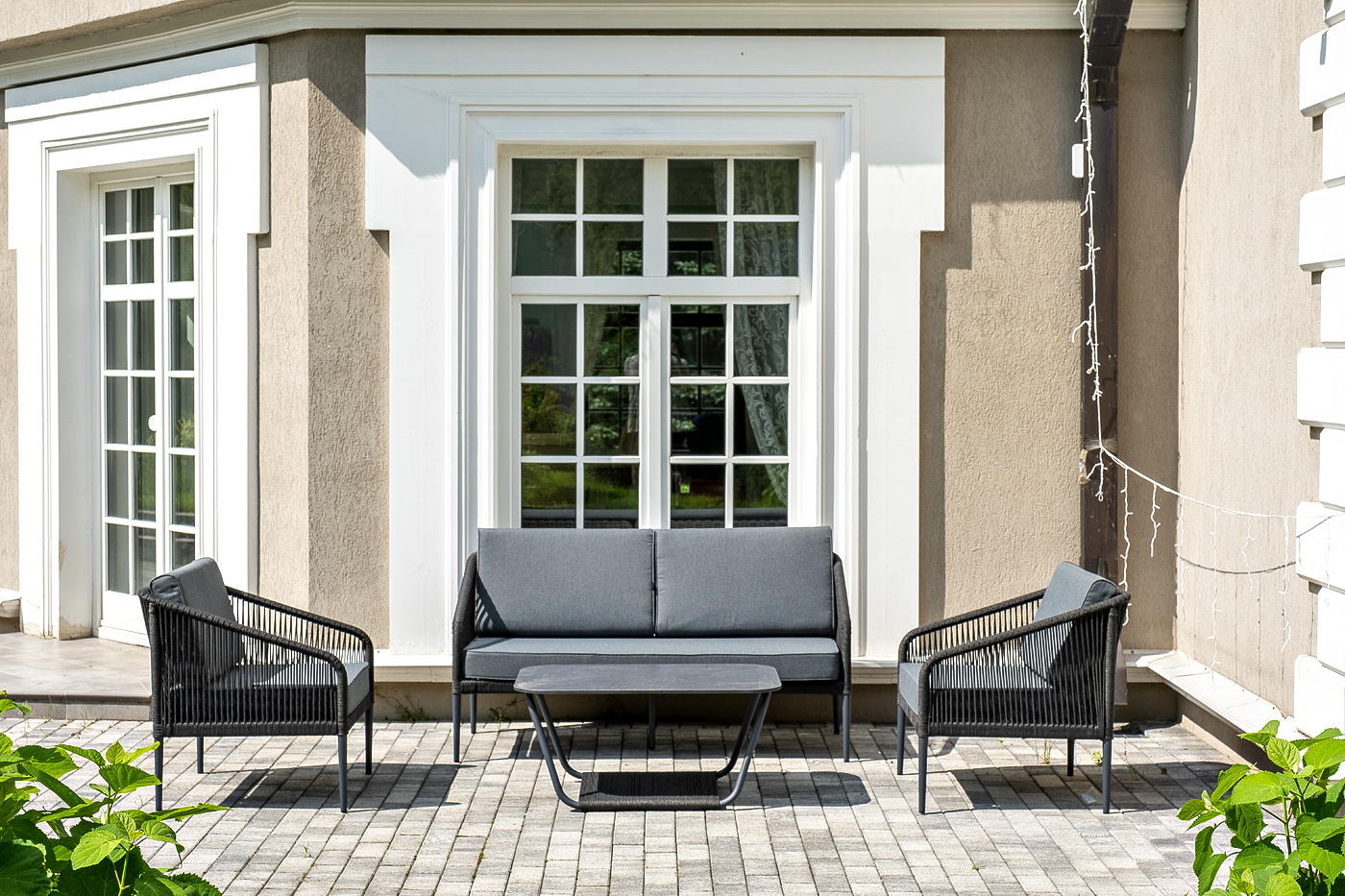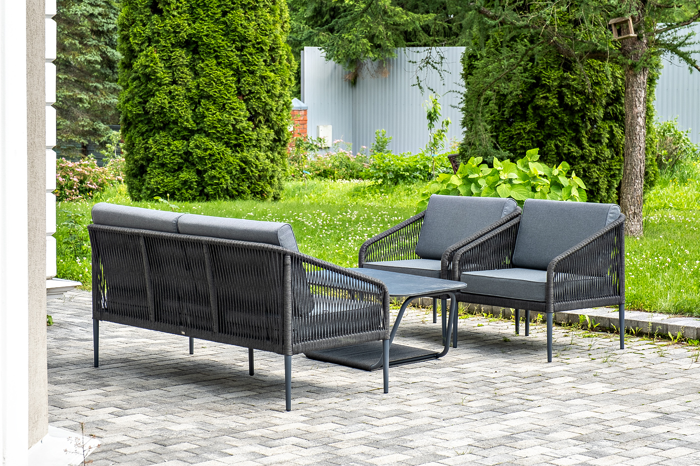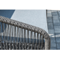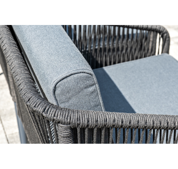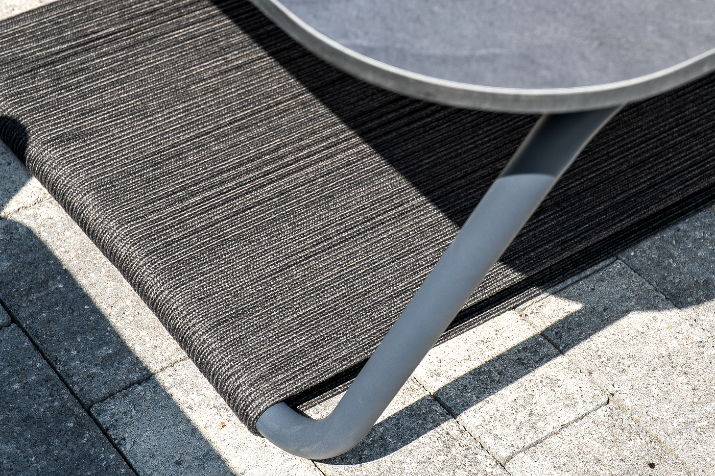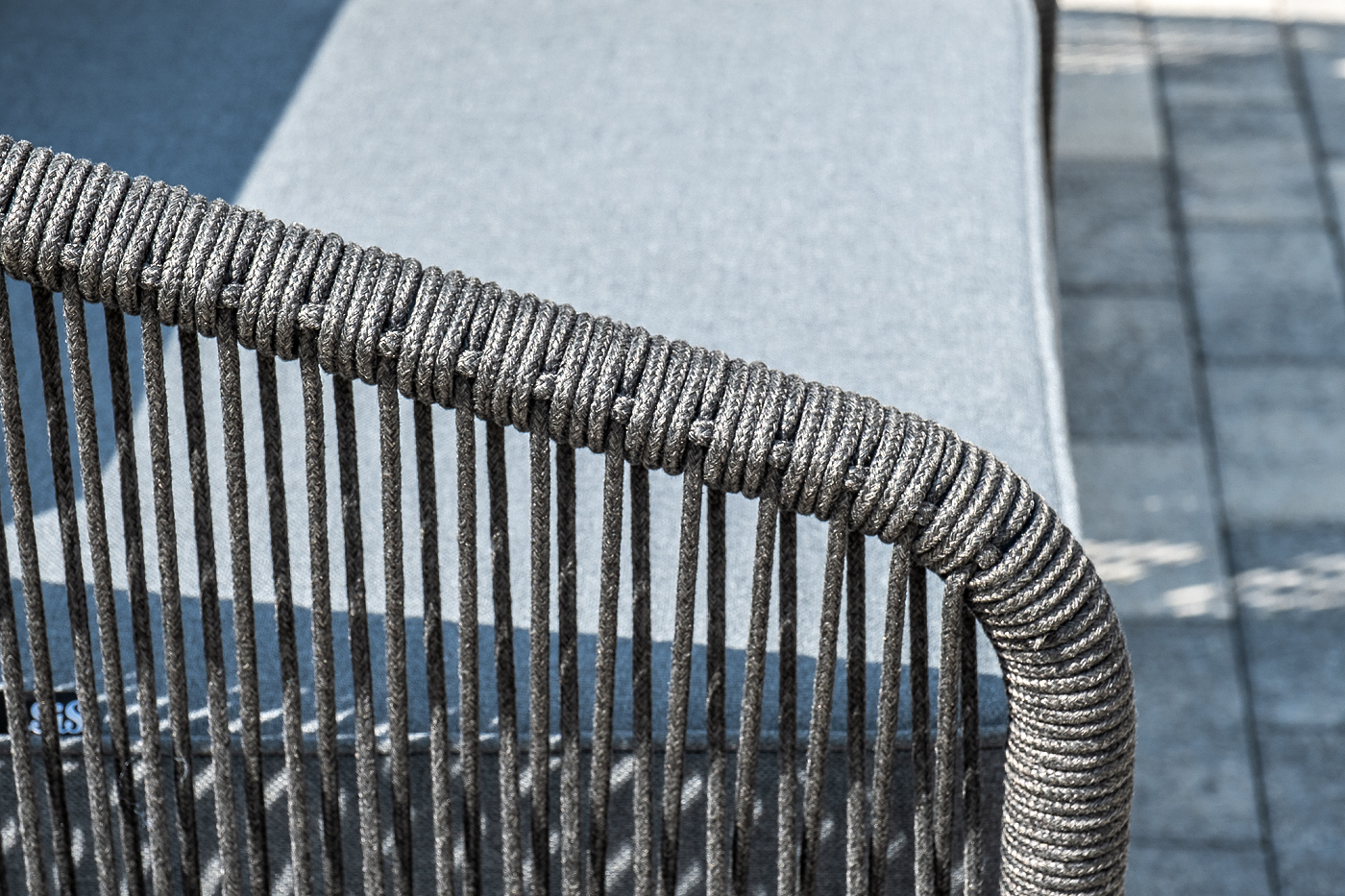 Каркас уличной мебели выполнен из износостойкого алюминия. Его дополняет серая ручная оплетка, изготовленная на основе эластичных синтетических лент из полиэфирных волокон высокой прочности.