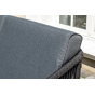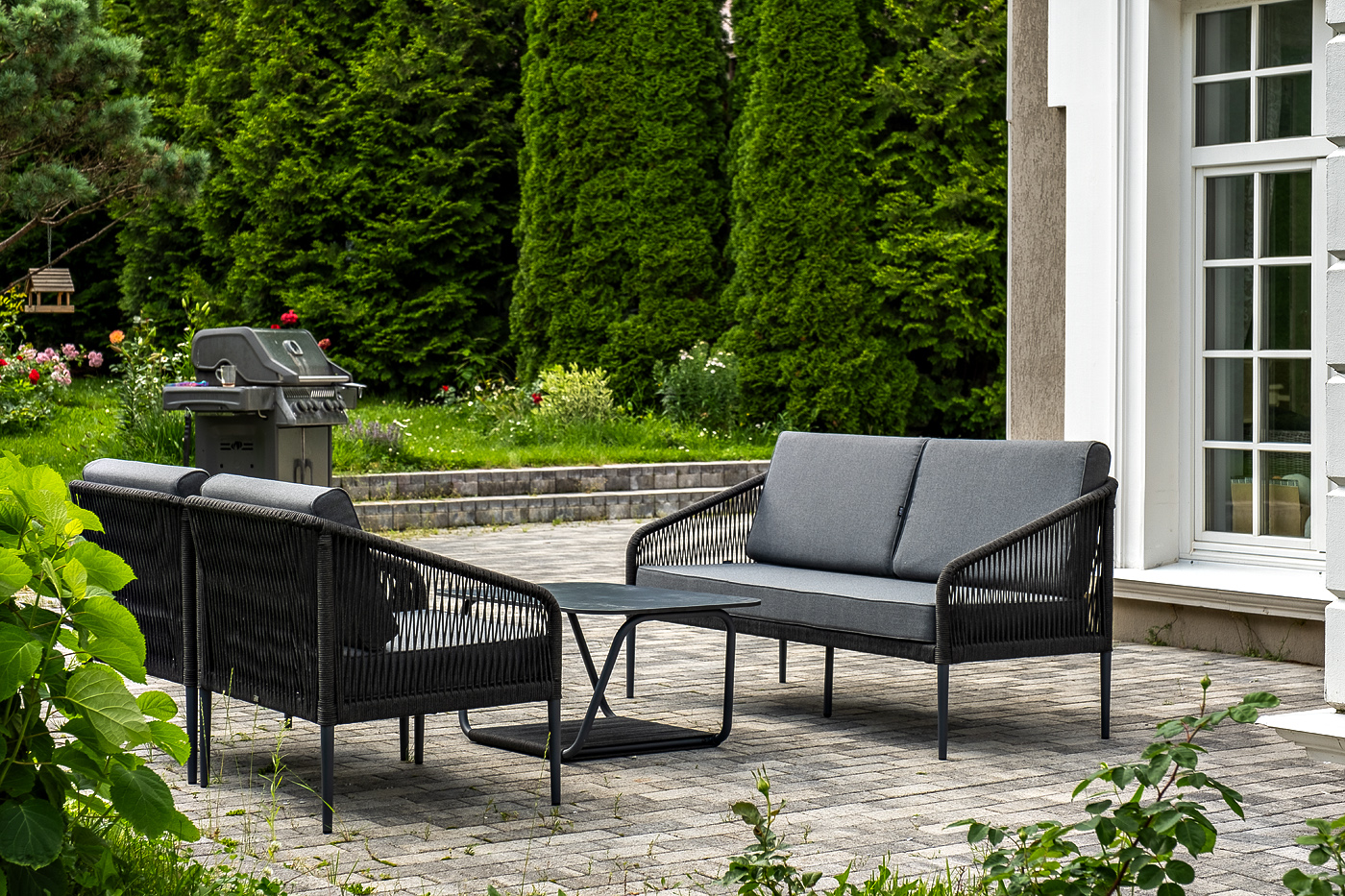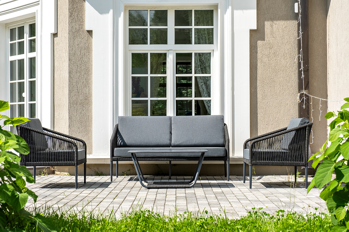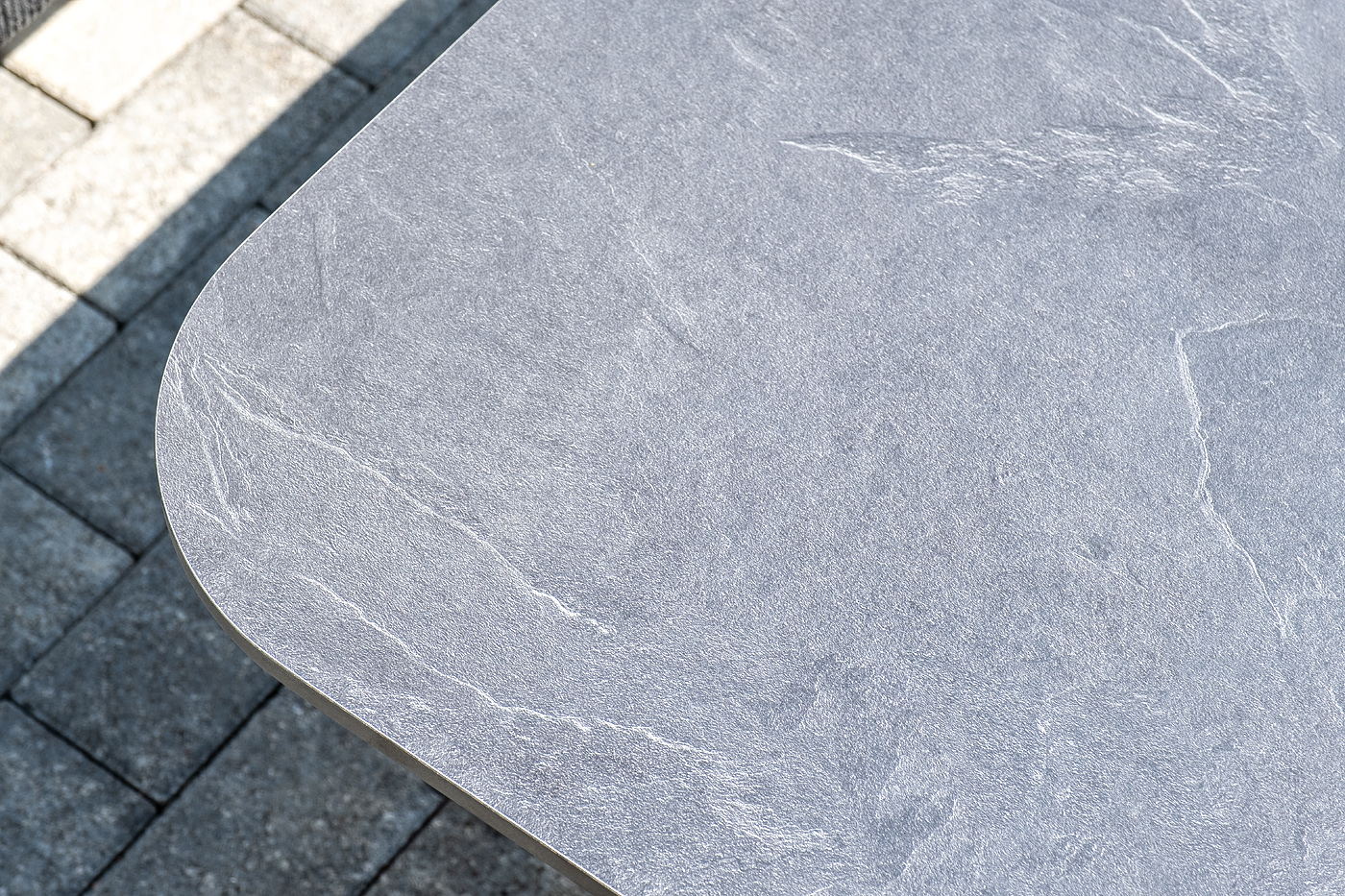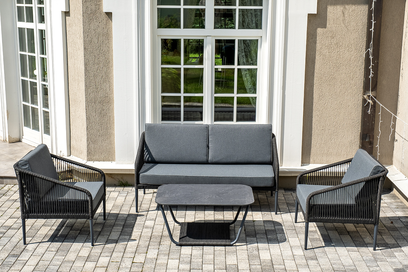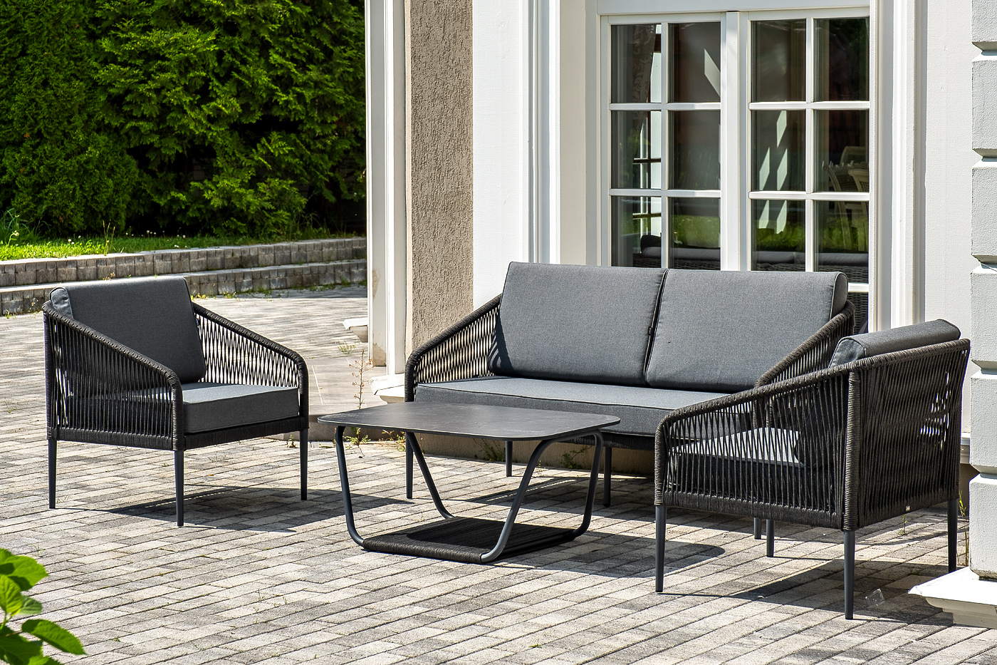 Каркас уличной мебели выполнен из износостойкого алюминия. Его дополняет серая ручная оплетка, изготовленная на основе эластичных синтетических лент из полиэфирных волокон высокой прочности.