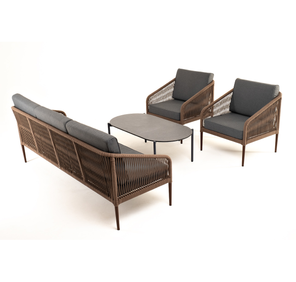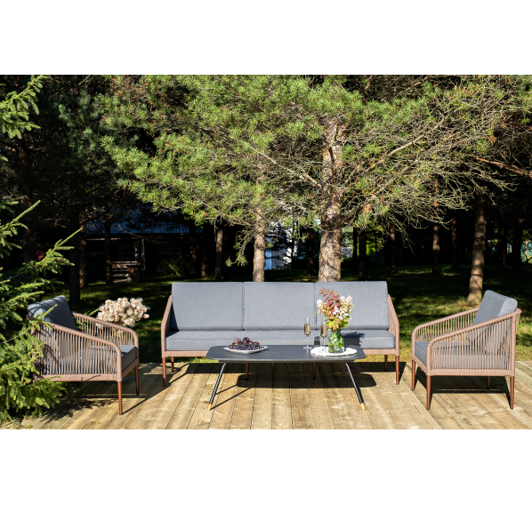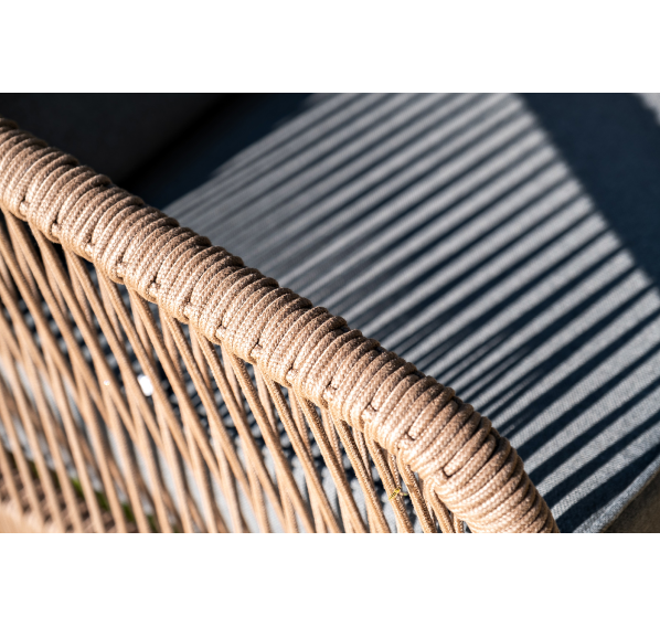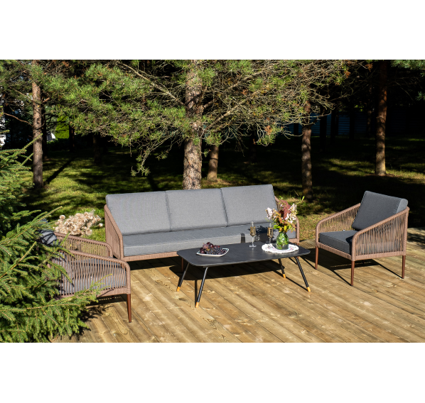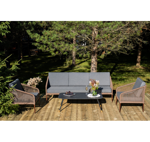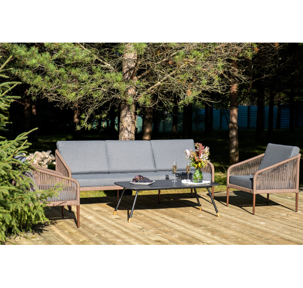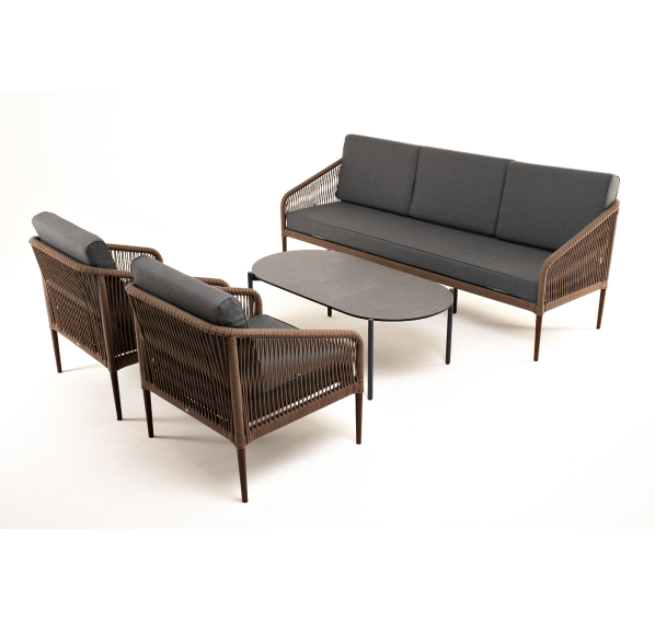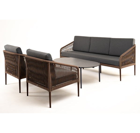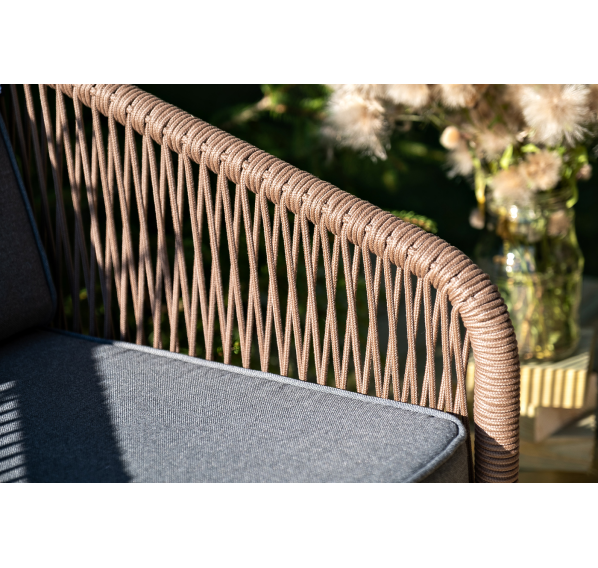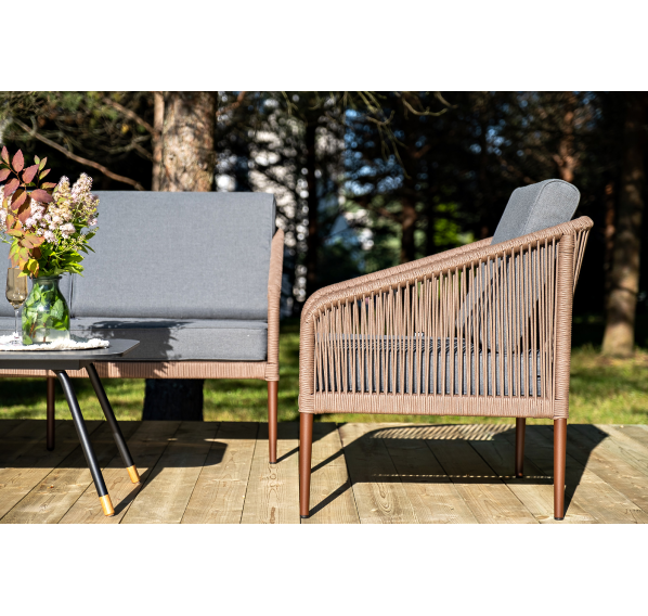 Каркас уличной мебели выполнен из износостойкого алюминия. Его дополняет коричневая ручная оплетка, изготовленная на основе эластичных синтетических лент из полиэфирных волокон высокой прочности.