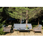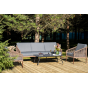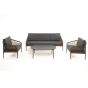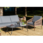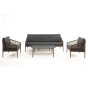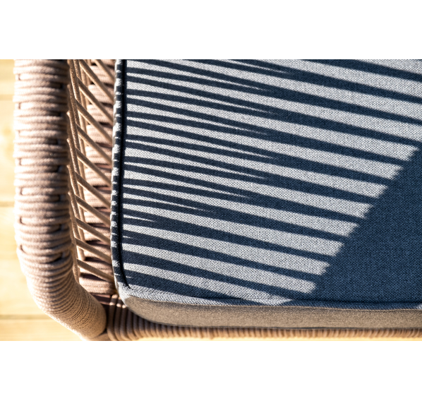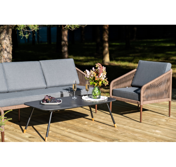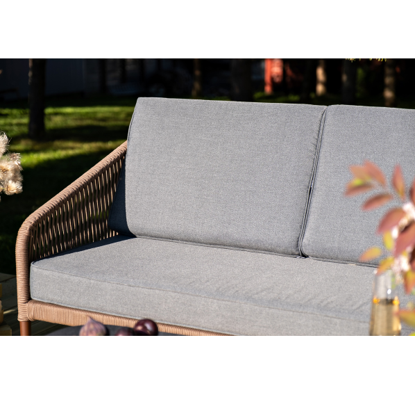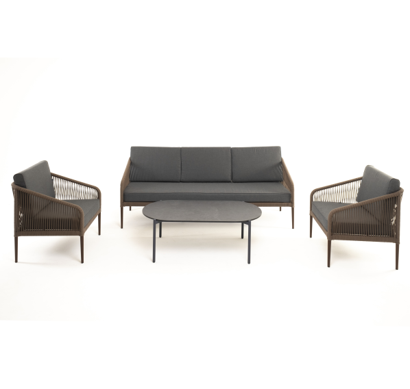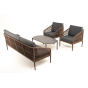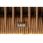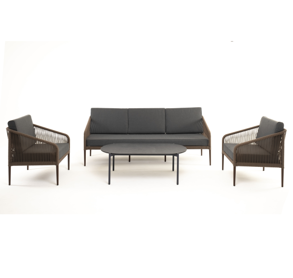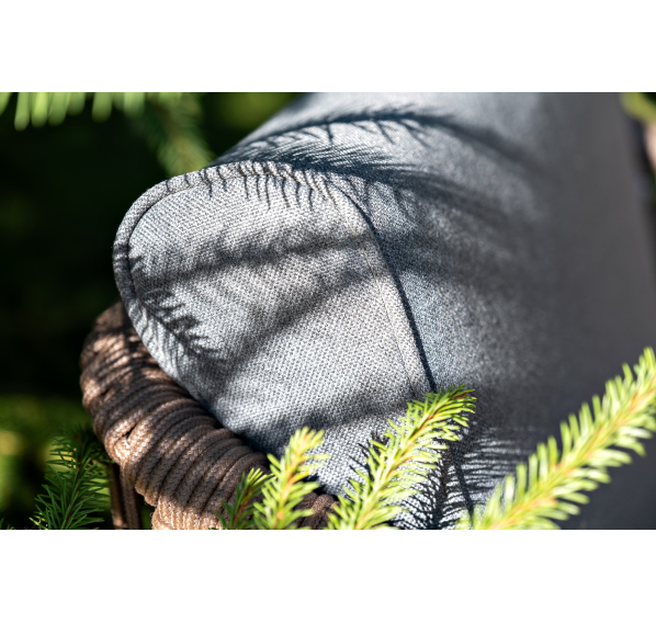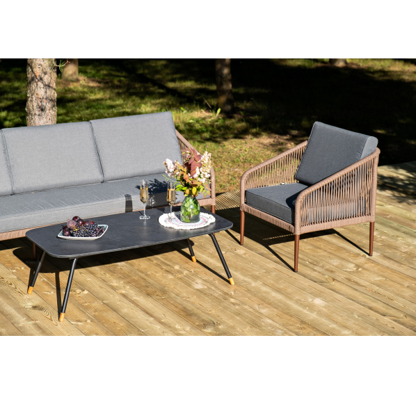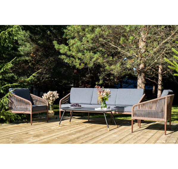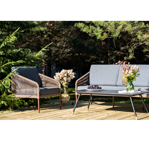 Каркас уличной мебели выполнен из износостойкого алюминия. Его дополняет коричневая ручная оплетка, изготовленная на основе эластичных синтетических лент из полиэфирных волокон высокой прочности.