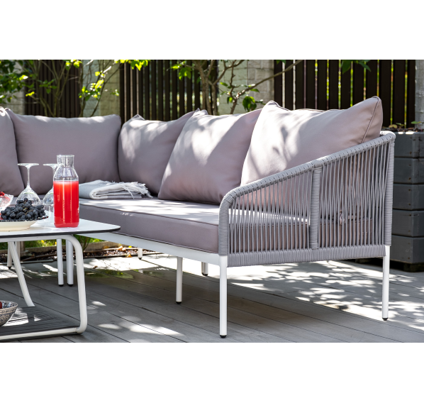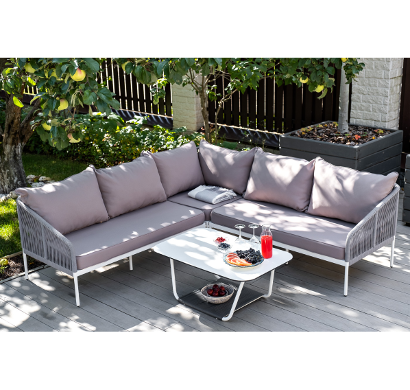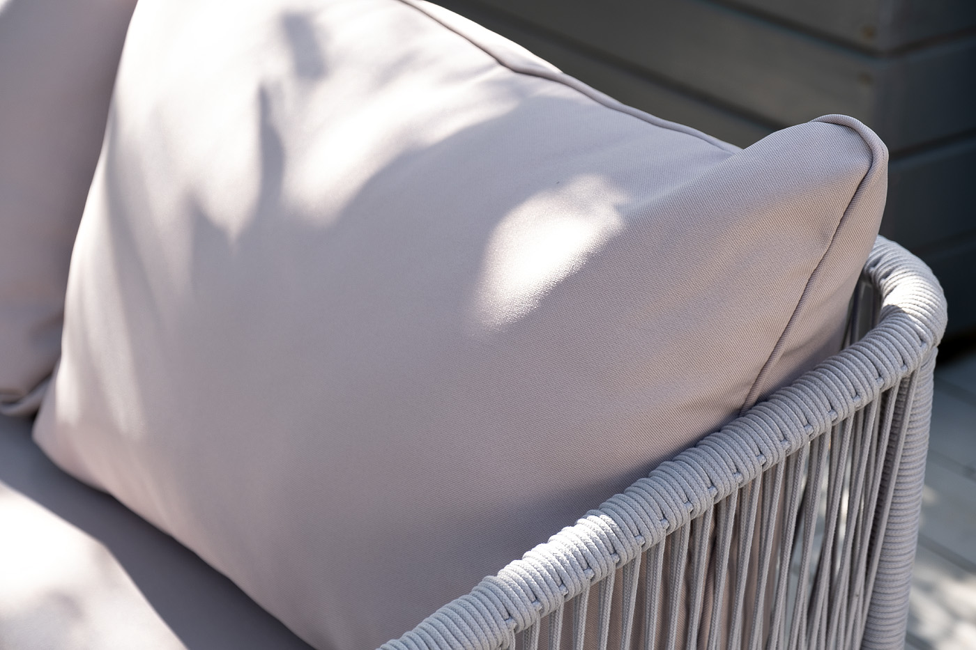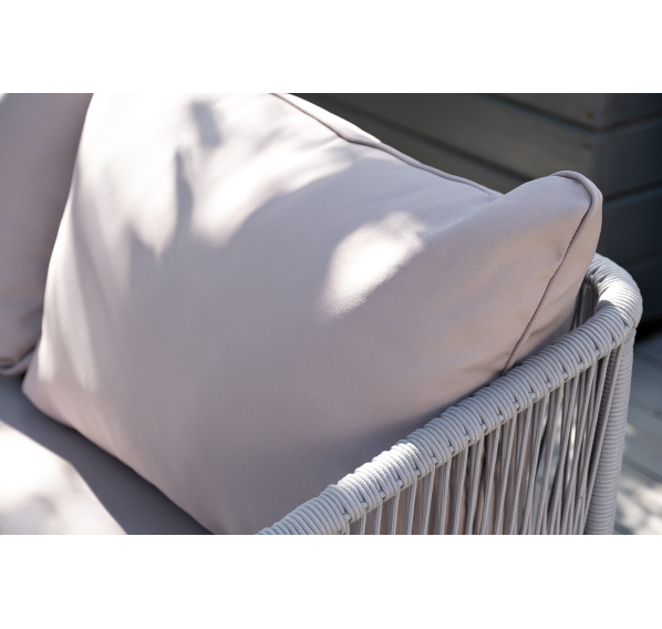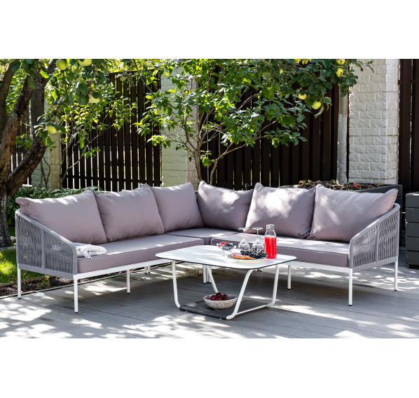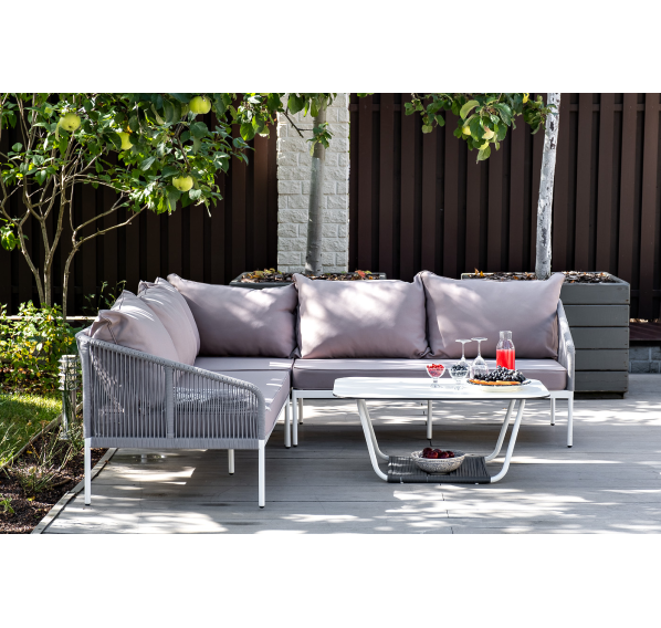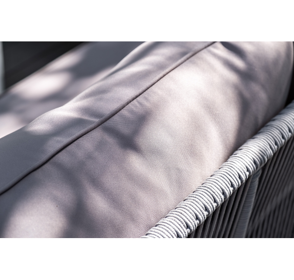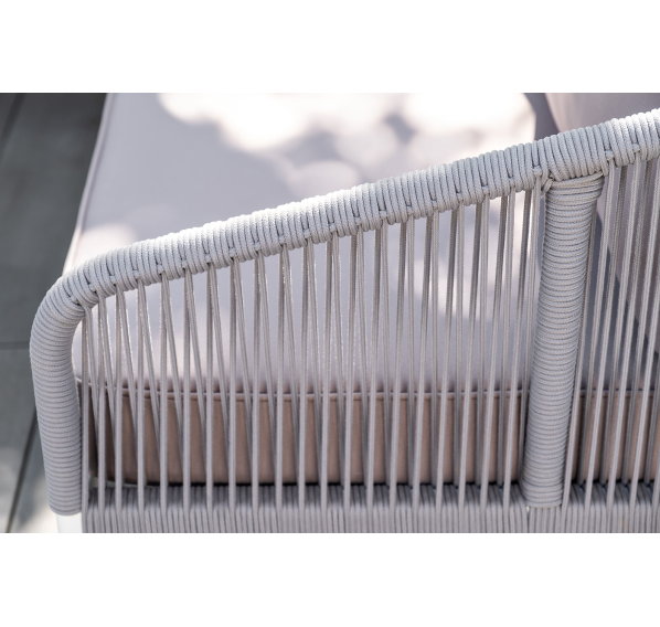 Каркас уличной мебели выполнен из износостойкого алюминия. Его дополняет светло-серая ручная оплетка, изготовленная на основе эластичных синтетических лент из полиэфирных волокон высокой прочности (роупа).