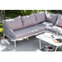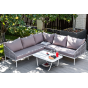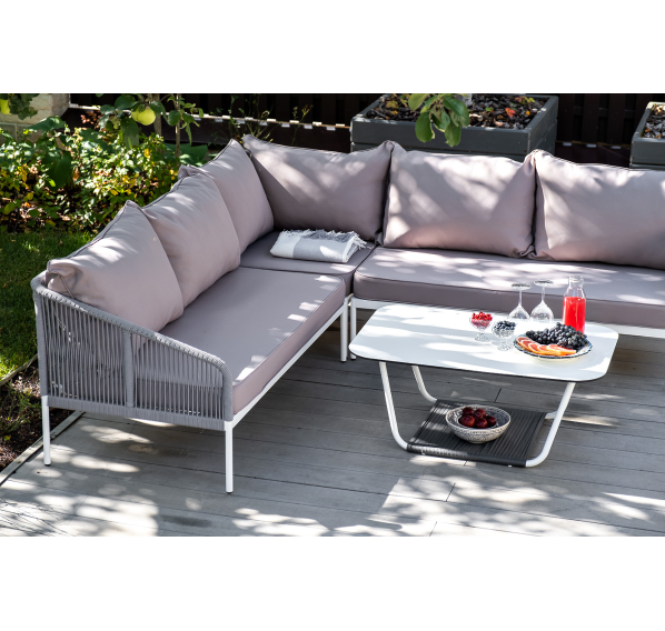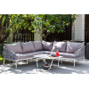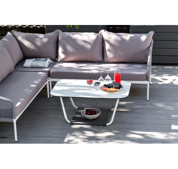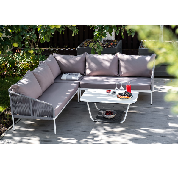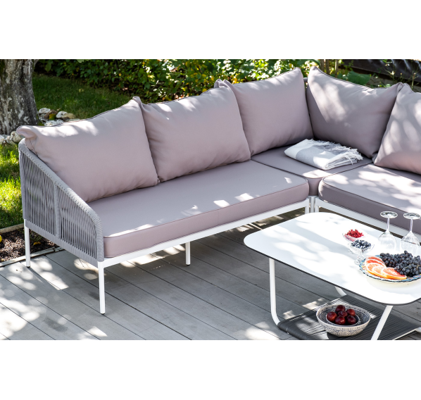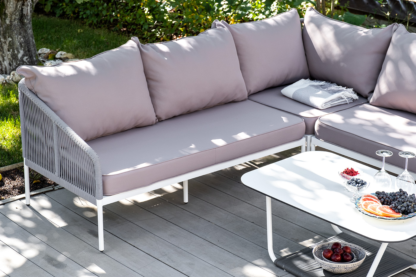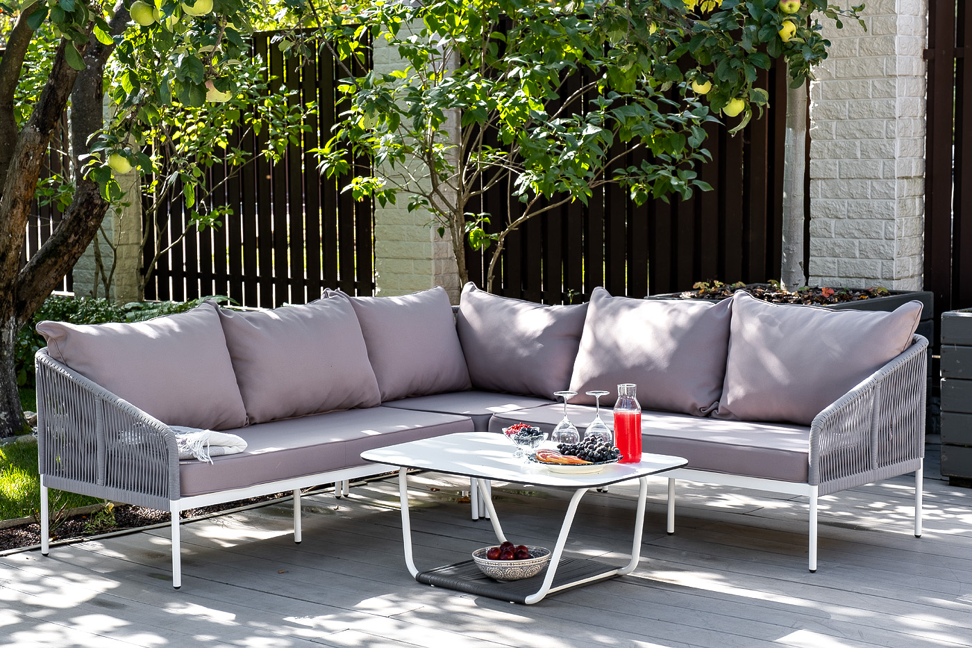 Каркас уличной мебели выполнен из износостойкого алюминия. Его дополняет светло-серая ручная оплетка, изготовленная на основе эластичных синтетических лент из полиэфирных волокон высокой прочности (роупа).