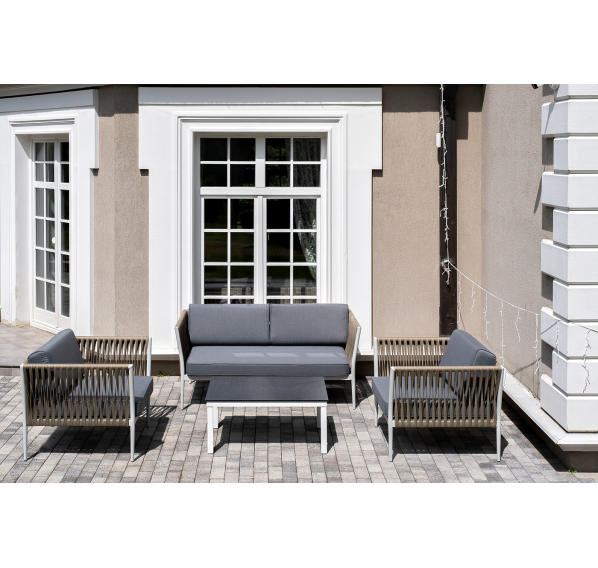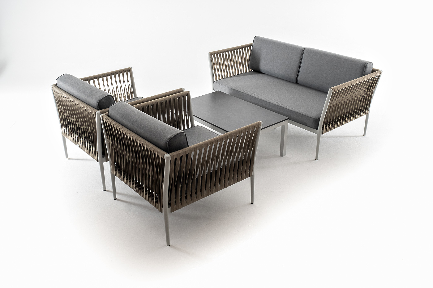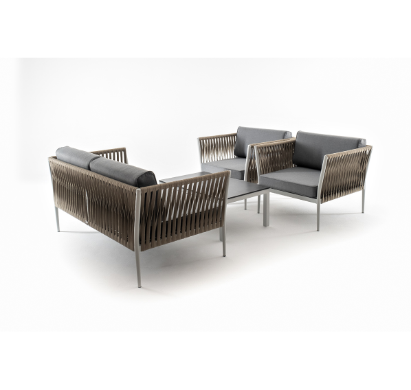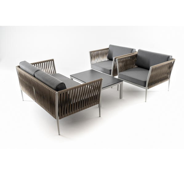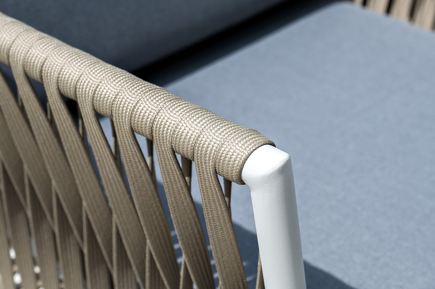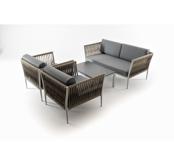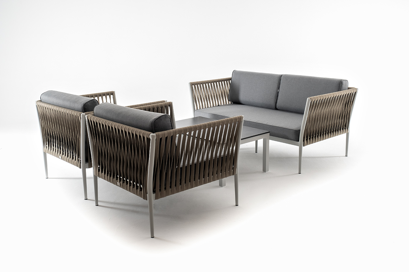 Диван и кресла изготовлены их алюминиевого прочного каркаса, оплетенного ручным способом роупом серо-коричневого цвета. Это эластичные ленты из полиэфирных волокон высокого качества.