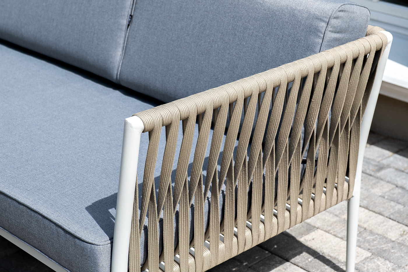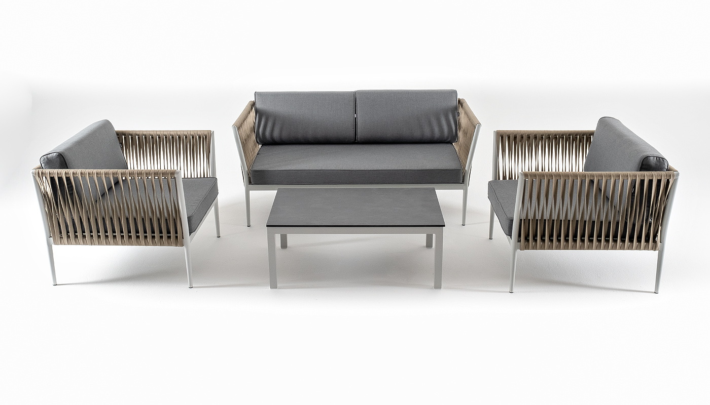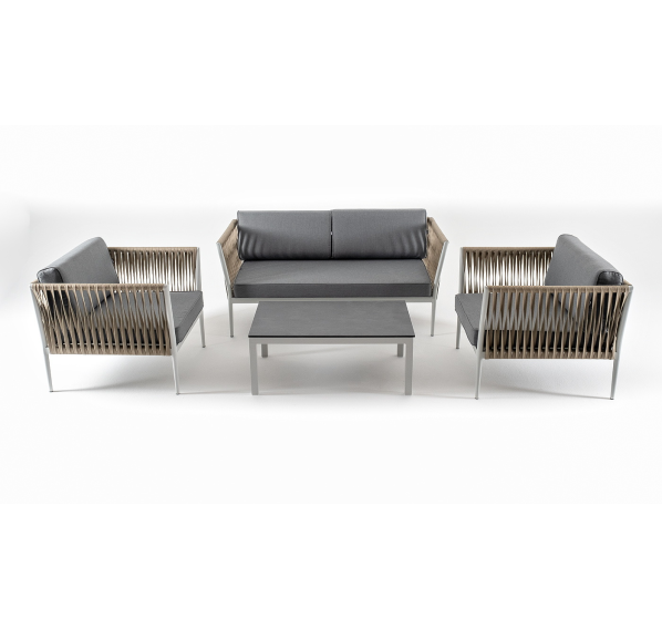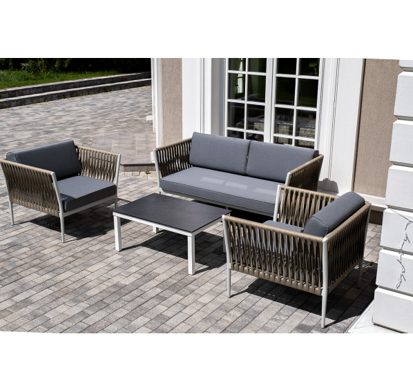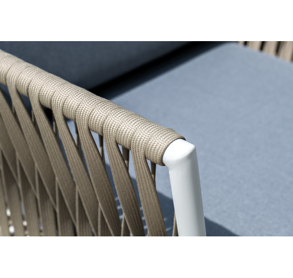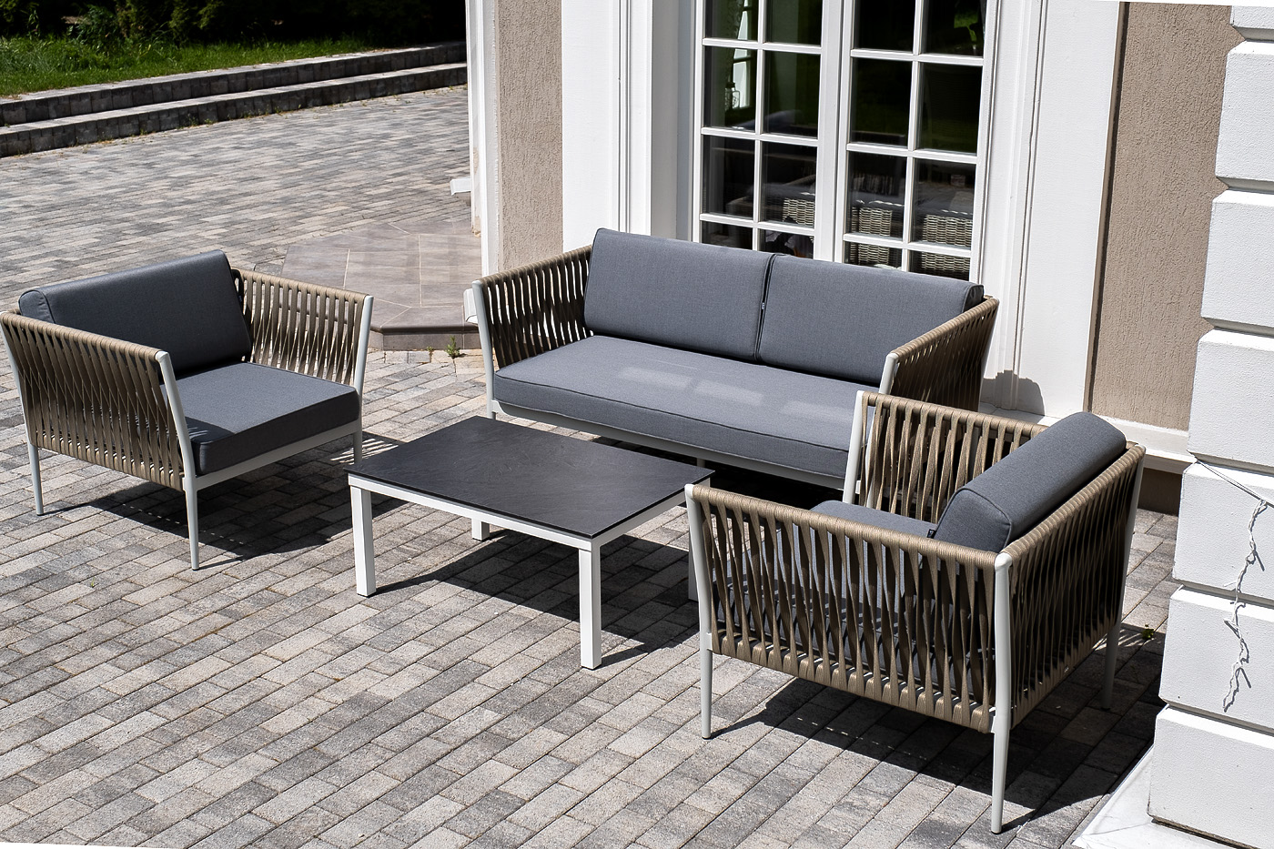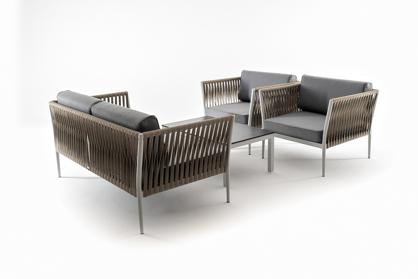 Диван и кресла изготовлены их алюминиевого прочного каркаса, оплетенного ручным способом роупом серо-коричневого цвета. Это эластичные ленты из полиэфирных волокон высокого качества.