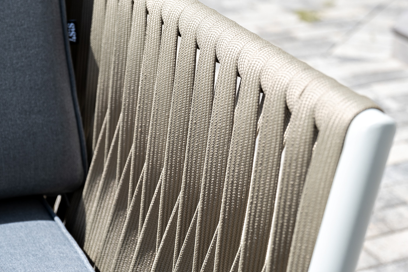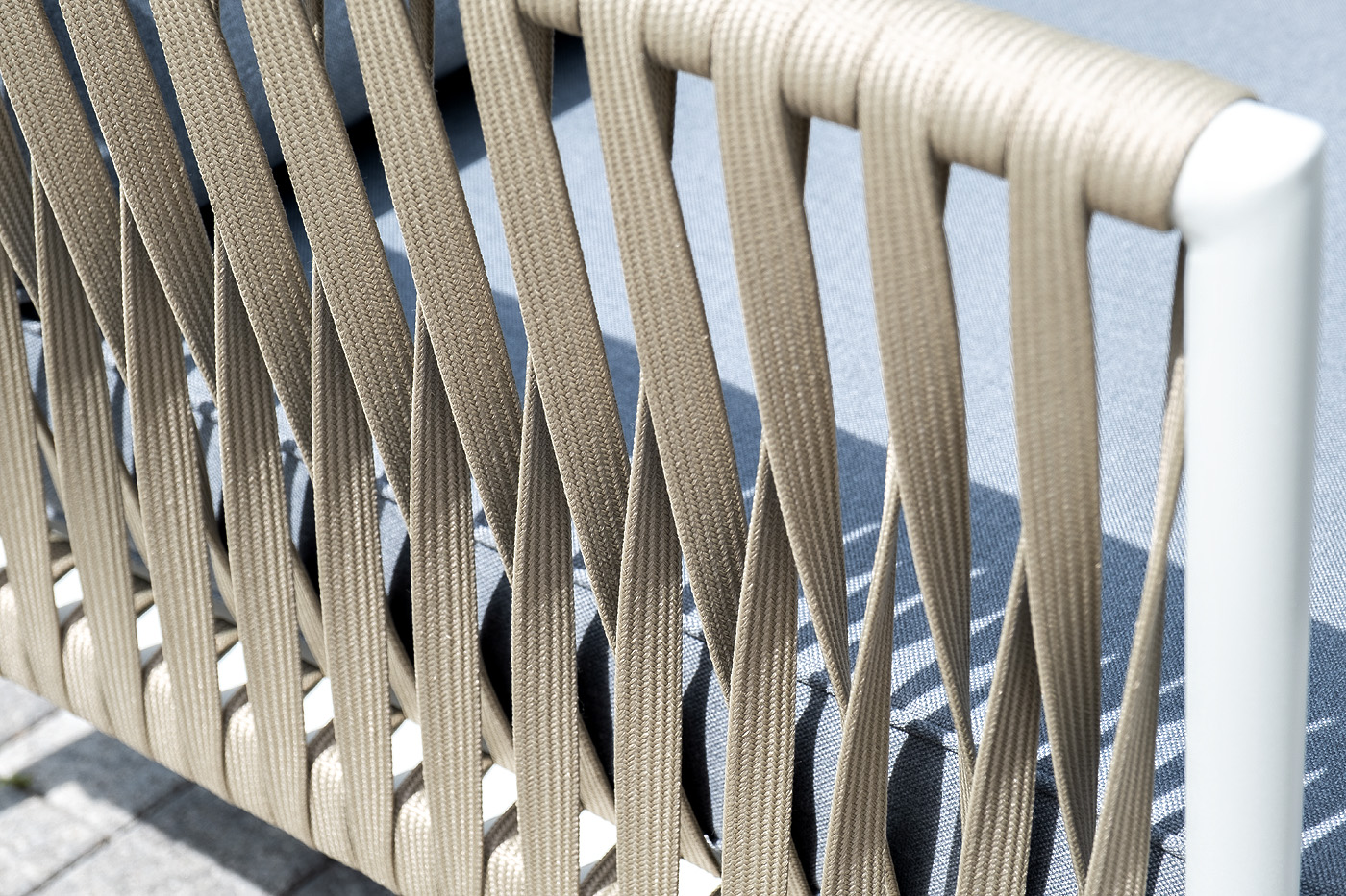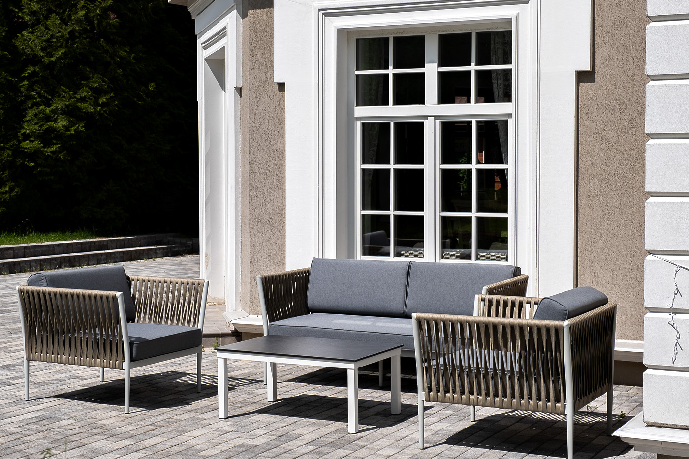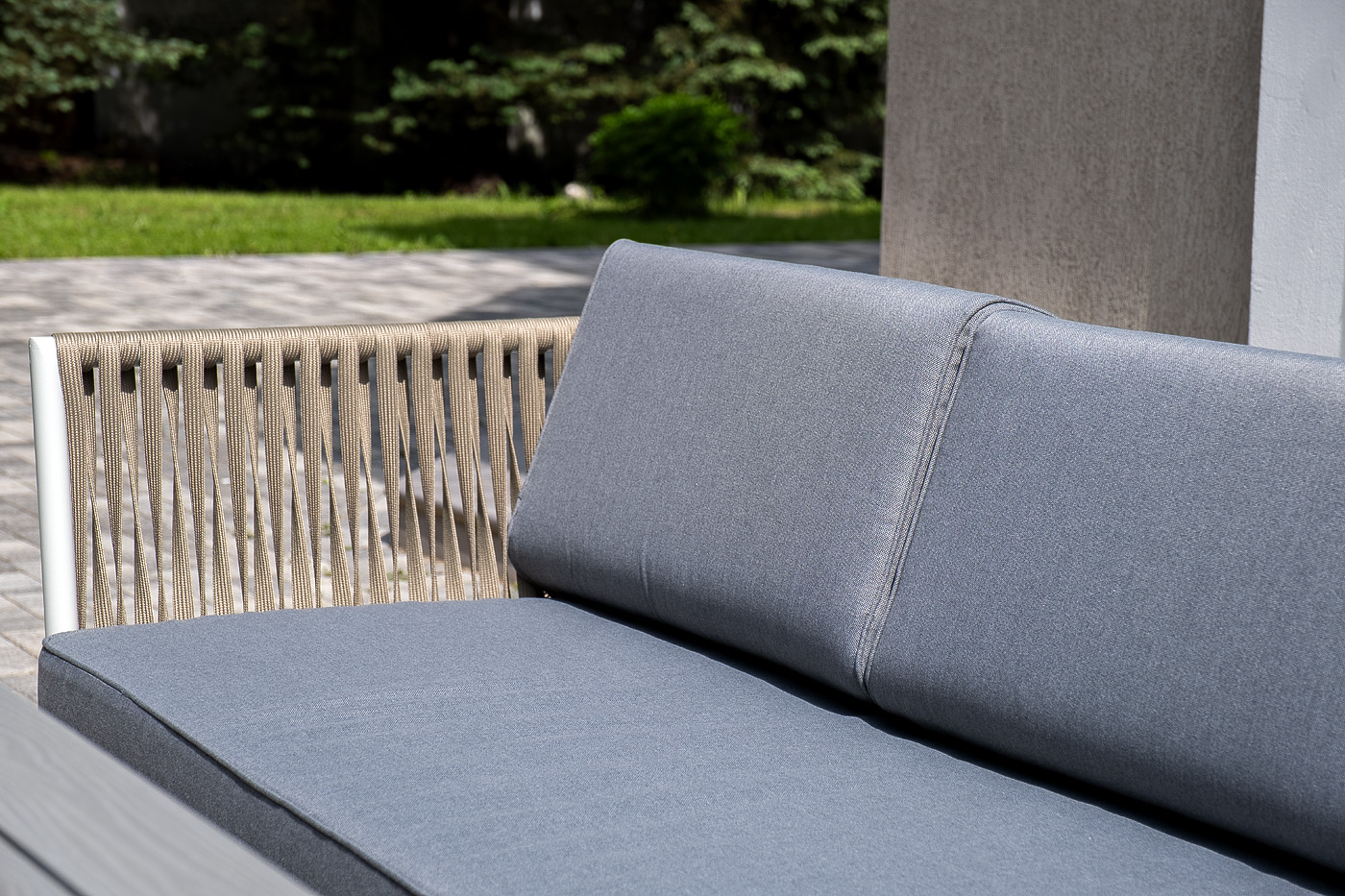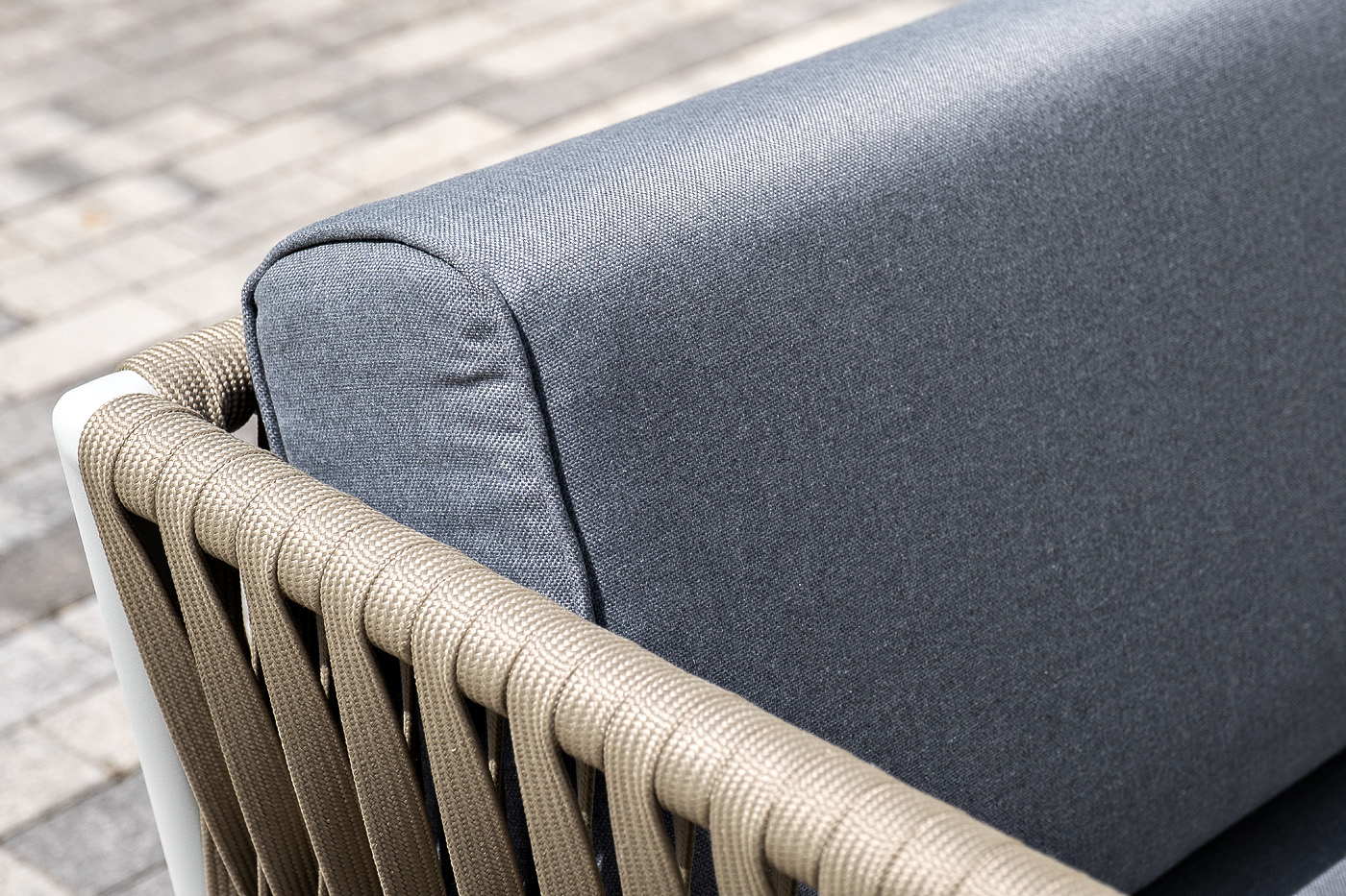 Диван и кресла изготовлены их алюминиевого прочного каркаса, оплетенного ручным способом роупом серо-коричневого цвета. Это эластичные ленты из полиэфирных волокон высокого качества.