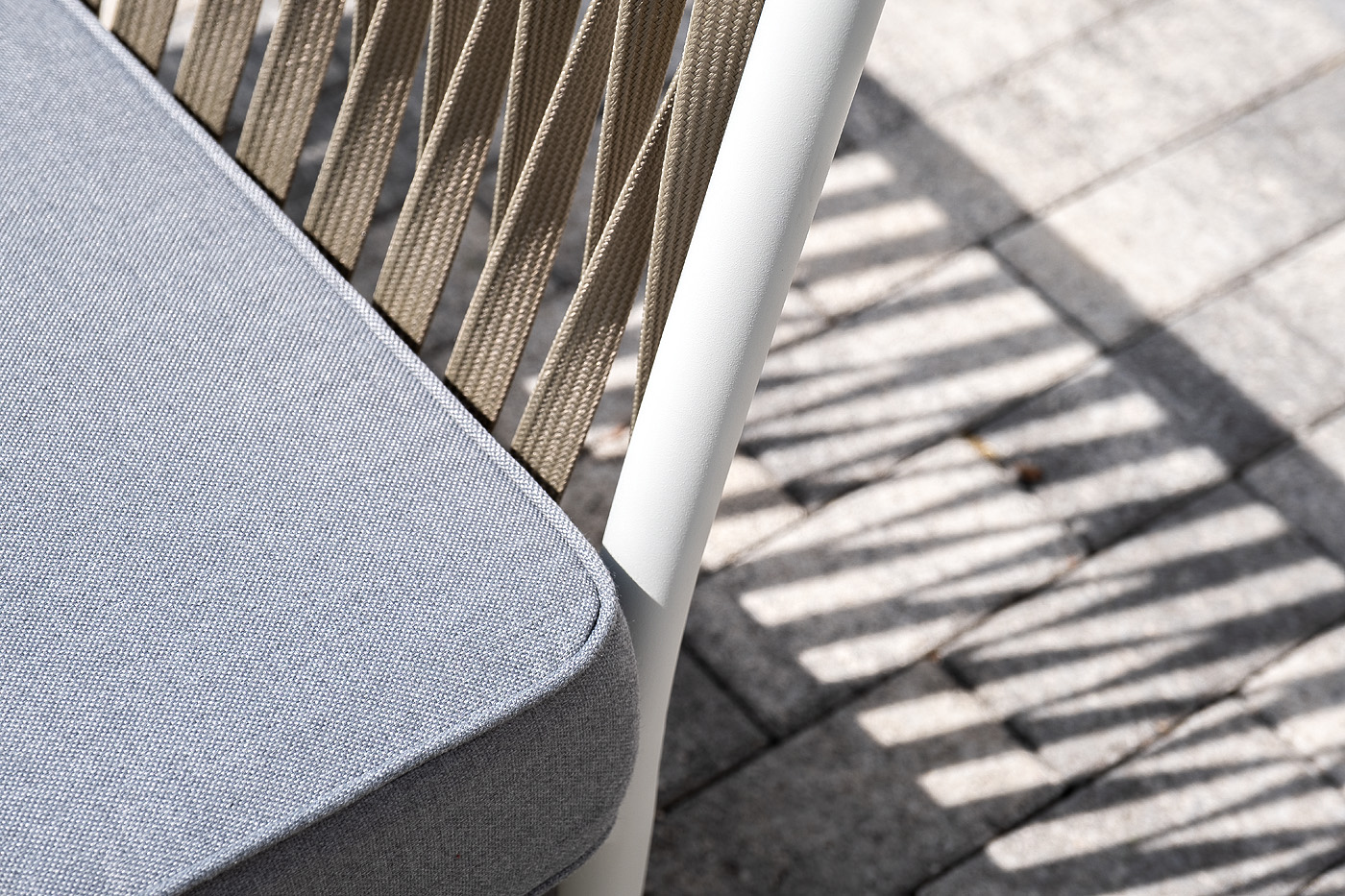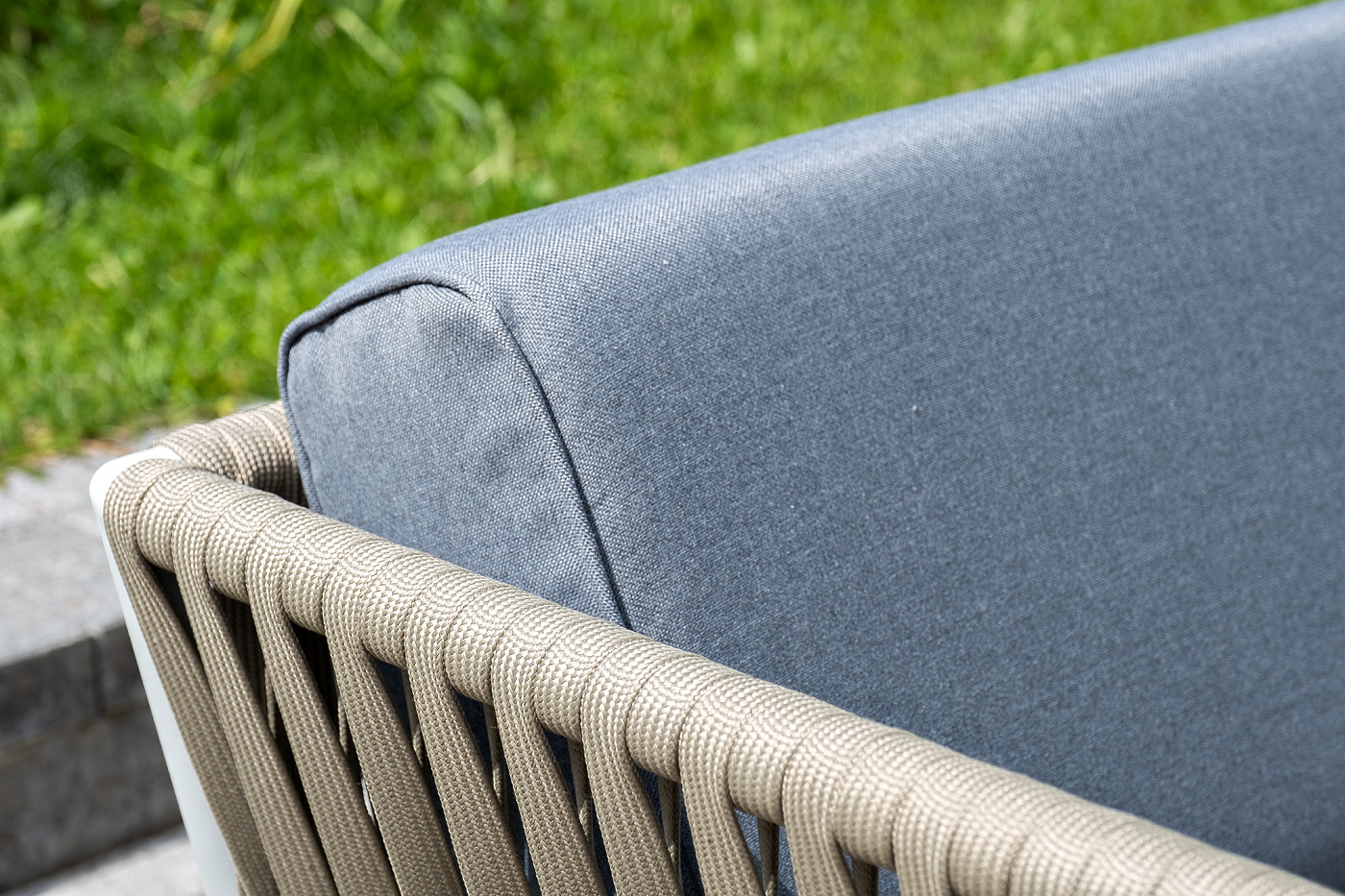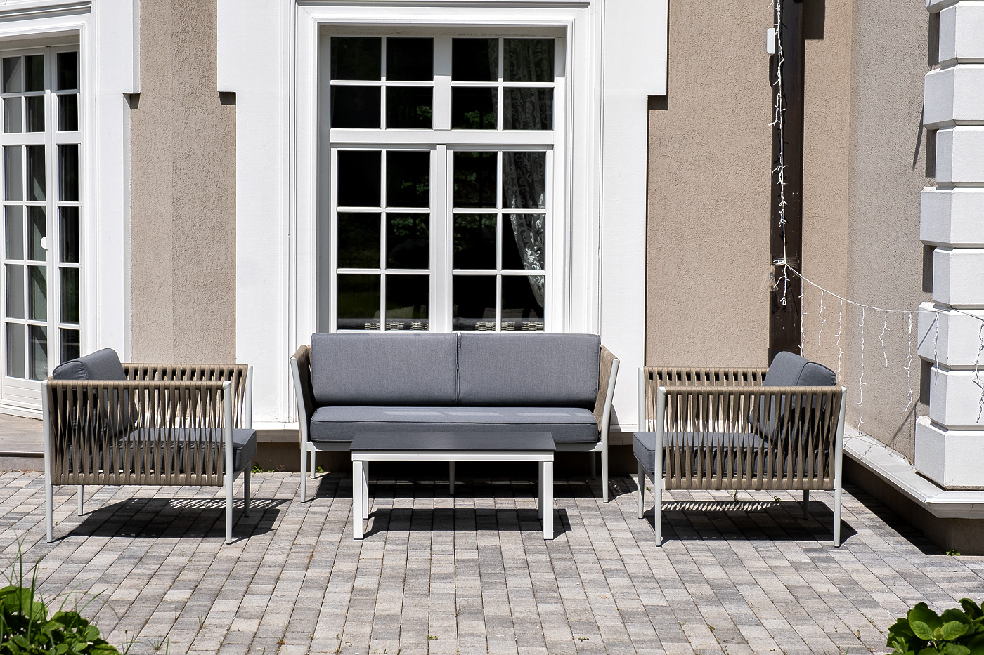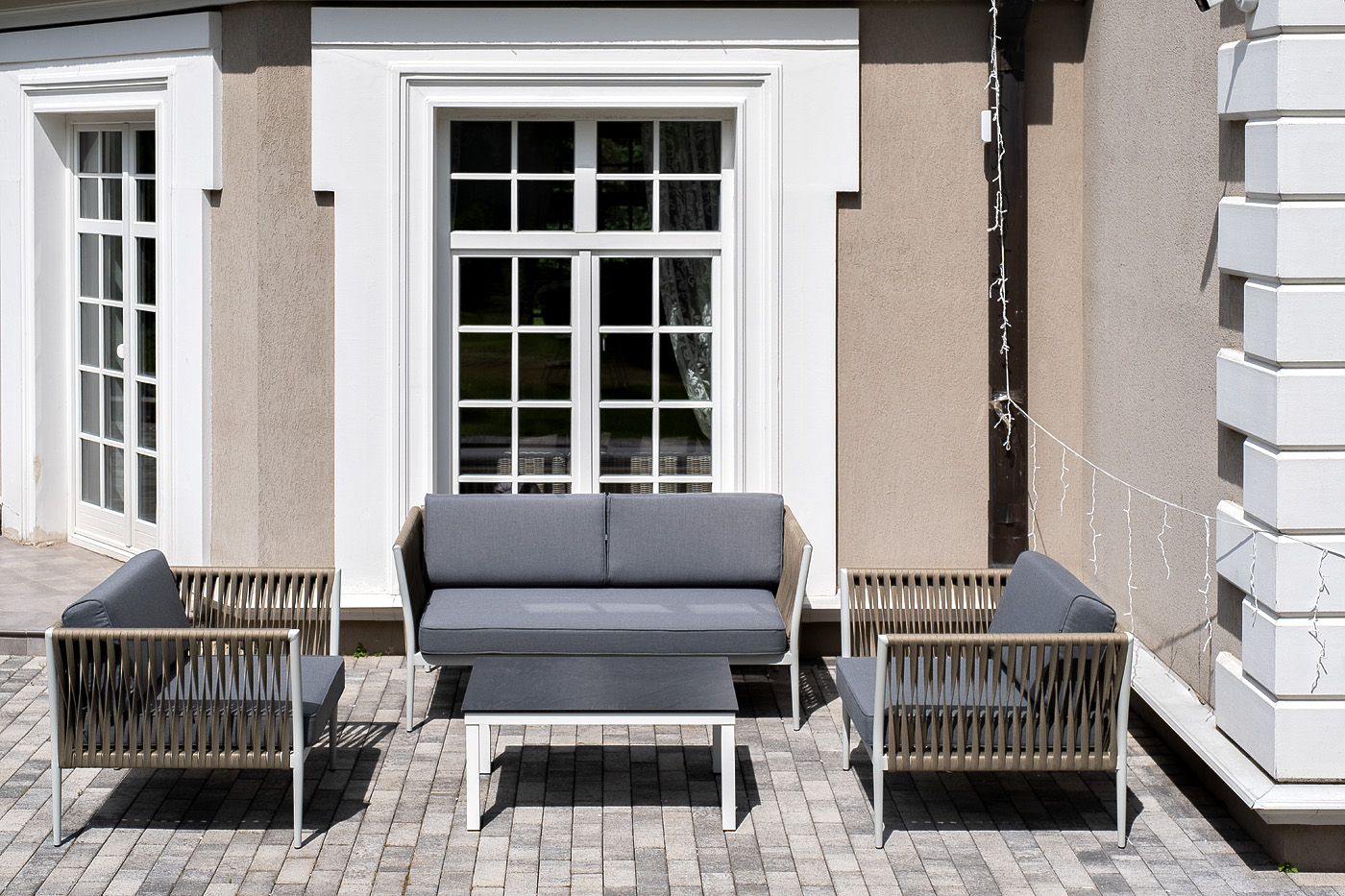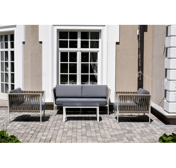 Диван и кресла изготовлены их алюминиевого прочного каркаса, оплетенного ручным способом роупом серо-коричневого цвета. Это эластичные ленты из полиэфирных волокон высокого качества.
