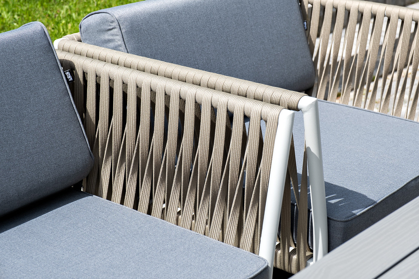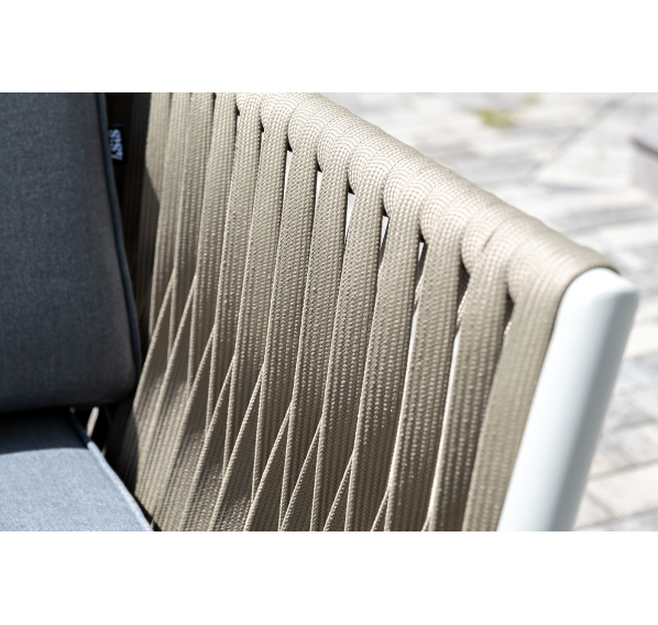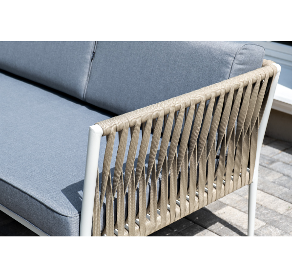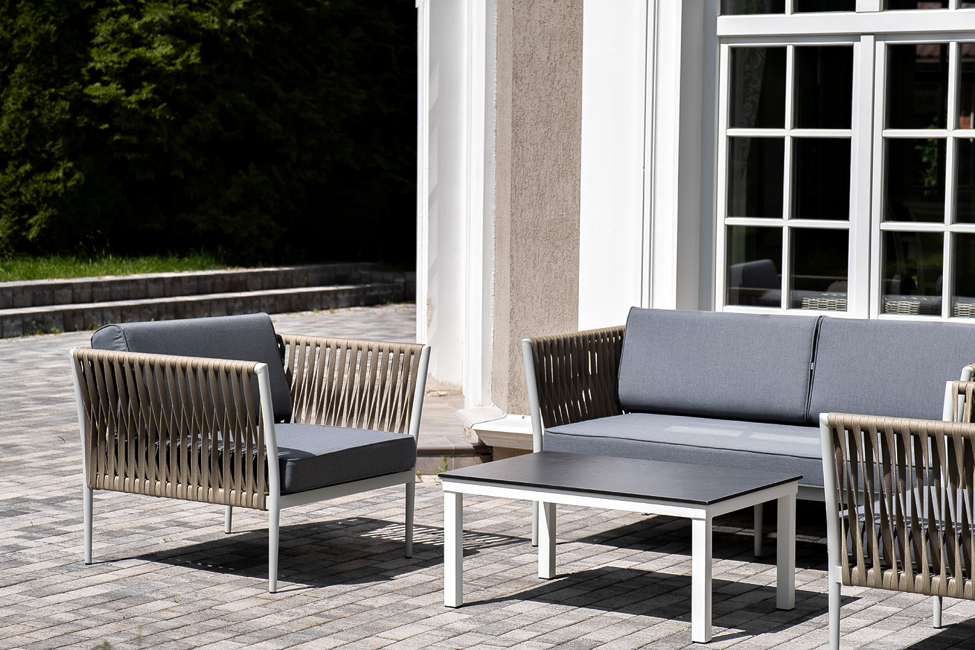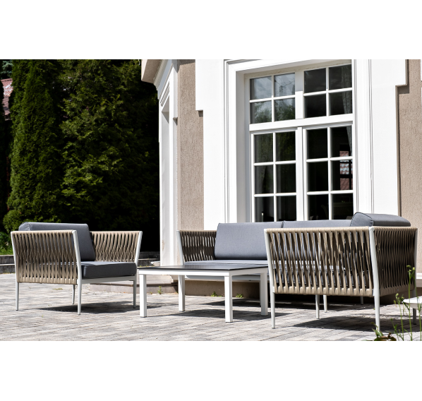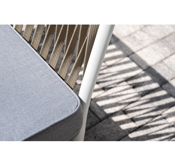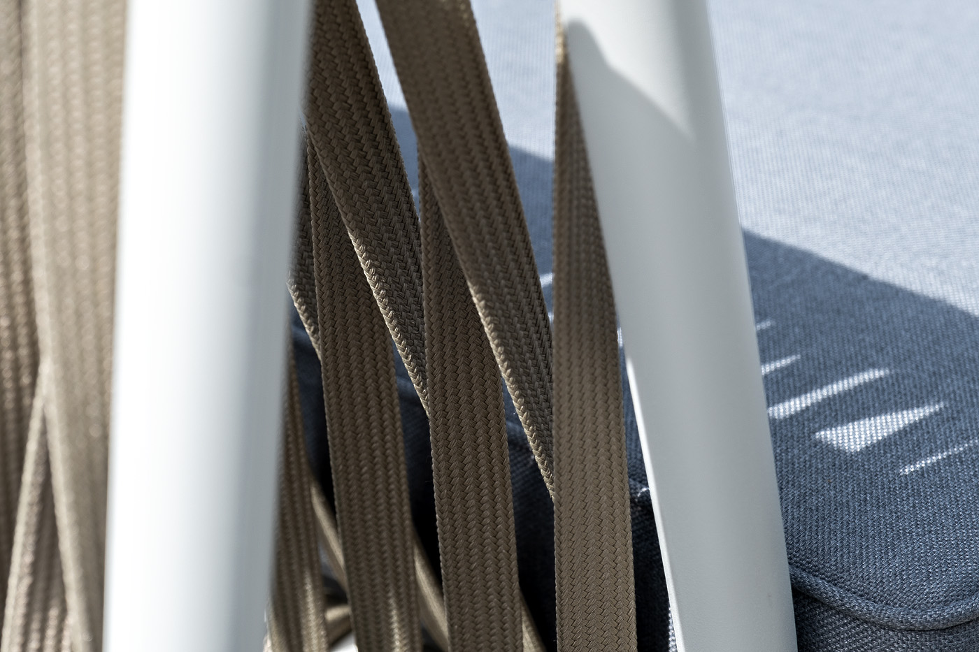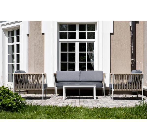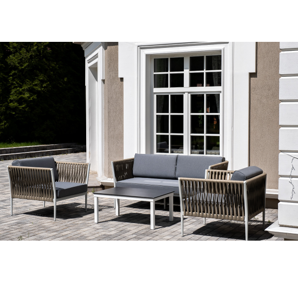 Диван и кресла изготовлены их алюминиевого прочного каркаса, оплетенного ручным способом роупом серо-коричневого цвета. Это эластичные ленты из полиэфирных волокон высокого качества.
