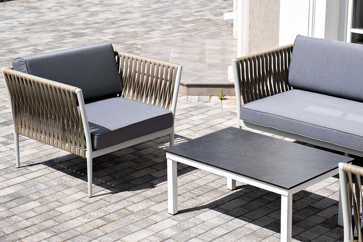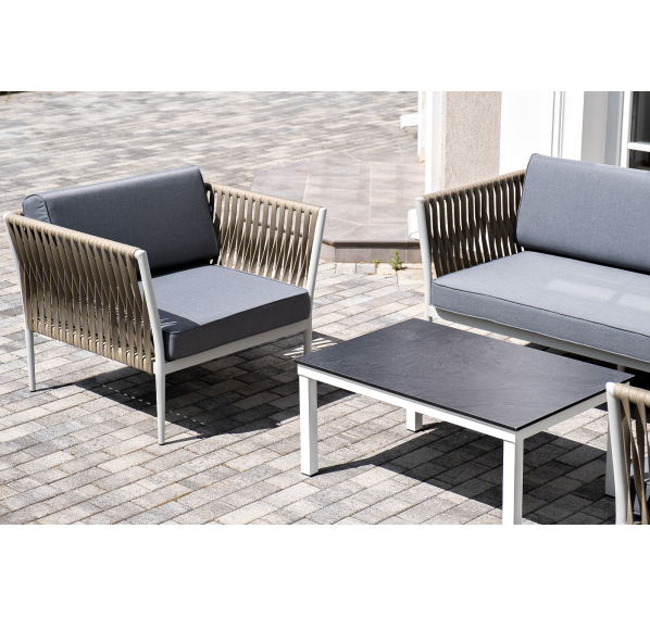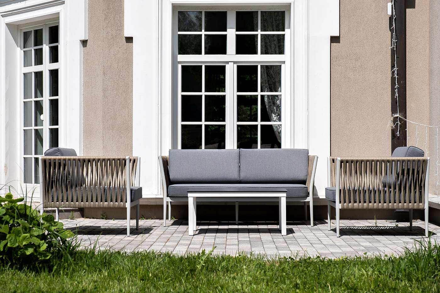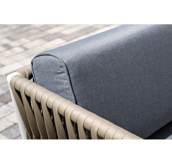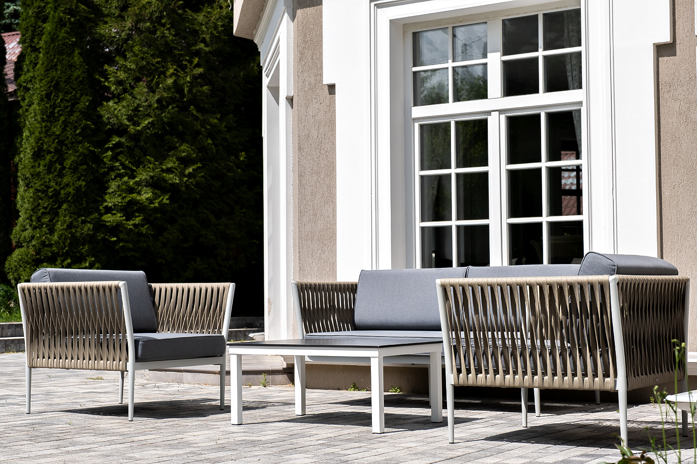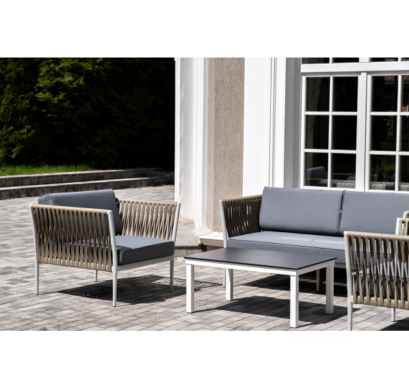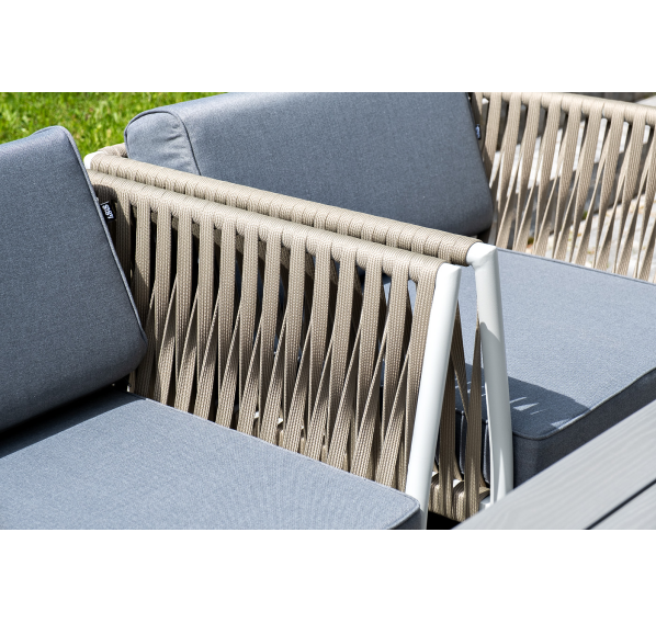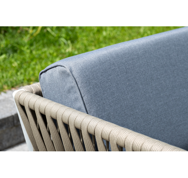 Диван и кресла изготовлены их алюминиевого прочного каркаса, оплетенного ручным способом роупом серо-коричневого цвета. Это эластичные ленты из полиэфирных волокон высокого качества.