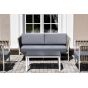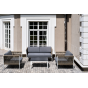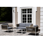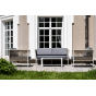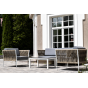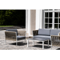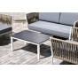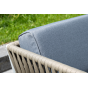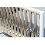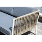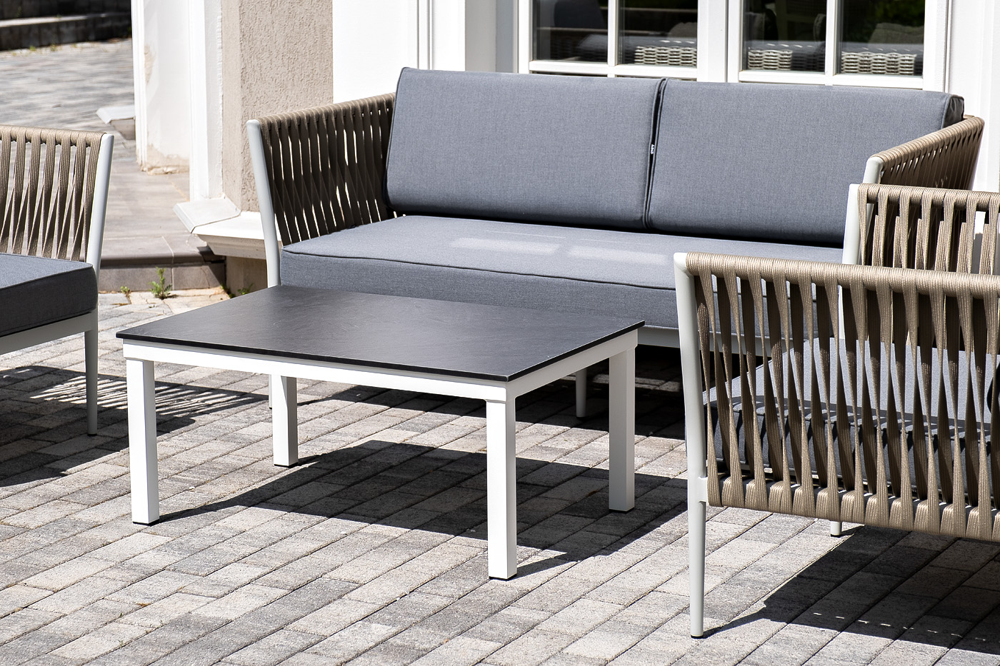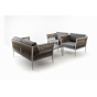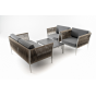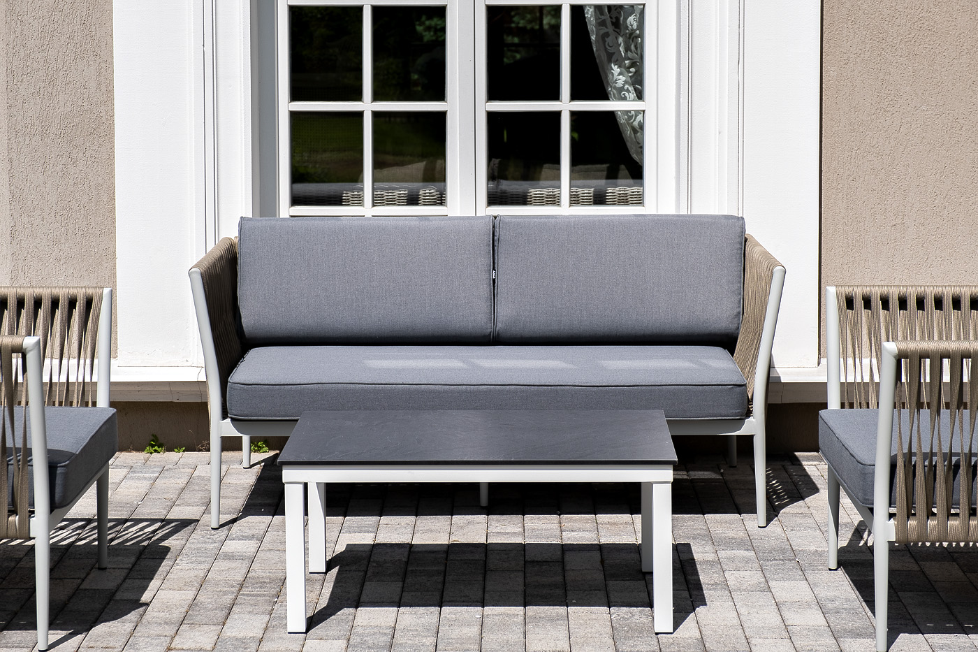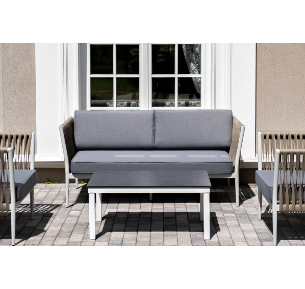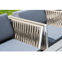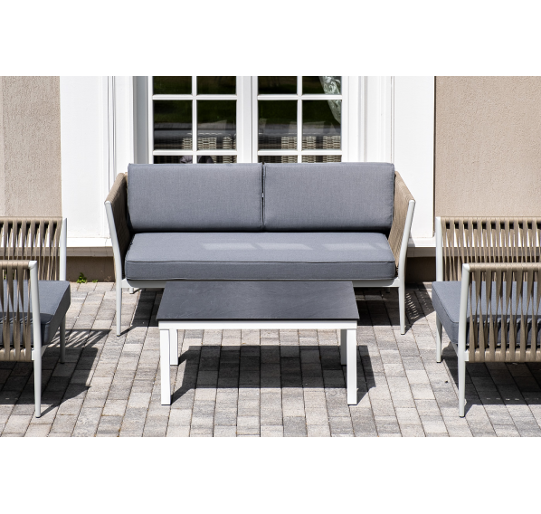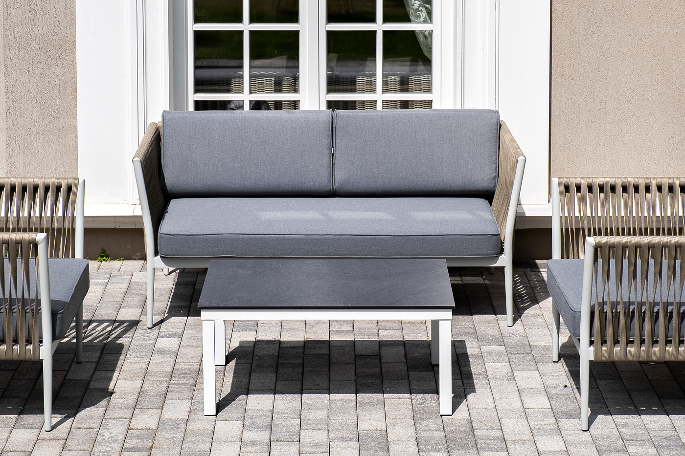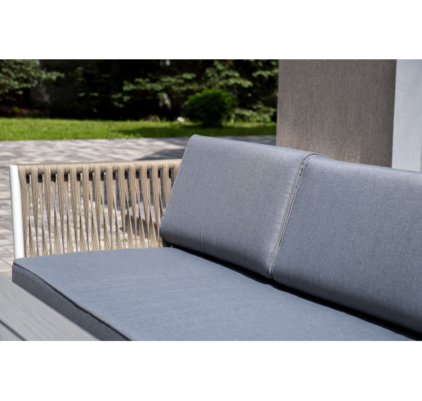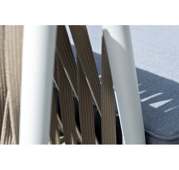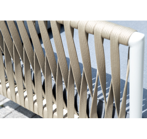 Диван и кресла изготовлены их алюминиевого прочного каркаса, оплетенного ручным способом роупом серо-коричневого цвета. Это эластичные ленты из полиэфирных волокон высокого качества.