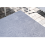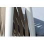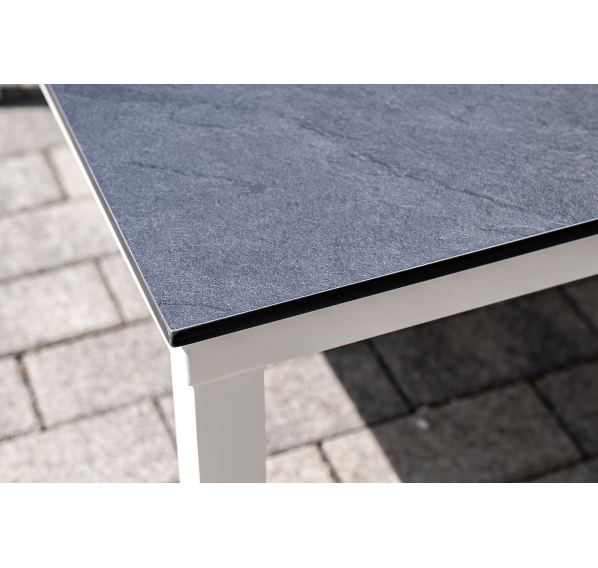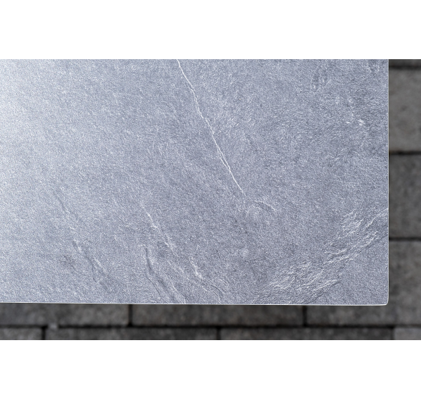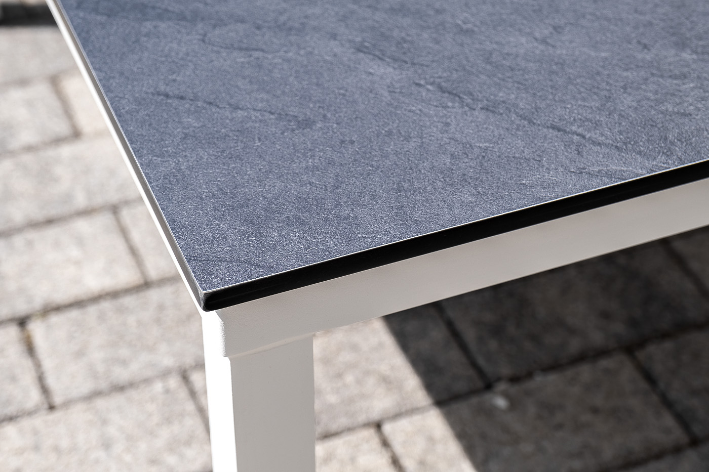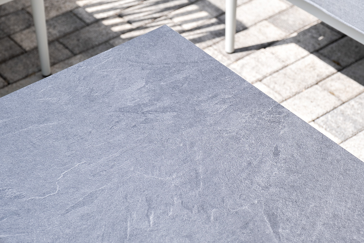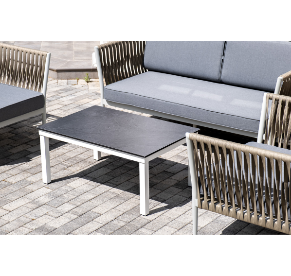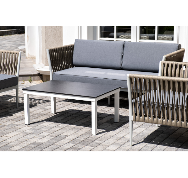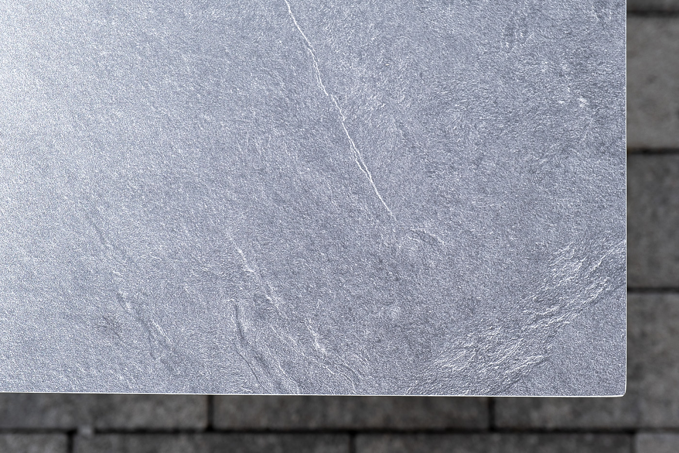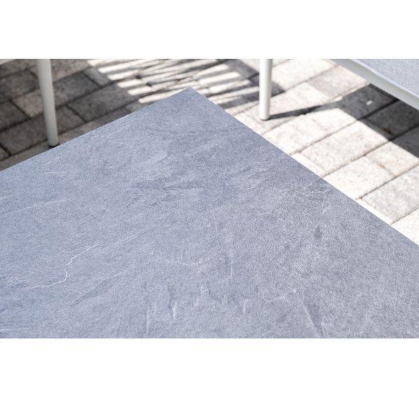 Журнальный столик также имеет алюминиевый каркас белого цвета. Столешница выполнена из монолитного компакт-пластика HPL цвета "серый гранит".