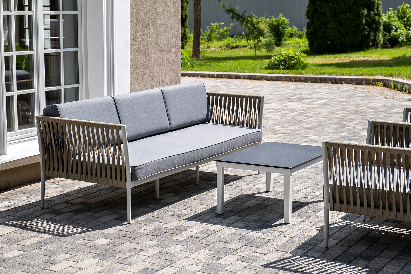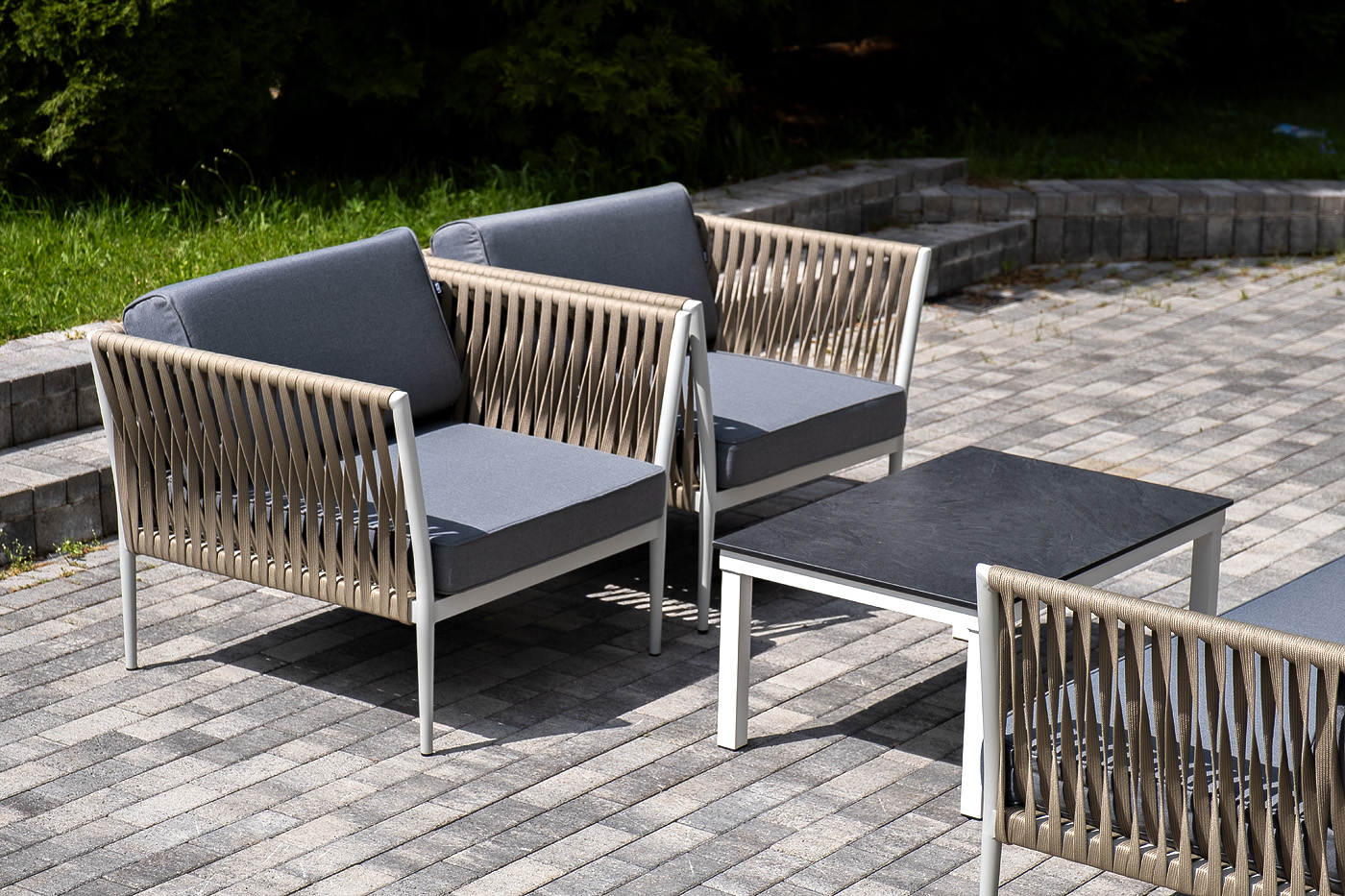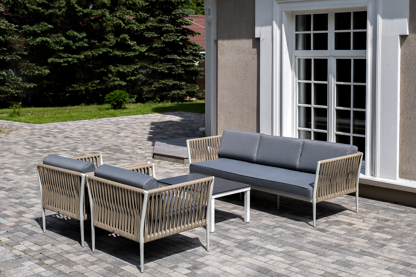 Диван и кресла изготовлены их алюминиевого прочного каркаса, оплетенного ручным способом роупом серо-коричневого цвета. Это эластичные ленты из полиэфирных волокон высокого качества.