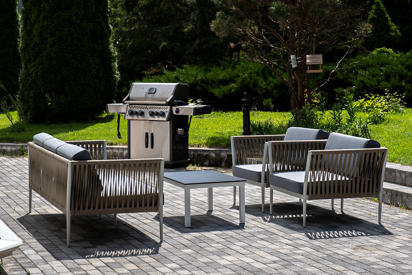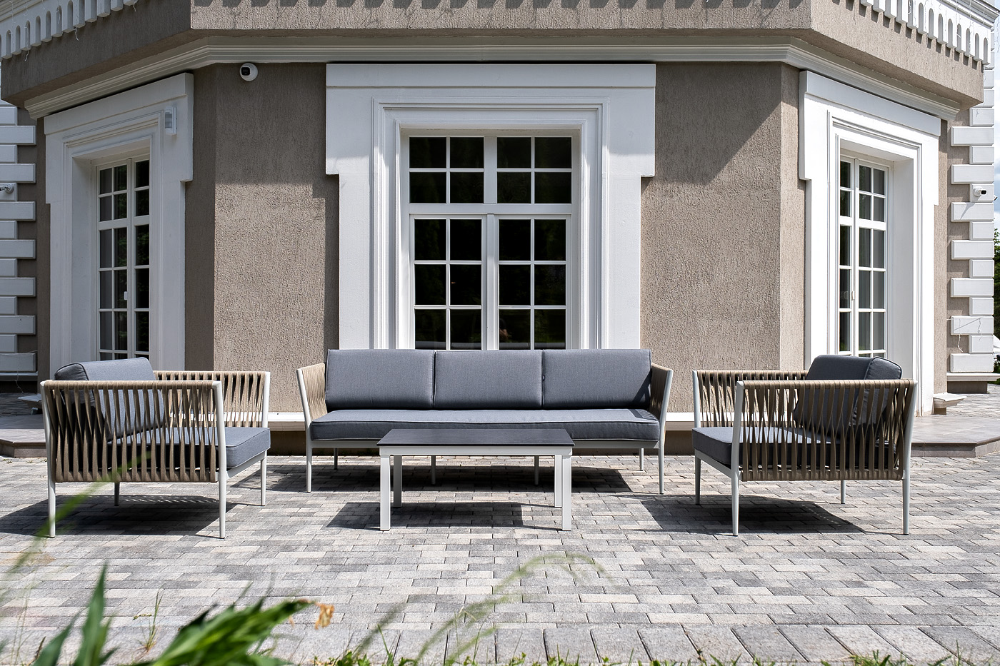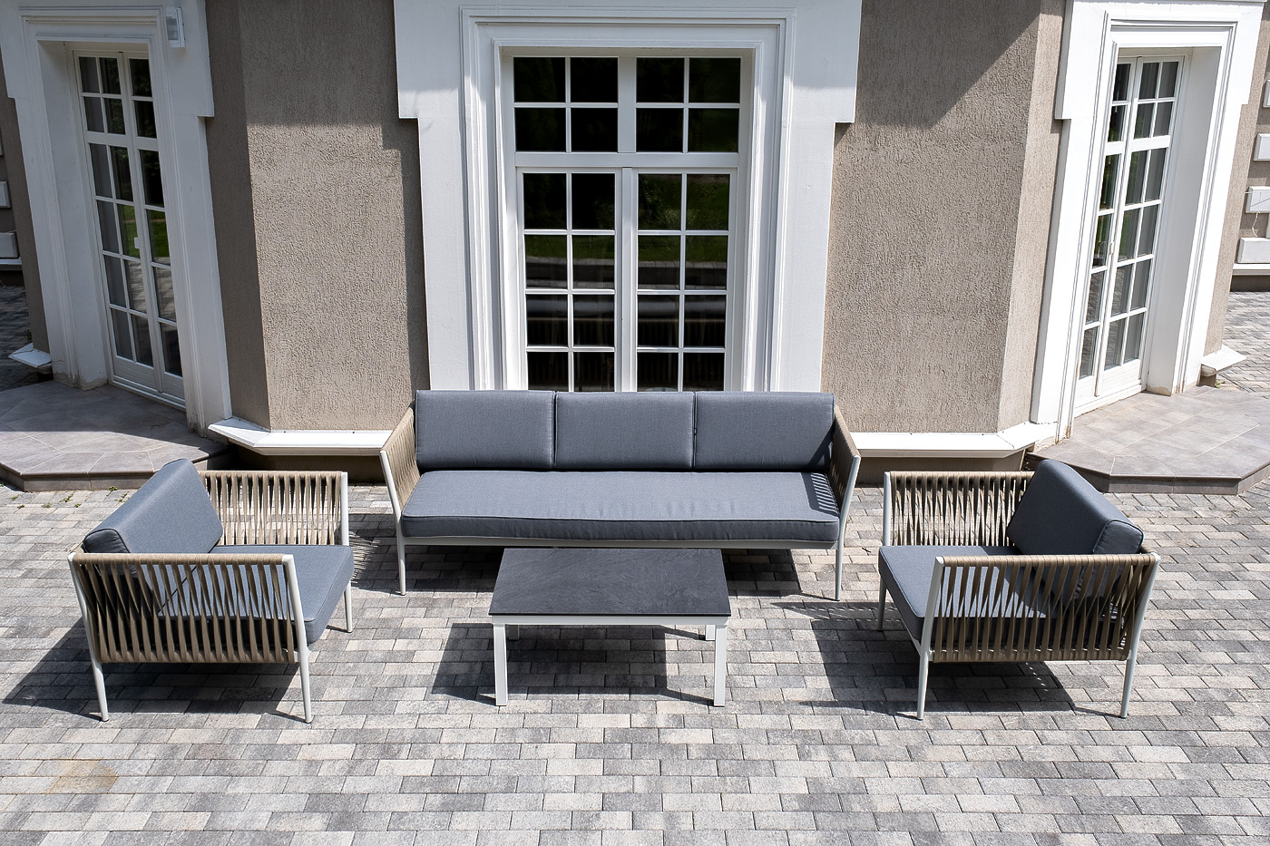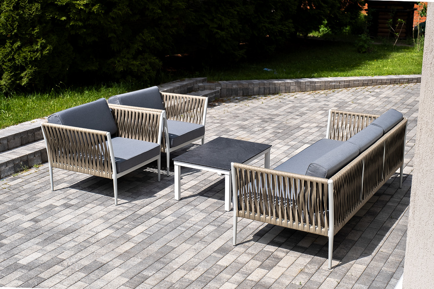 Диван и кресла изготовлены их алюминиевого прочного каркаса, оплетенного ручным способом роупом серо-коричневого цвета. Это эластичные ленты из полиэфирных волокон высокого качества.