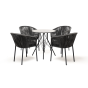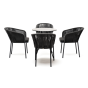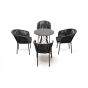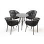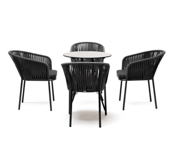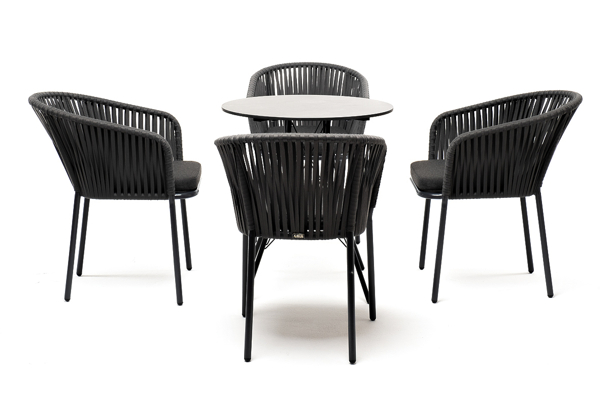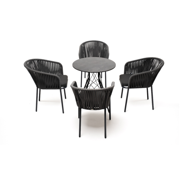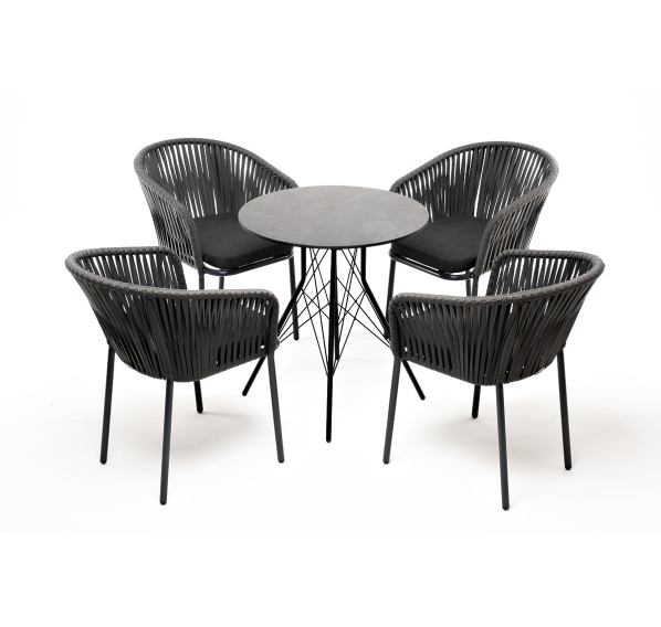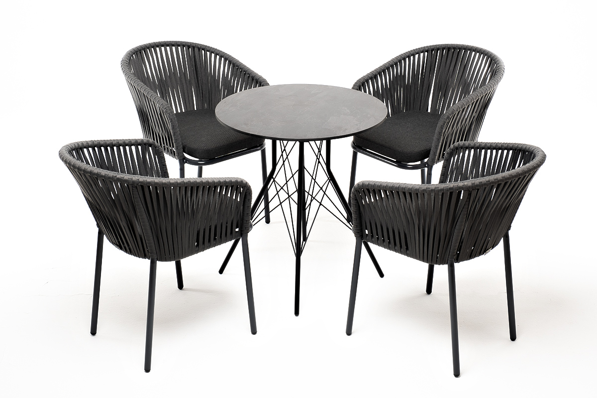 4 кресла из коллекции «Бордо», выполненных из алюминиевого каркаса и ручной оплетки роупом. Это эластичные синтетические ленты из высокопрочных полиэфирных волокон, представлены в темно-сером цвете.