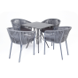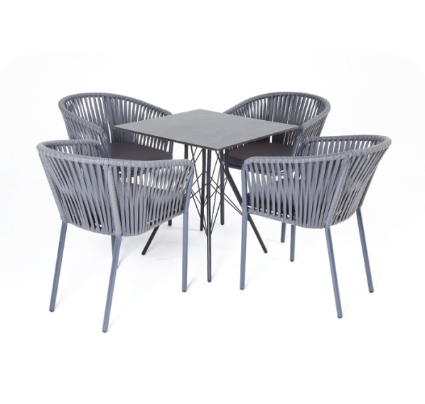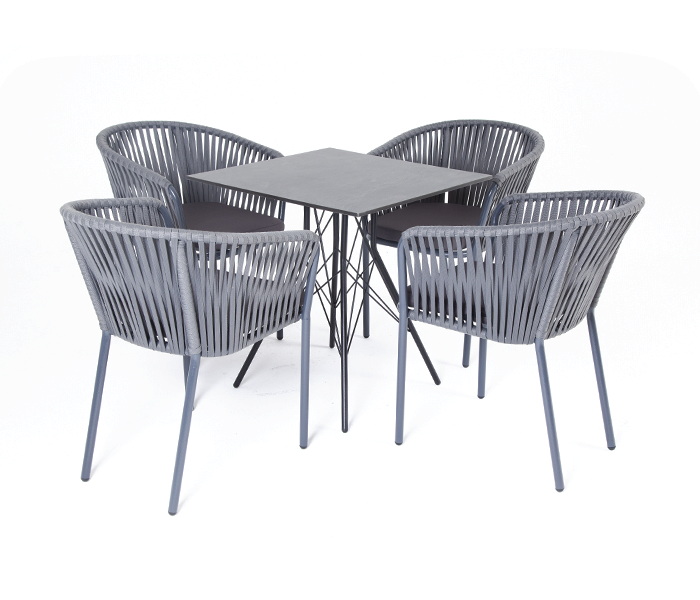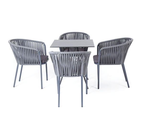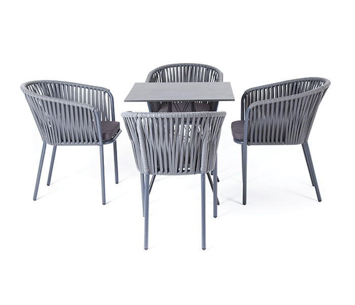 4 кресла из коллекции «Бордо», выполненных из алюминиевого каркаса и ручной оплетки роупом. Это эластичные синтетические ленты из высокопрочных полиэфирных волокон, представлены в сером цвете.