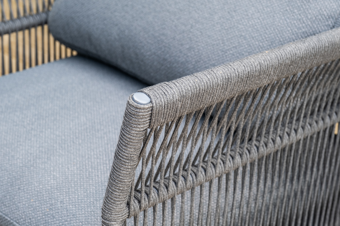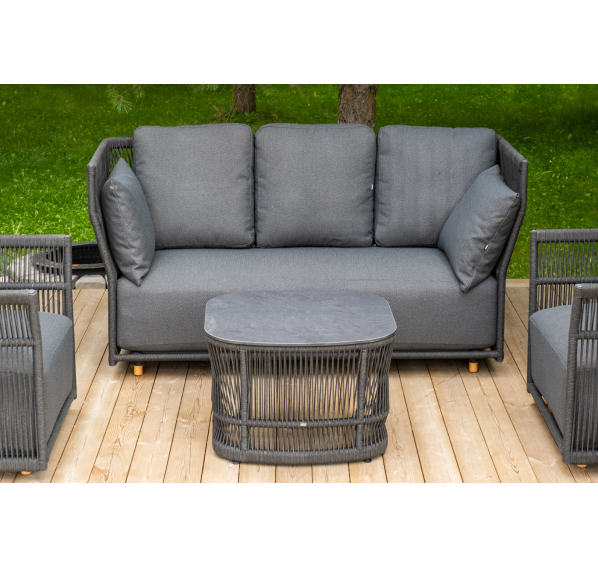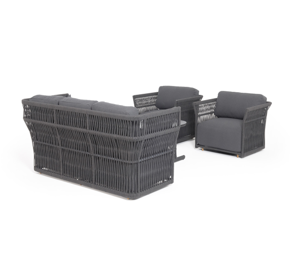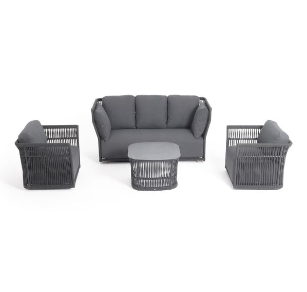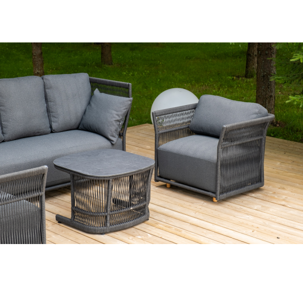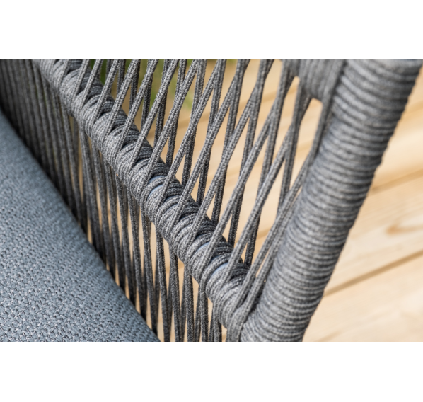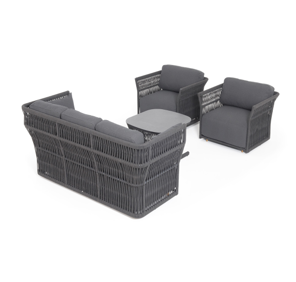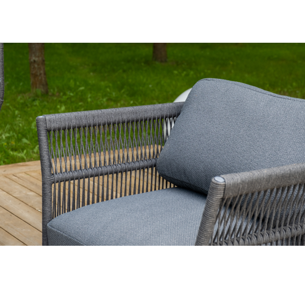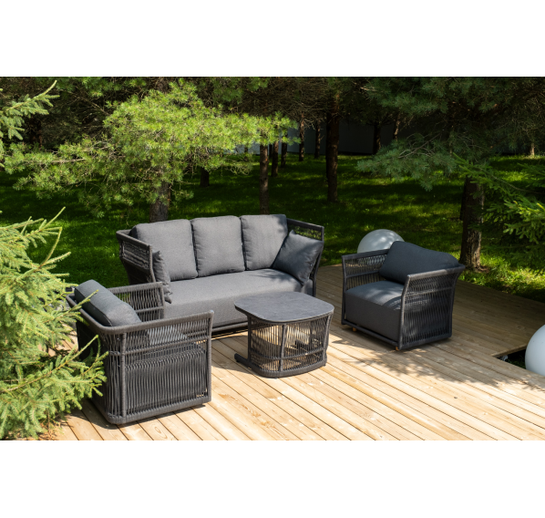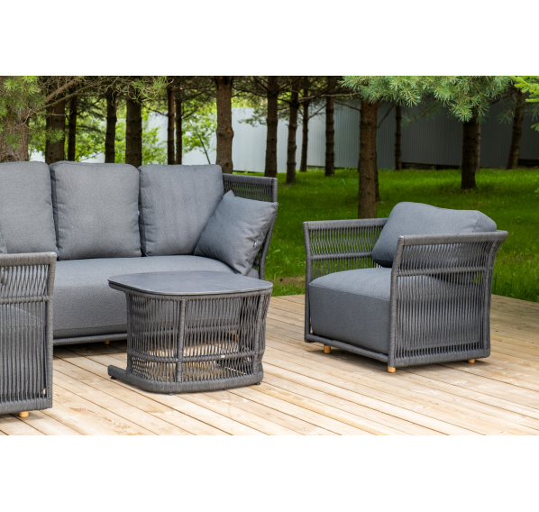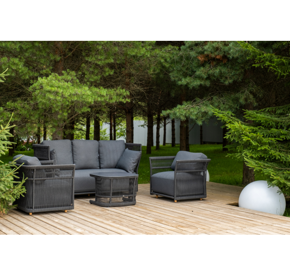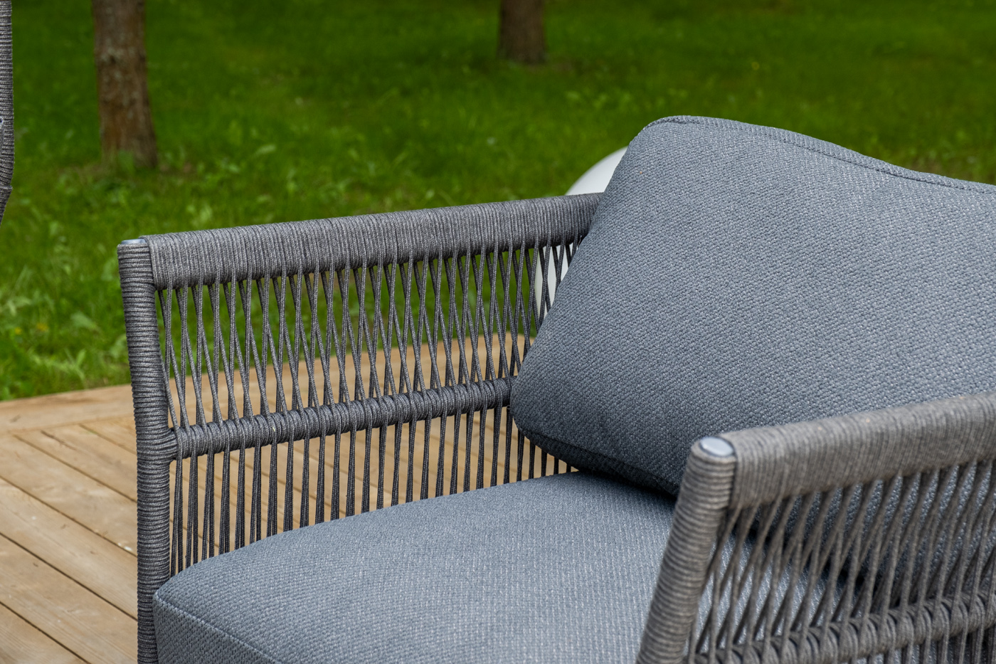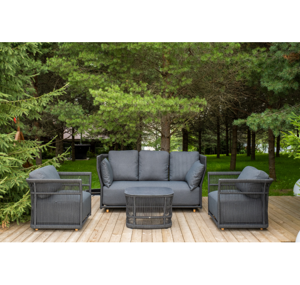 Каркас уличной мебели выполнен из износостойкого алюминия. Его дополняет темно-серая ручная оплетка, изготовленная на основе эластичных синтетических лент из полиэфирных волокон высокой прочности (роупа). На ножках дивана и кресел идут дубовые наконечники (заглушки).