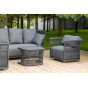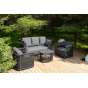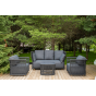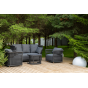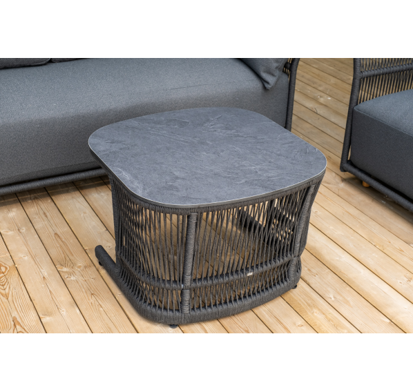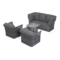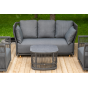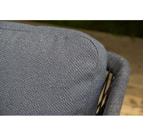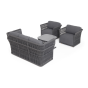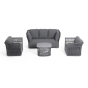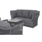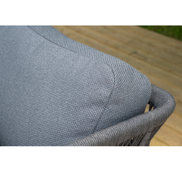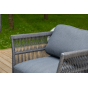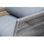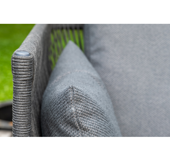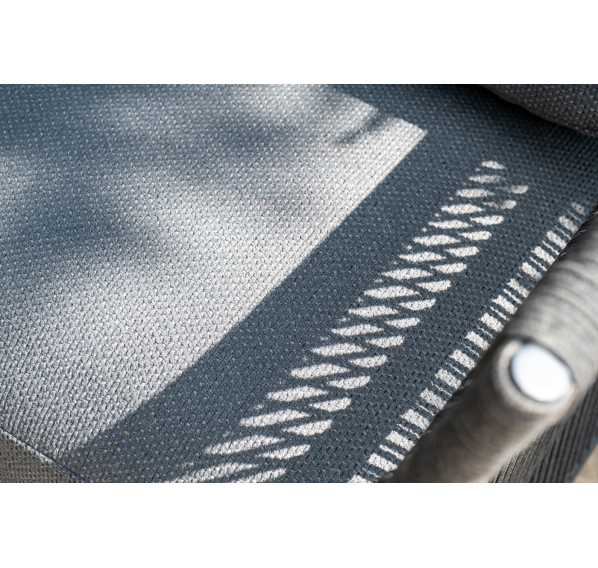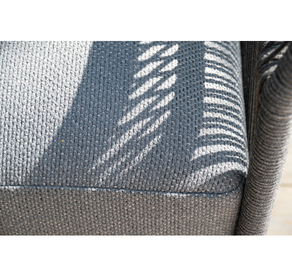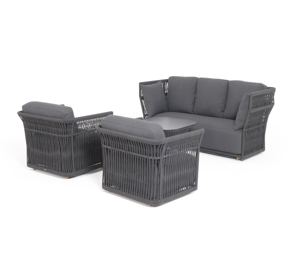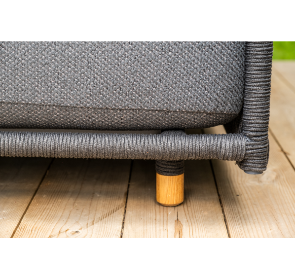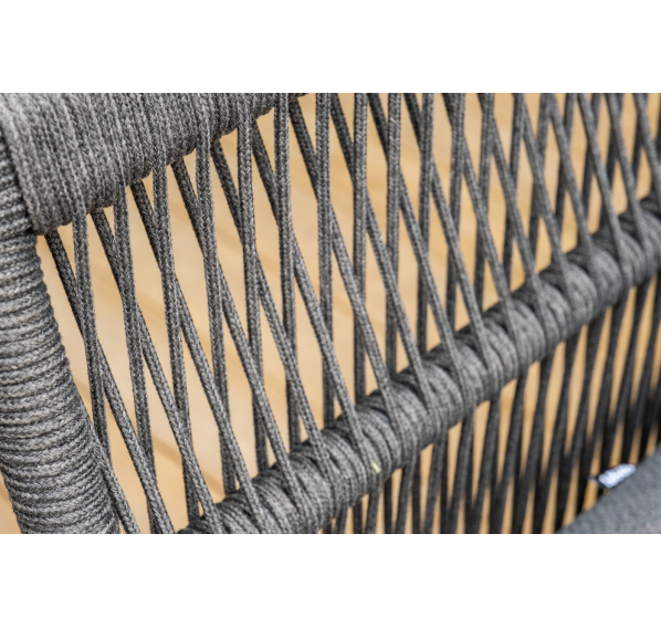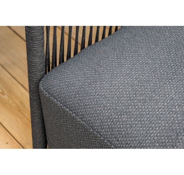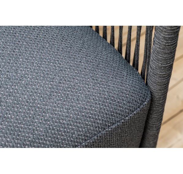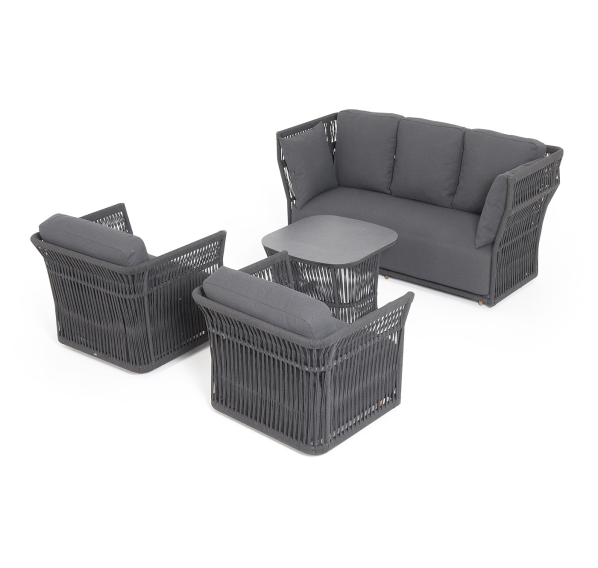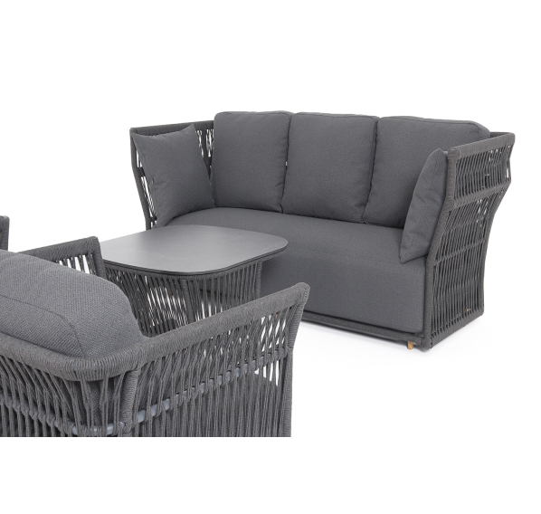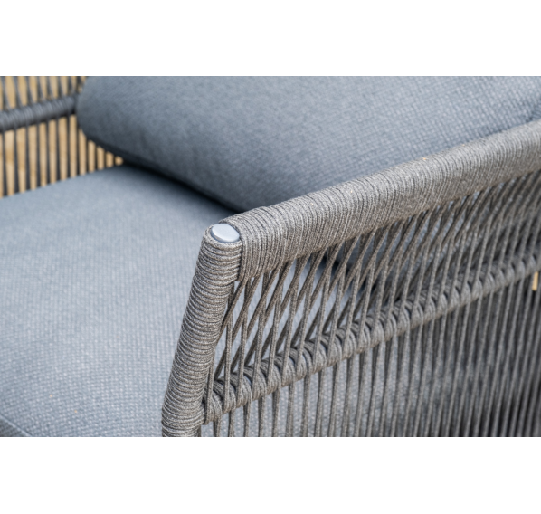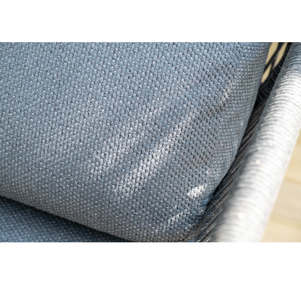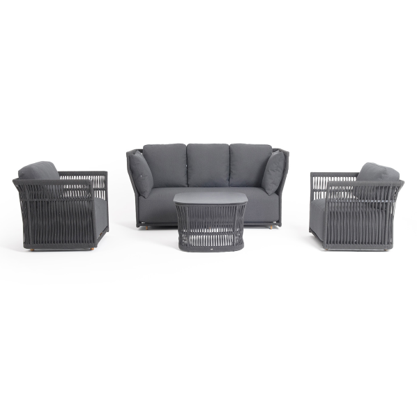 Каркас уличной мебели выполнен из износостойкого алюминия. Его дополняет темно-серая ручная оплетка, изготовленная на основе эластичных синтетических лент из полиэфирных волокон высокой прочности (роупа). На ножках дивана и кресел идут дубовые наконечники (заглушки).
