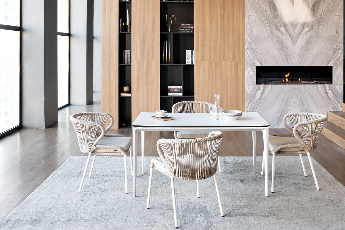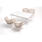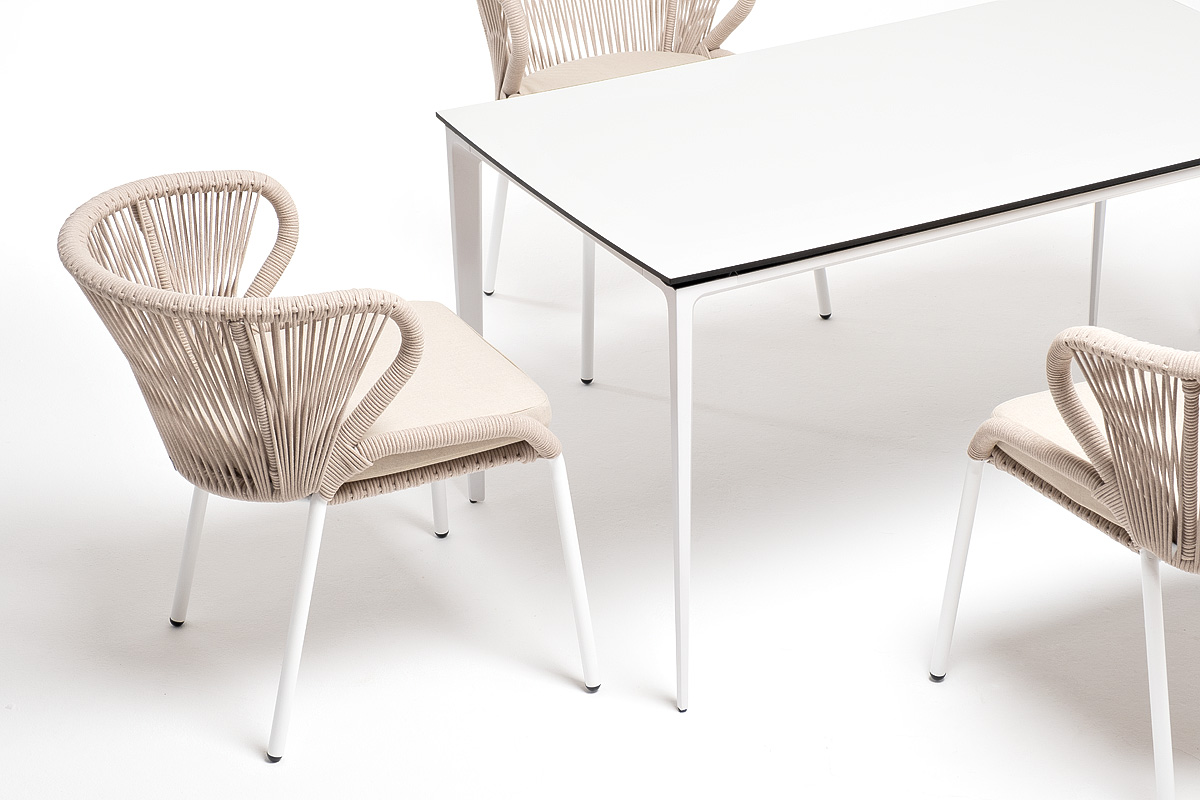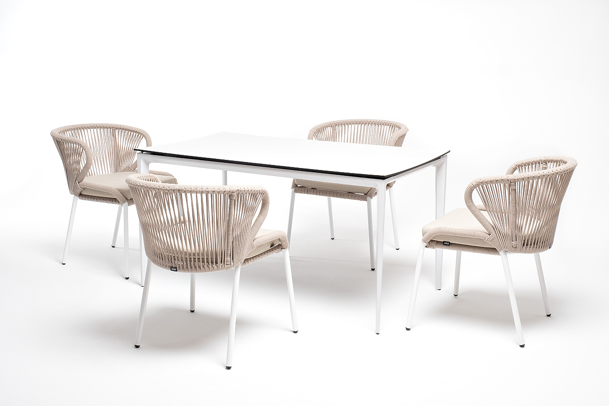 В этот комплект входит стол с прочной и стильной столешницей из HPL-пластика размером 1400×800 мм и высотой 75 см (цвет столешницы - молочный), а также 4 плетеных стула «Милан», изготовленных из бежевого роупа с белым алюминиевым каркасом.