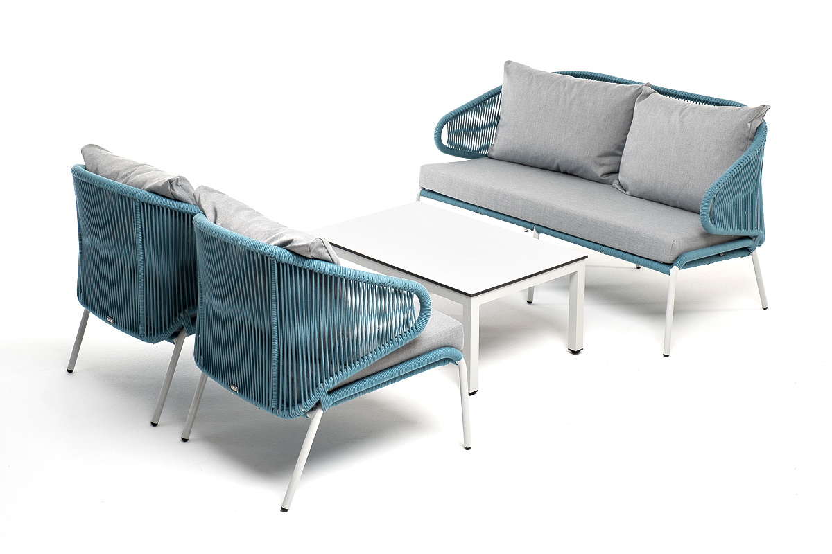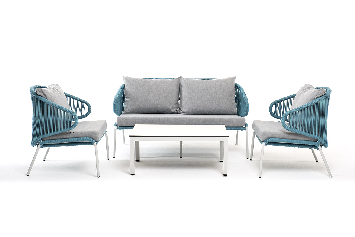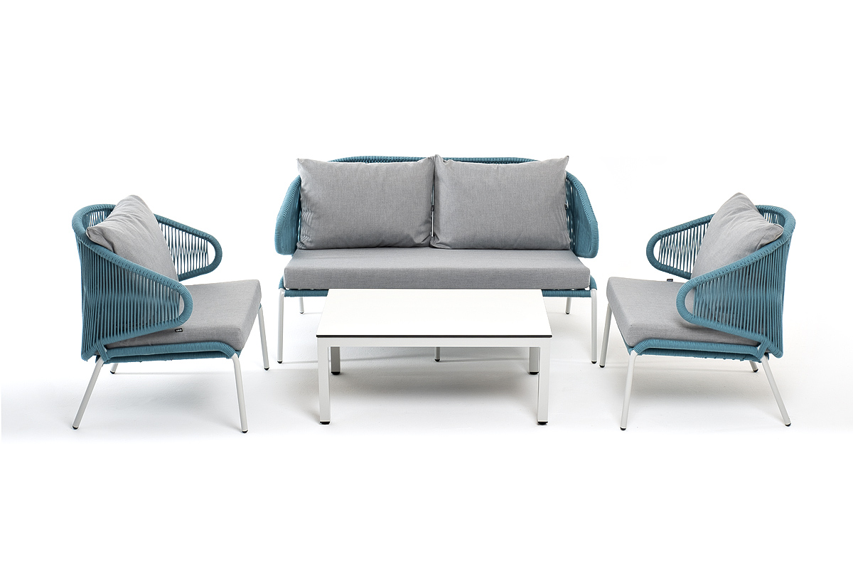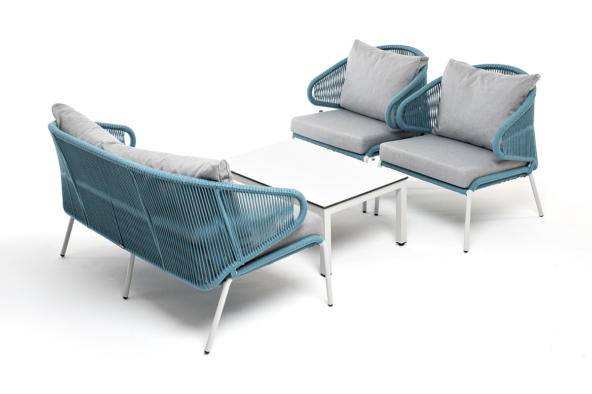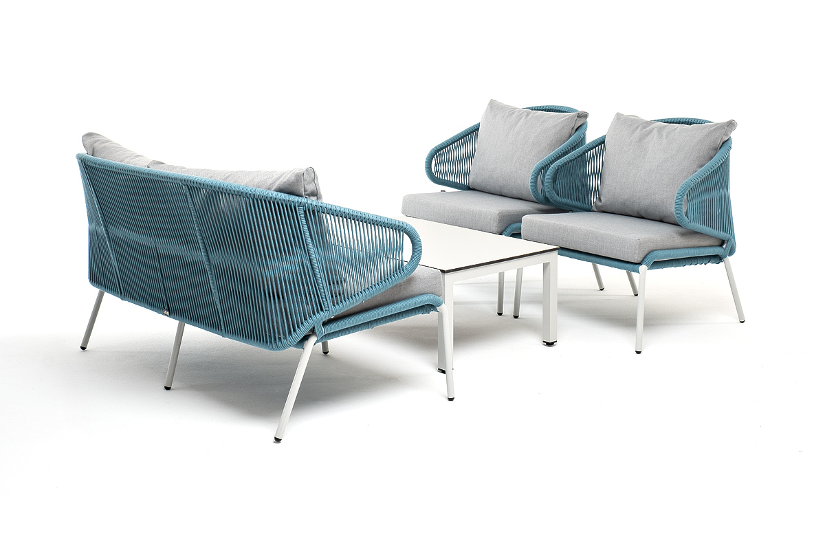 Каркас уличной мебели выполнен из износостойкого алюминия. Его дополняет бирюзовая ручная оплетка, изготовленная на основе эластичных синтетических лент из полиэфирных волокон высокой прочности (роупа).
