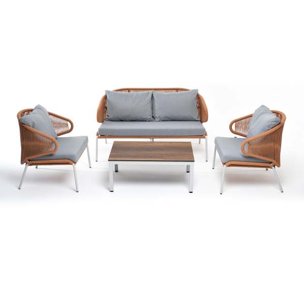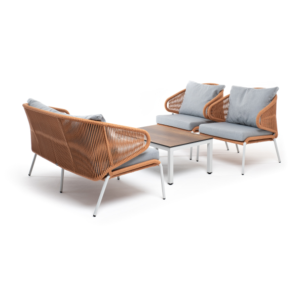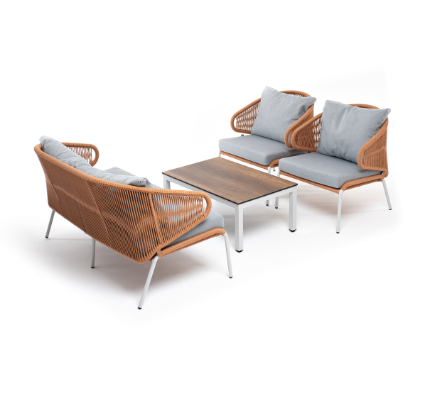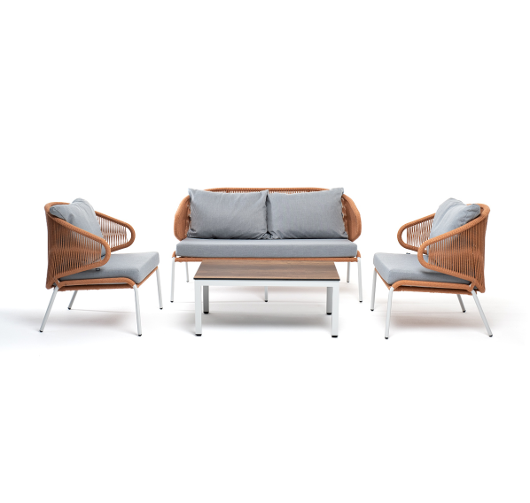 Каркас уличной мебели выполнен из износостойкого алюминия. Его дополняет оплетка цвета оранжевый меланж, изготовленная на основе эластичных синтетических лент из полиэфирных волокон высокой прочности.