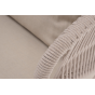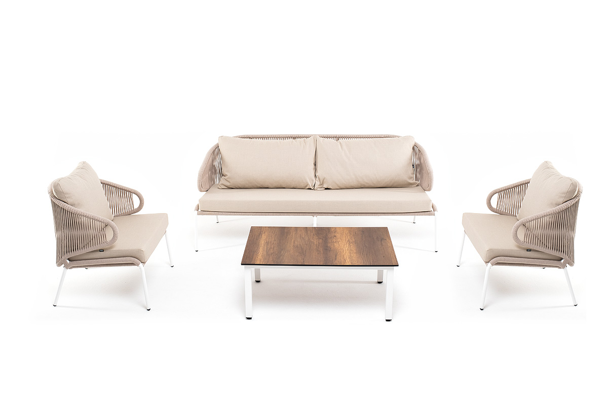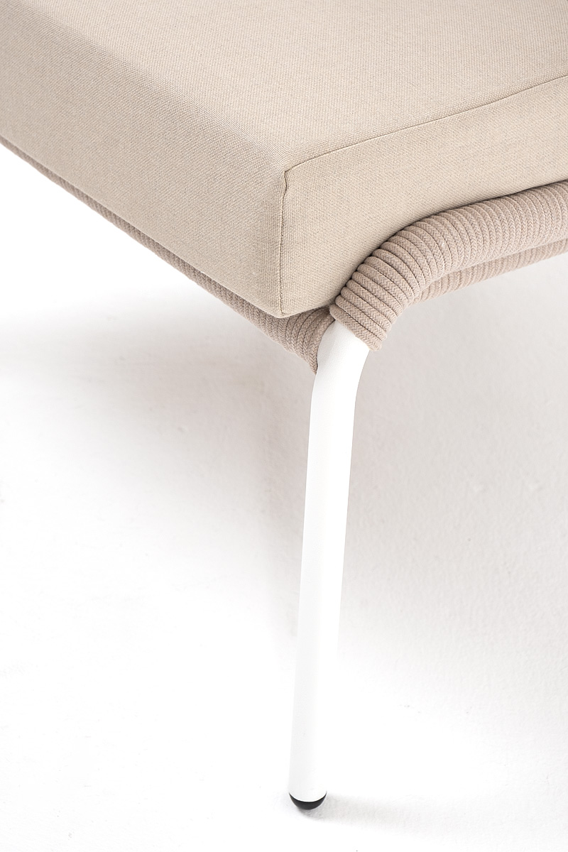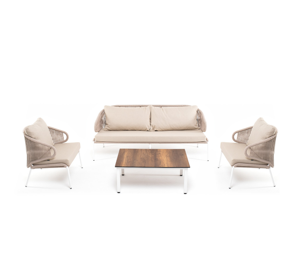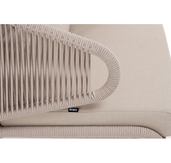 Каркас уличной мебели выполнен из износостойкого алюминия. Его дополняет бежевая ручная оплетка, изготовленная на основе эластичных синтетических лент из полиэфирных волокон высокой прочности (роупа).