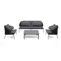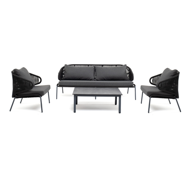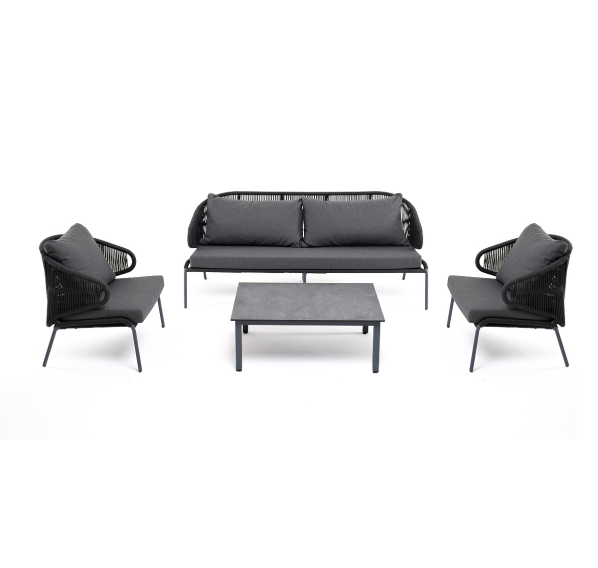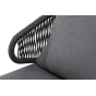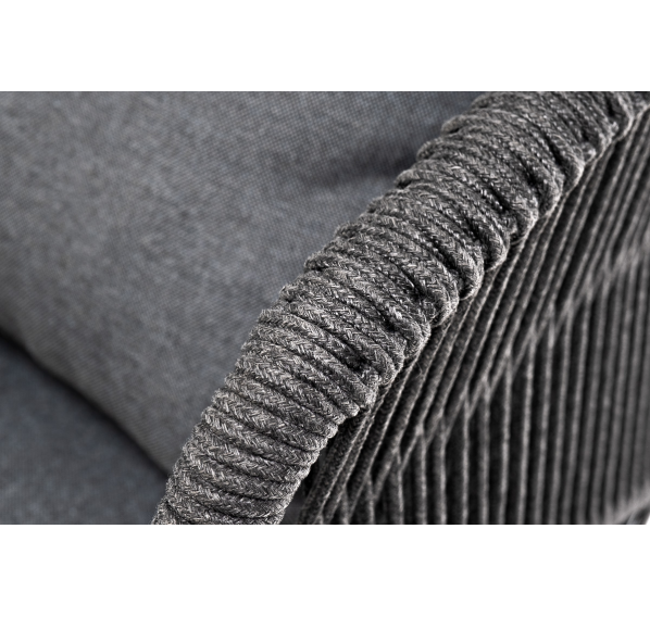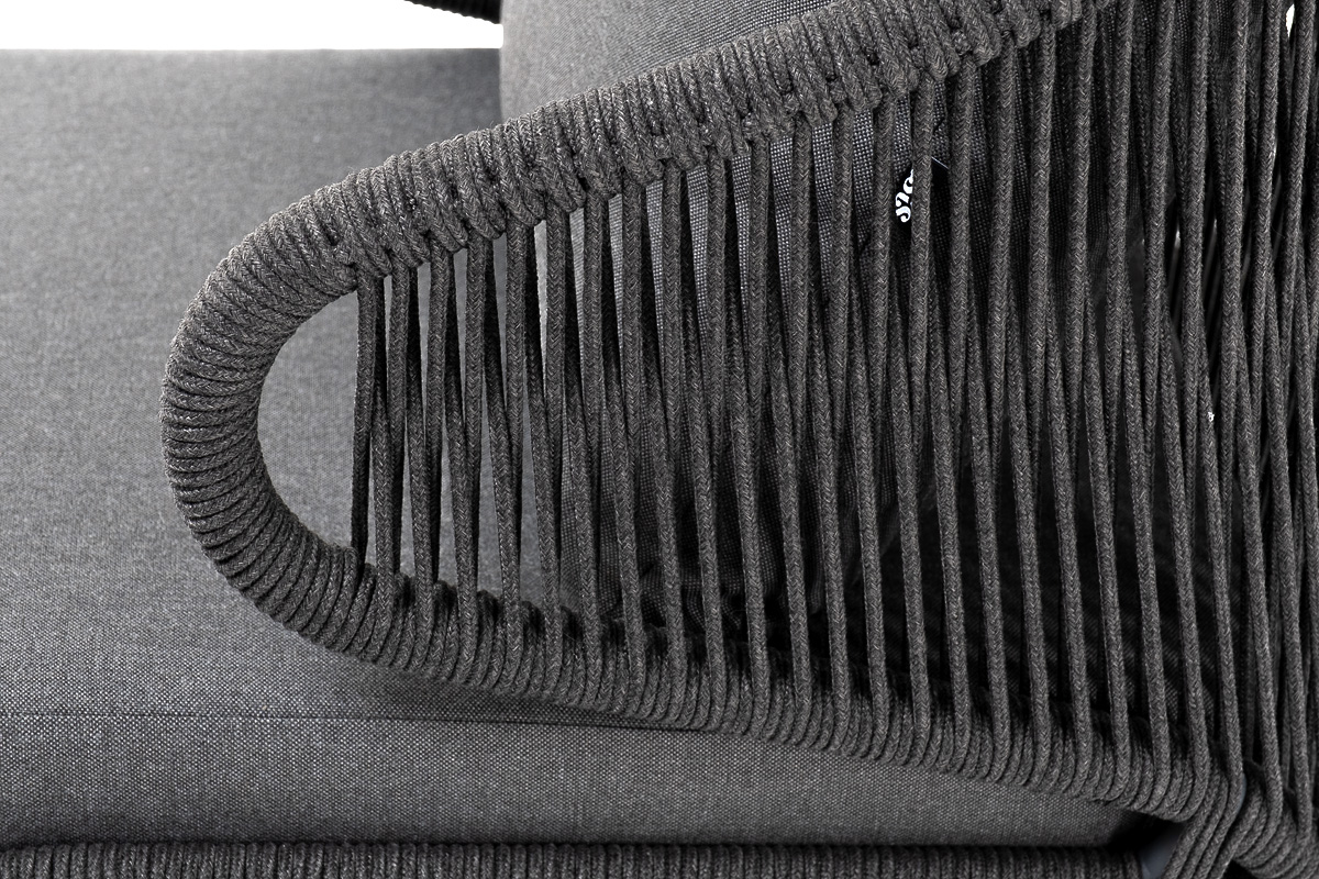 Каркас уличной мебели выполнен из износостойкого алюминия. Его дополняет темно-серая ручная оплетка, изготовленная на основе эластичных синтетических лент из полиэфирных волокон высокой прочности (роупа).