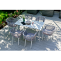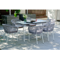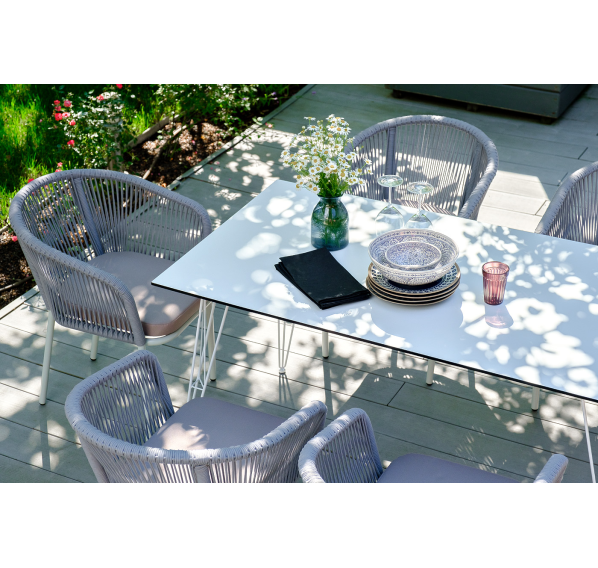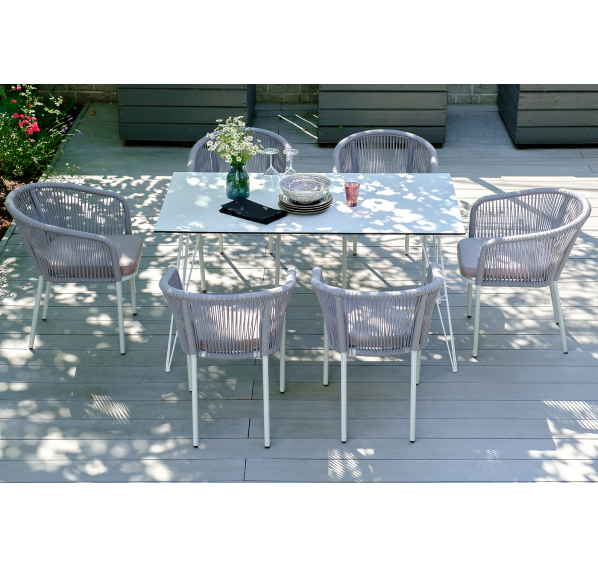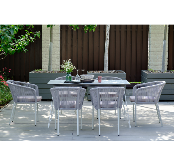 Каркас стульев белого цвета - алюминиевый, оплетен вручную современным материалом - роупом светло-серого оттенка. Это эластичные синтетические ленты из высокопрочных полиэфирных волокон. В комплект входят подушки со съёмными водоотталкивающими чехлами.