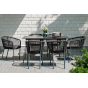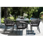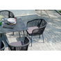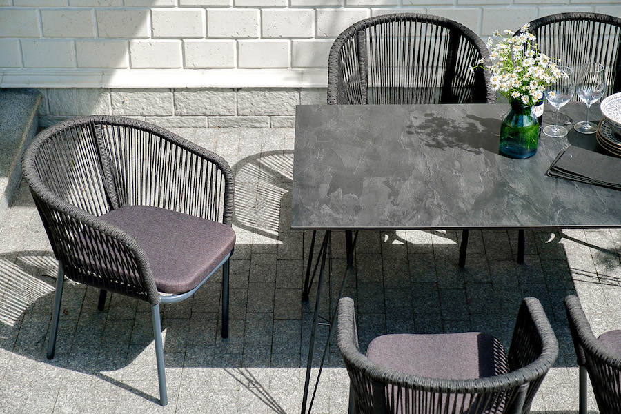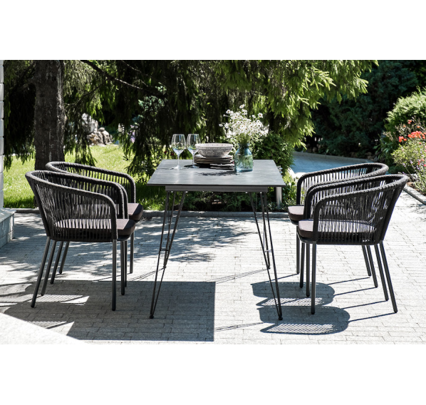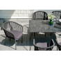 Каркас стульев - алюминиевый, оплетен вручную современным материалом - роупом. Это эластичные синтетические ленты из высокопрочных полиэфирных волокон. В комплект входят подушки со съёмными водоотталкивающими чехлами серого цвета.