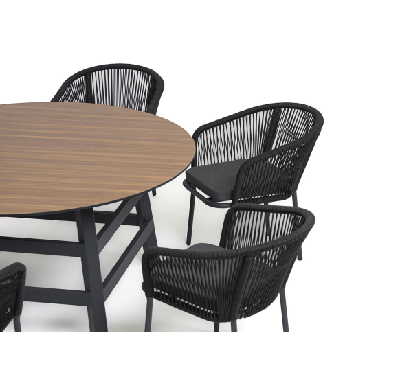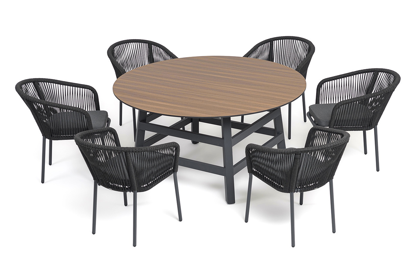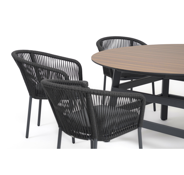 - 6 плетеных стульев «Марсель» из роупа, размером - 570×620×775 мм, цвет роупа - темно-серый, каркас из алюминия, окрашен порошковой краской в темно-серый оттенок.