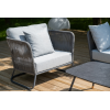 Кресло имеет алюминиевый каркас, окрашенный порошковой краской в темно-серый (RAL7024) цвет. Боковины каркаса вручную оплетены роупом - эластичными синтетическими лентами, изготовленными из высокопрочных полиэфирных волокон. Цвет оплетки - серый.