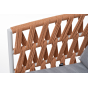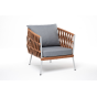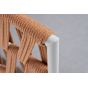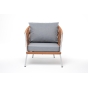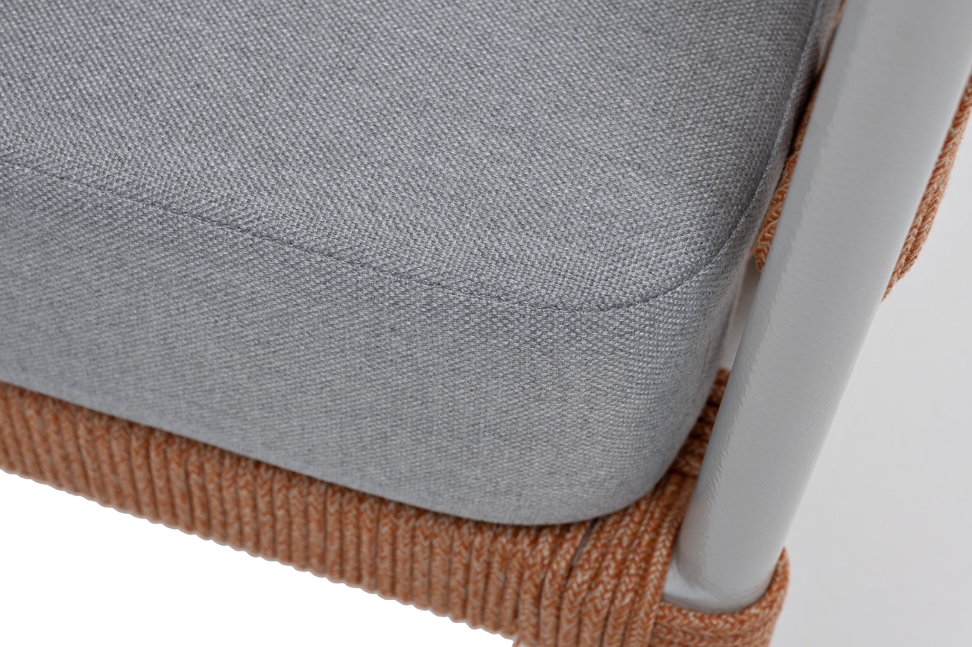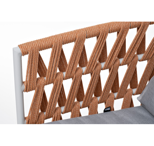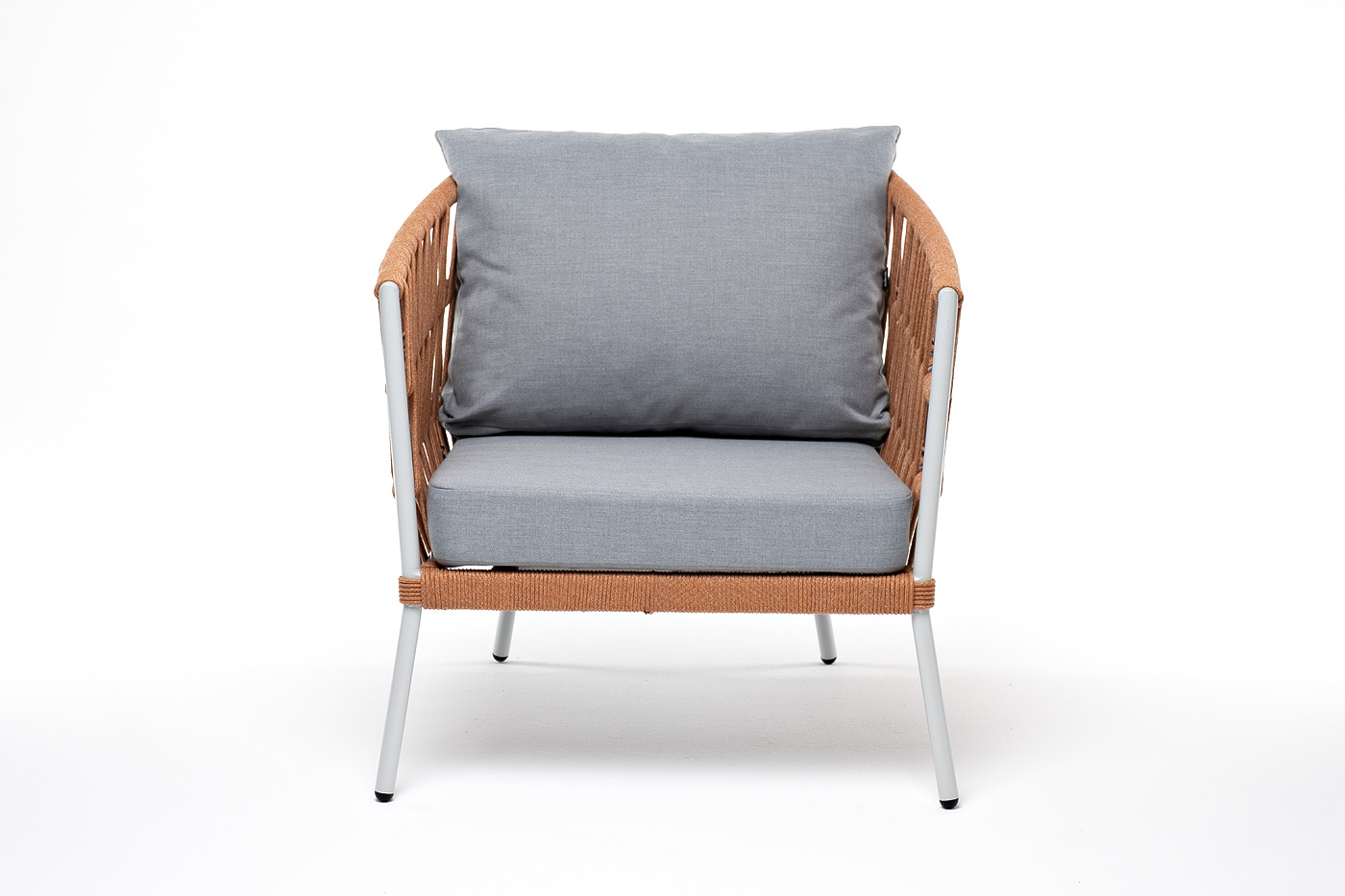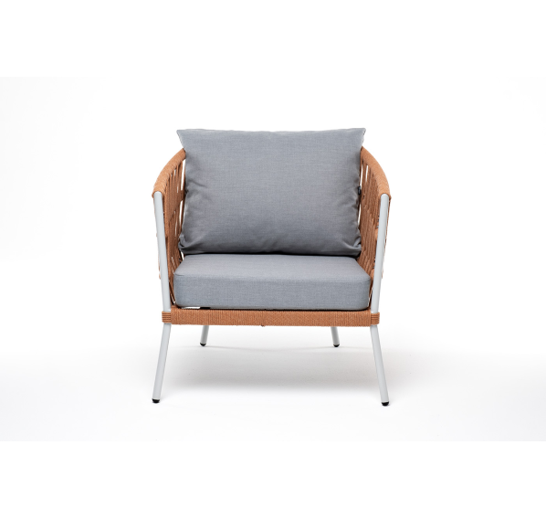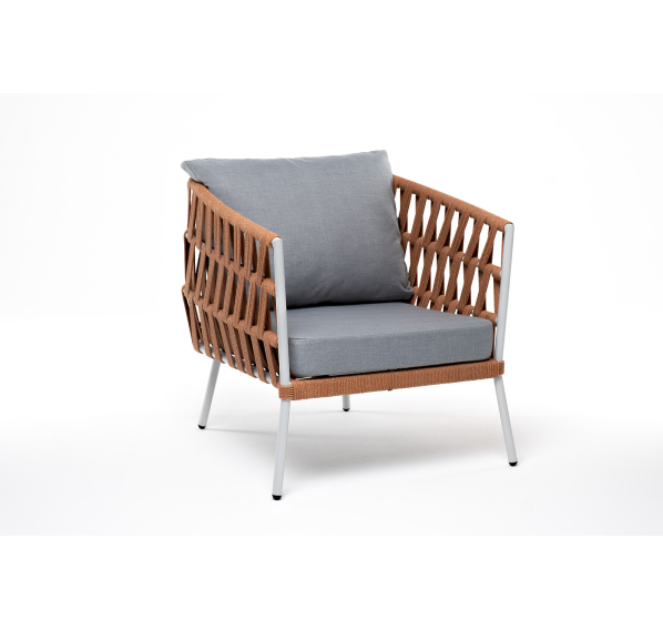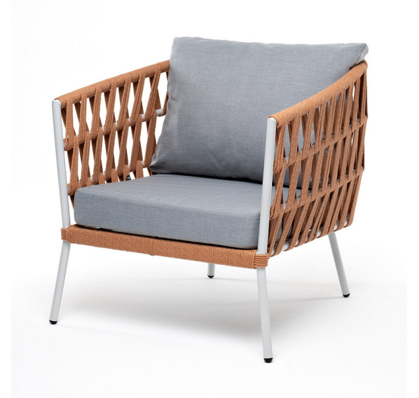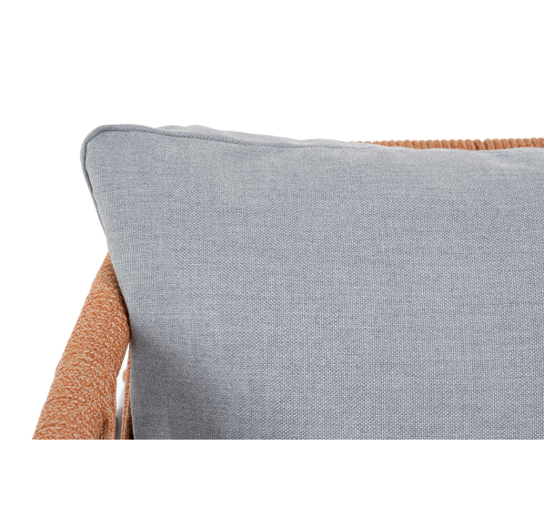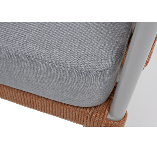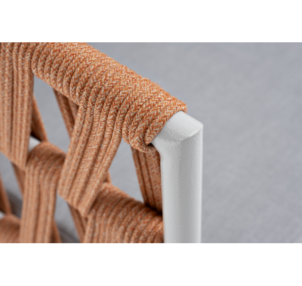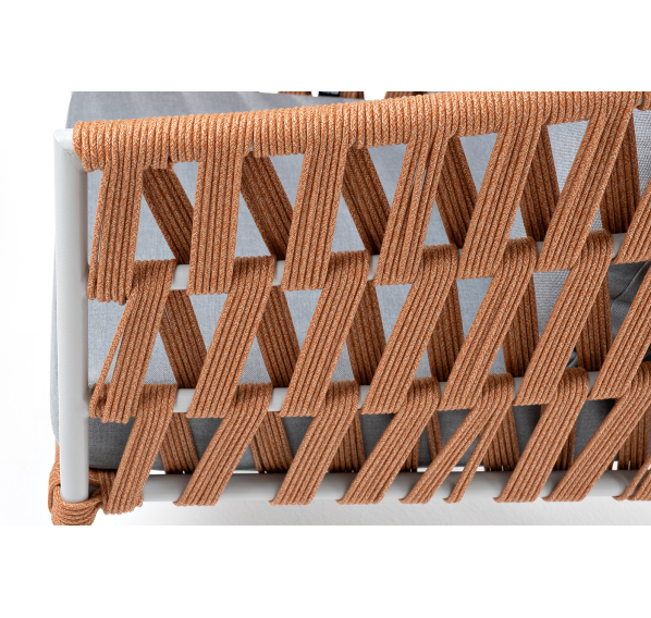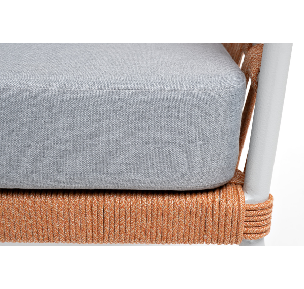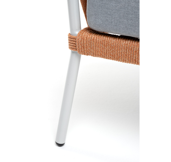 Кресло имеет алюминиевый каркас, окрашенный порошковой краской в светло-серый (RAL7035) цвет. Боковины каркаса вручную оплетены роупом - эластичными синтетическими лентами, изготовленными из высокопрочных полиэфирных волокон. Цвет оплетки - оранжевый меланж.