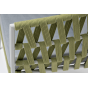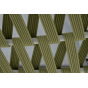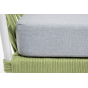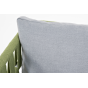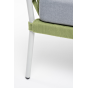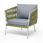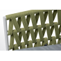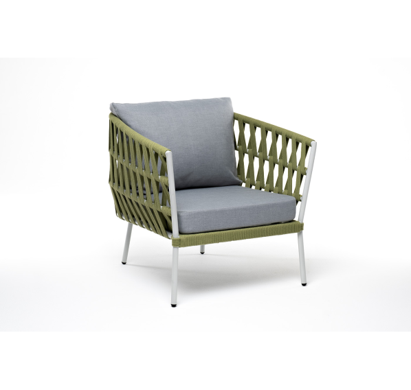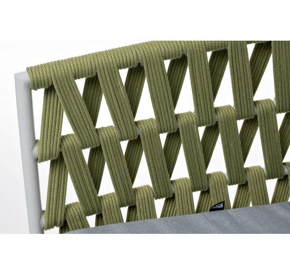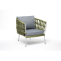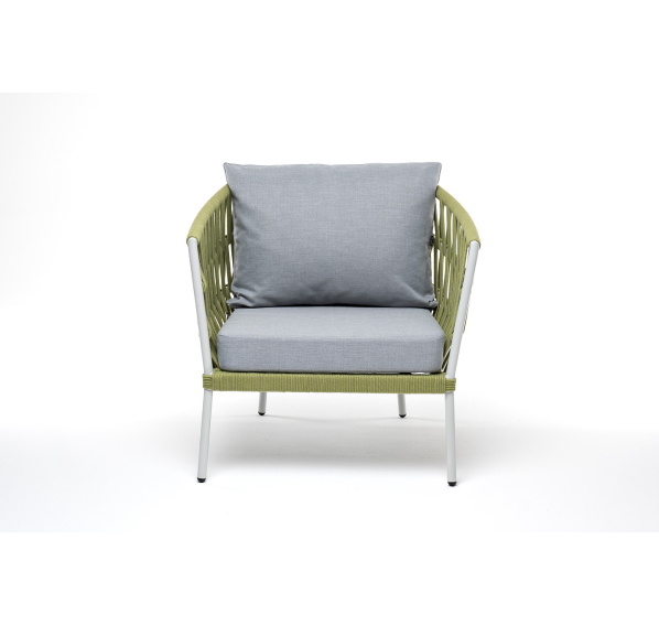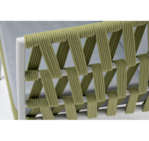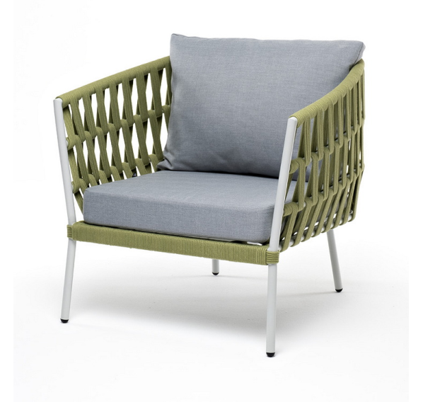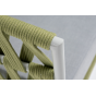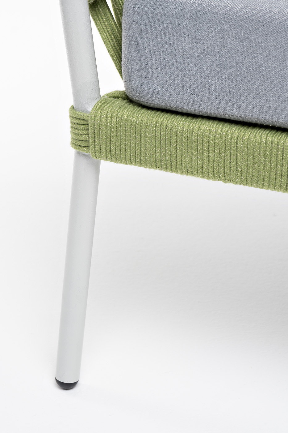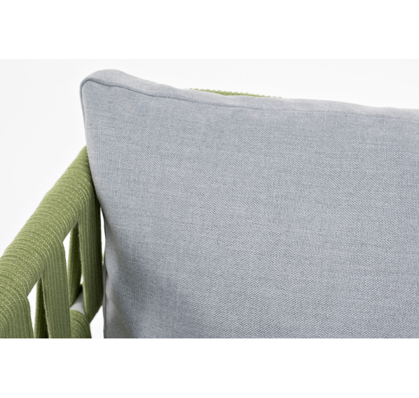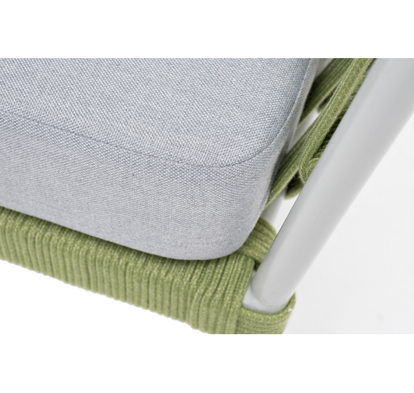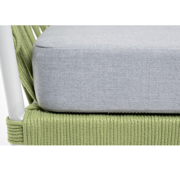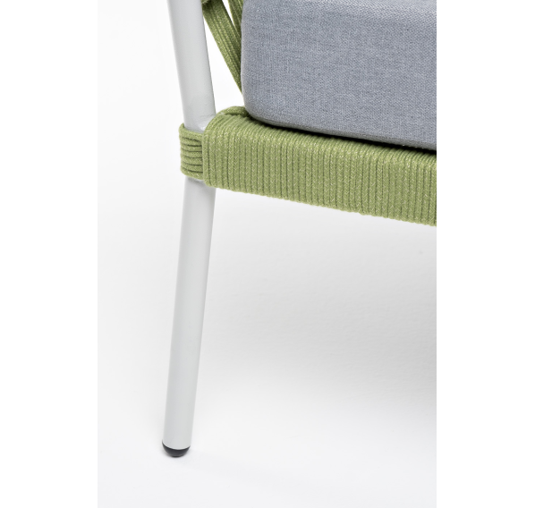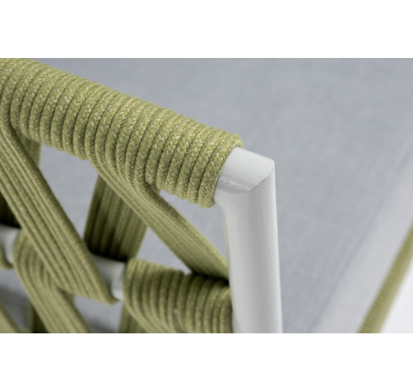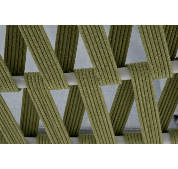 Кресло имеет алюминиевый каркас, окрашенный порошковой краской в светло-серый (RAL7035) цвет. Боковины каркаса вручную оплетены роупом - эластичными синтетическими лентами, изготовленными из высокопрочных полиэфирных волокон. Цвет оплетки - салатовый меланж.