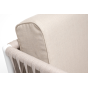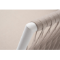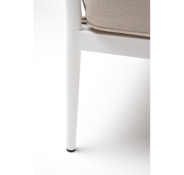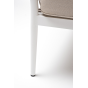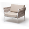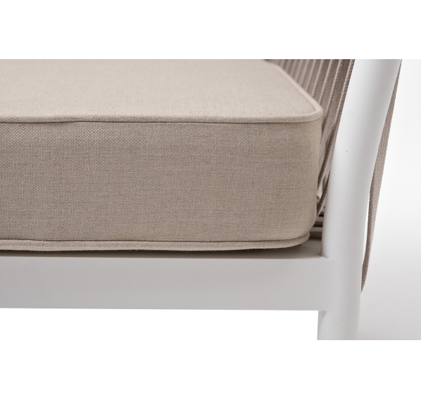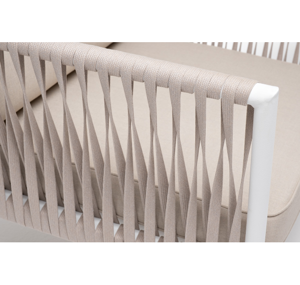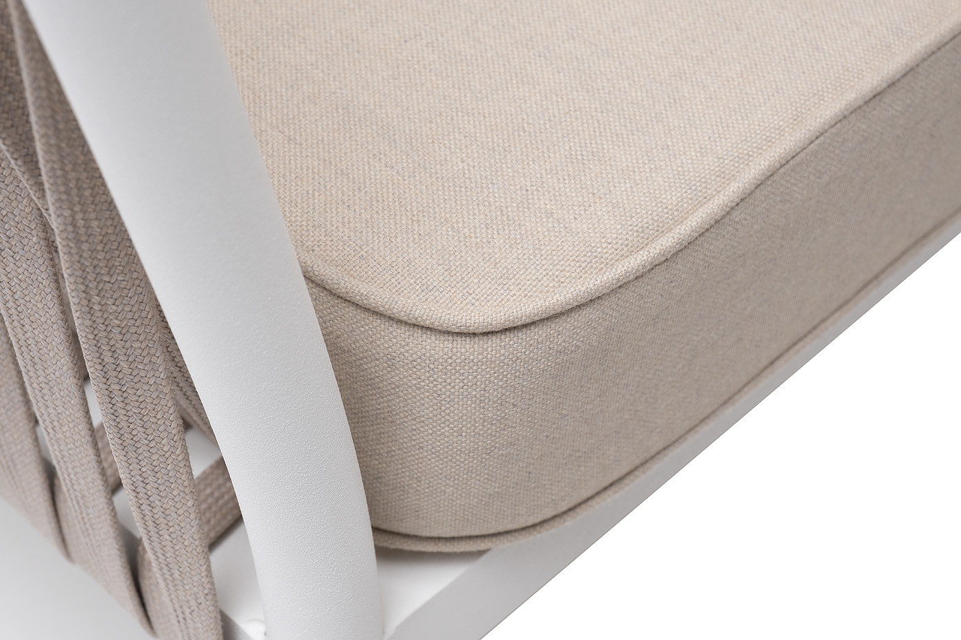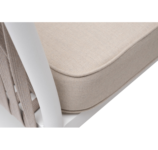 Кресло имеет алюминиевый каркас, окрашенный порошковой краской белового цвет. Боковины каркаса вручную оплетены роупом - эластичными синтетическими лентами, изготовленными из высокопрочных полиэфирных волокон. Цвет оплетки - бежевый.