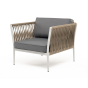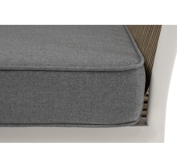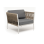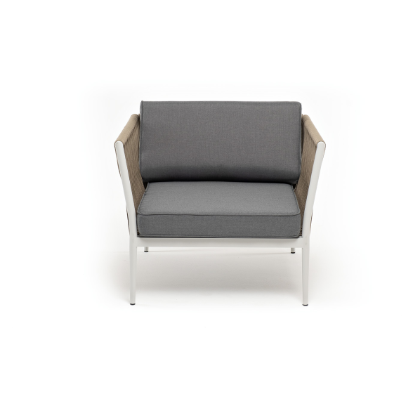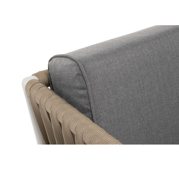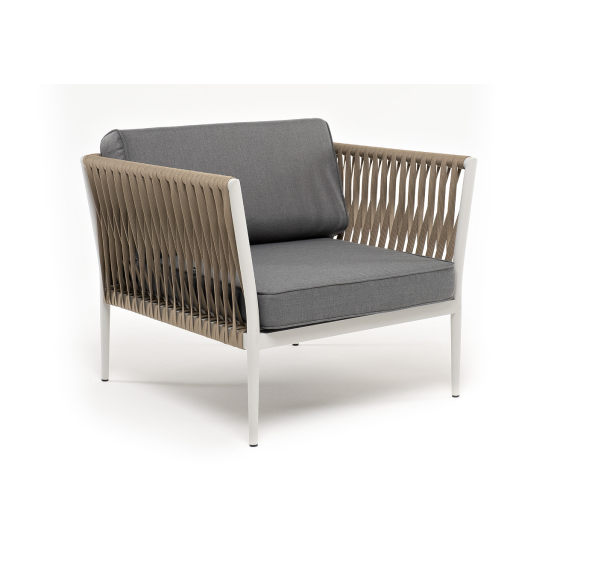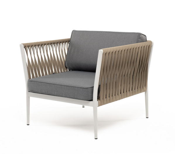 Кресло имеет алюминиевый каркас, окрашенный порошковой краской в светло-серый (RAL7035) цвет. Боковины каркаса вручную оплетены роупом - эластичными синтетическими лентами, изготовленными из высокопрочных полиэфирных волокон. Цвет оплетки - серо-коричневый.
