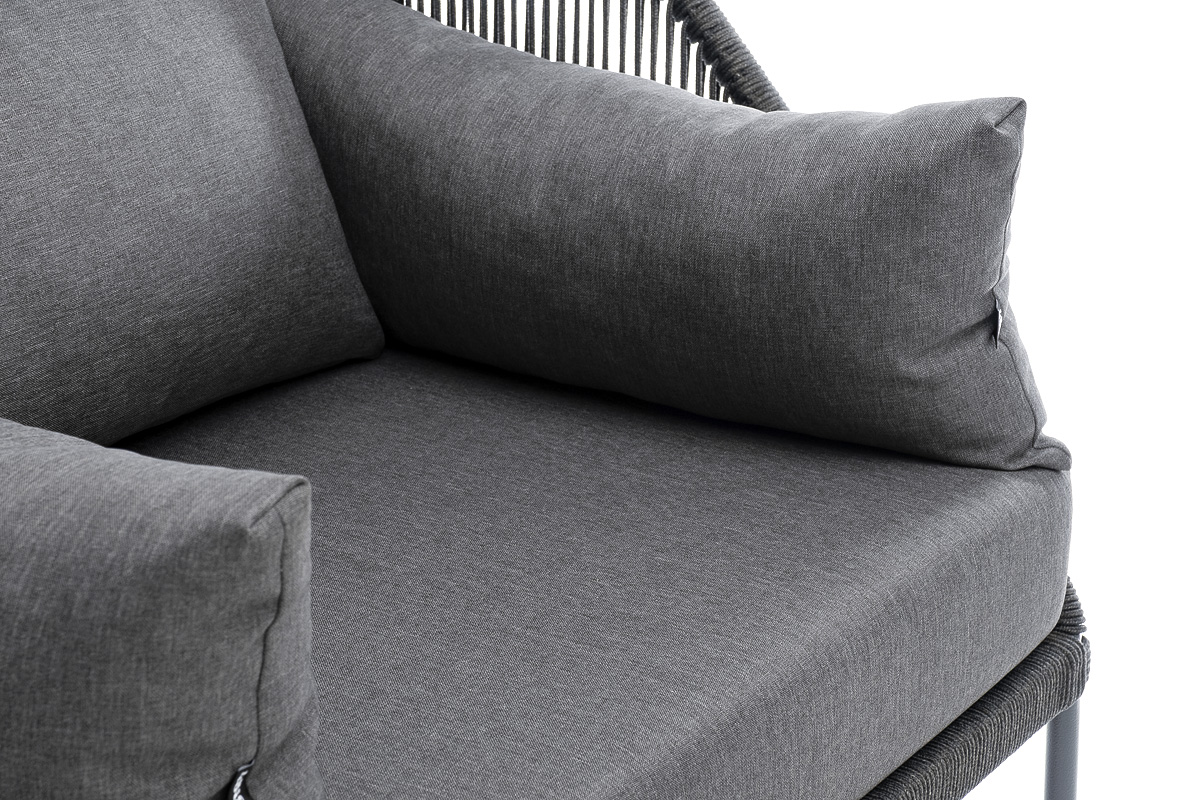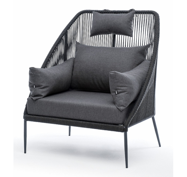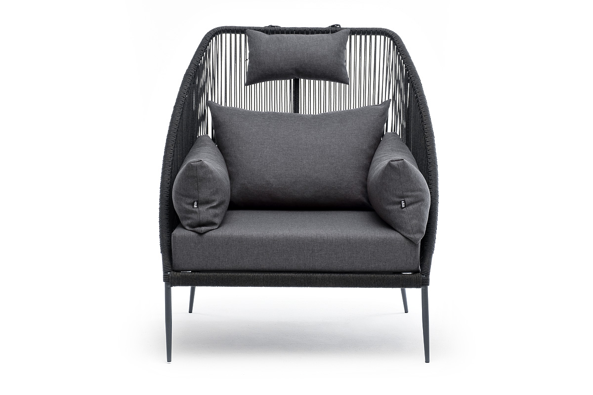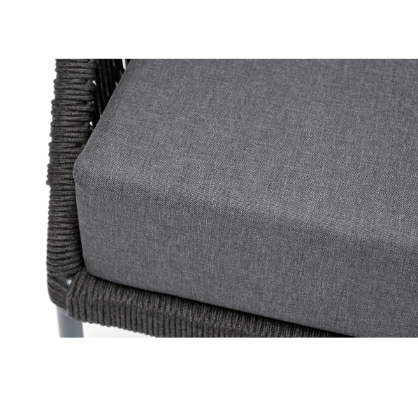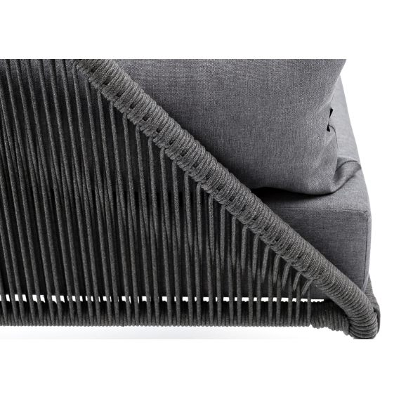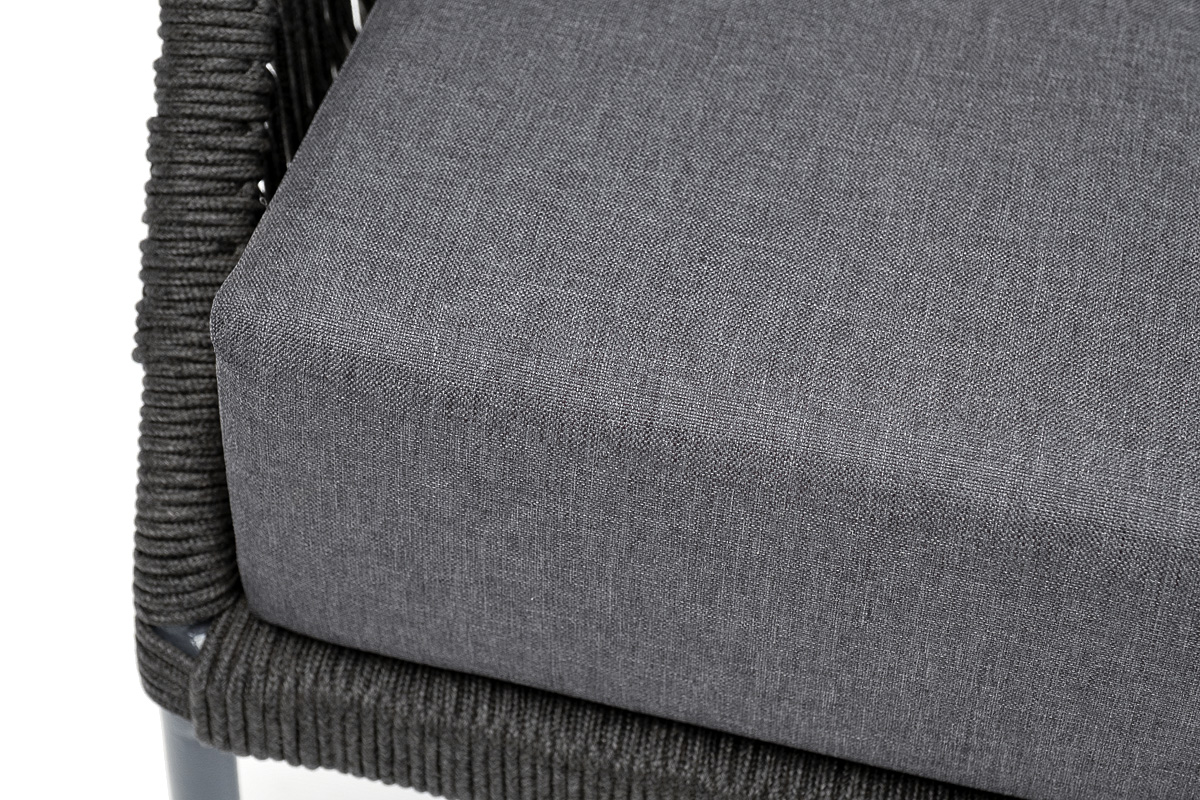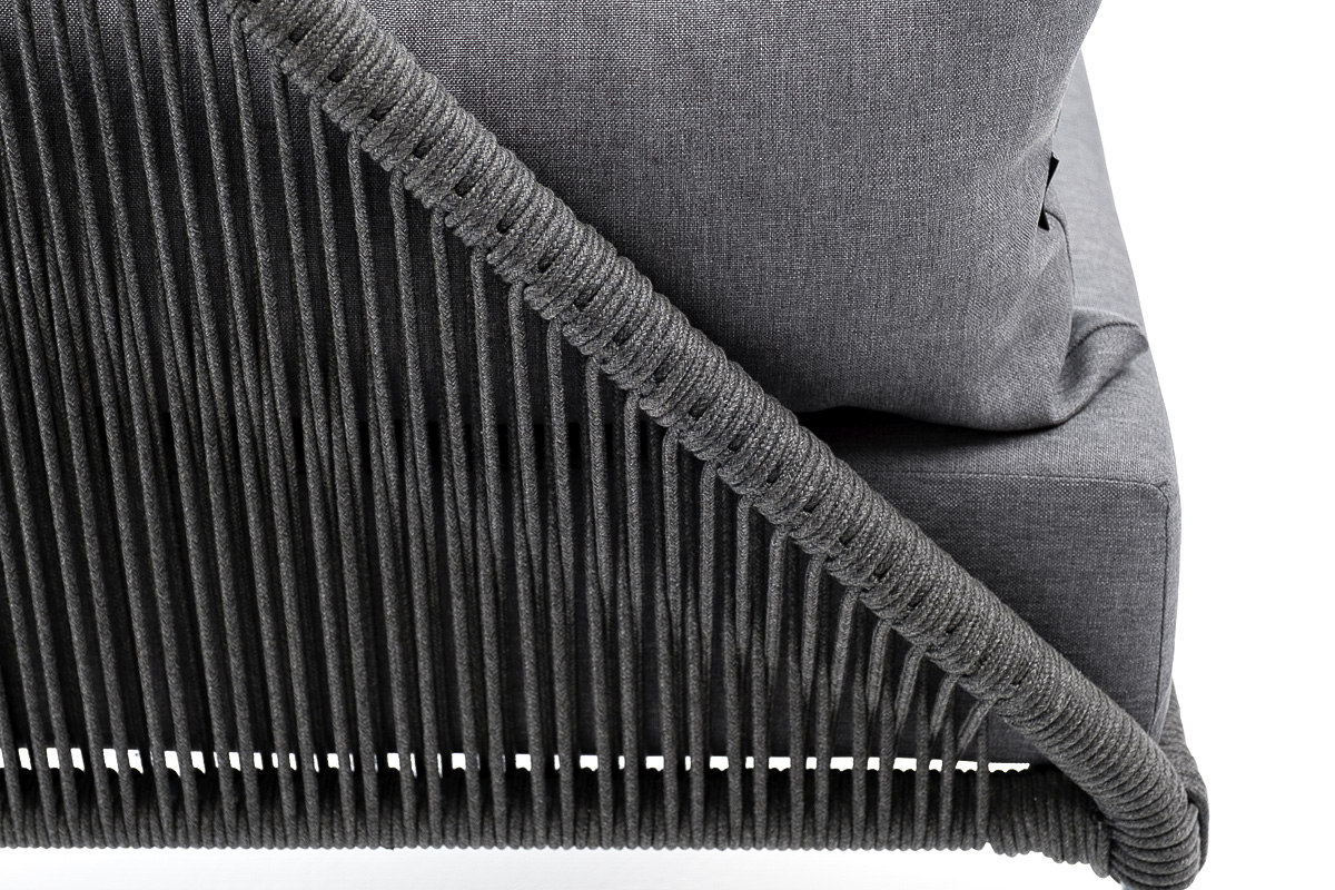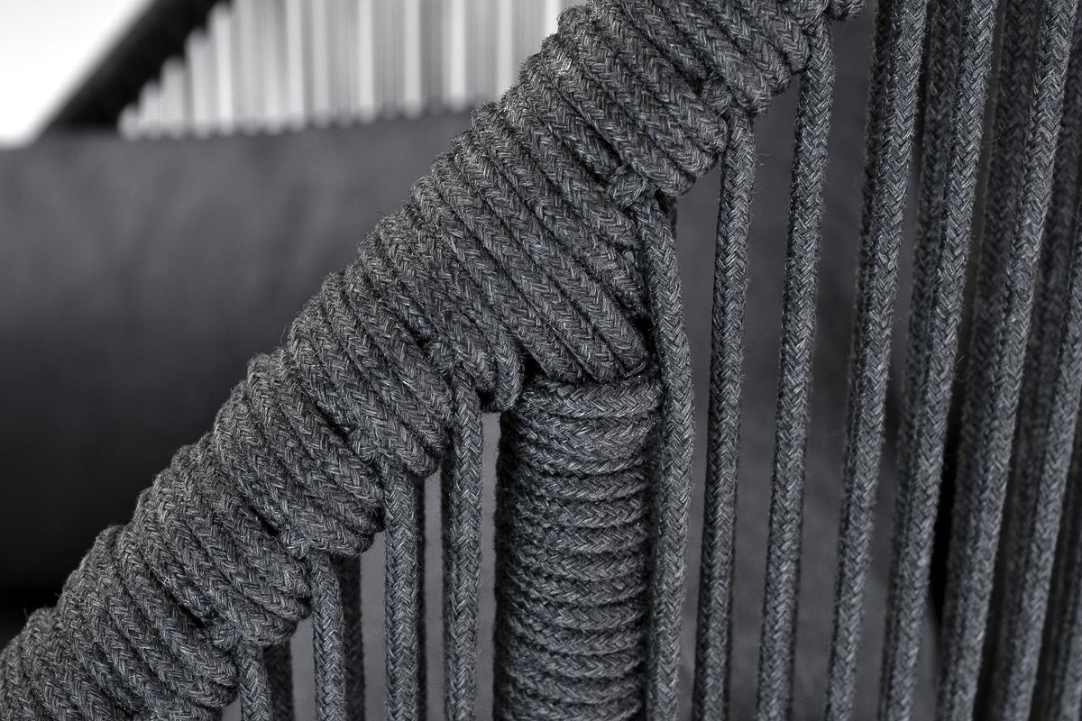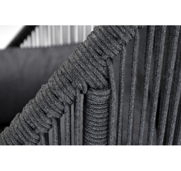 Кресло имеет алюминиевый каркас, окрашенный порошковой краской в темно-серый (RAL7024) цвет. Боковины каркаса вручную оплетены роупом - эластичными синтетическими лентами, изготовленными из высокопрочных полиэфирных волокон. Цвет оплетки - темно-серый.
